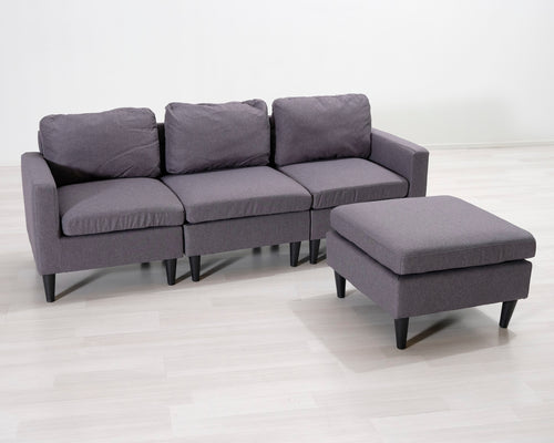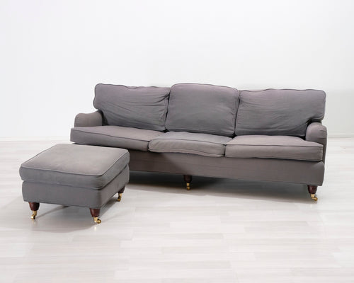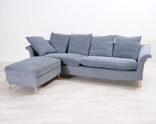 3-istuttava kangassohva ja jalkarahi siniharmaa