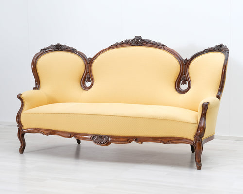 Antiikkinen sohva keltaisella verhoilulla