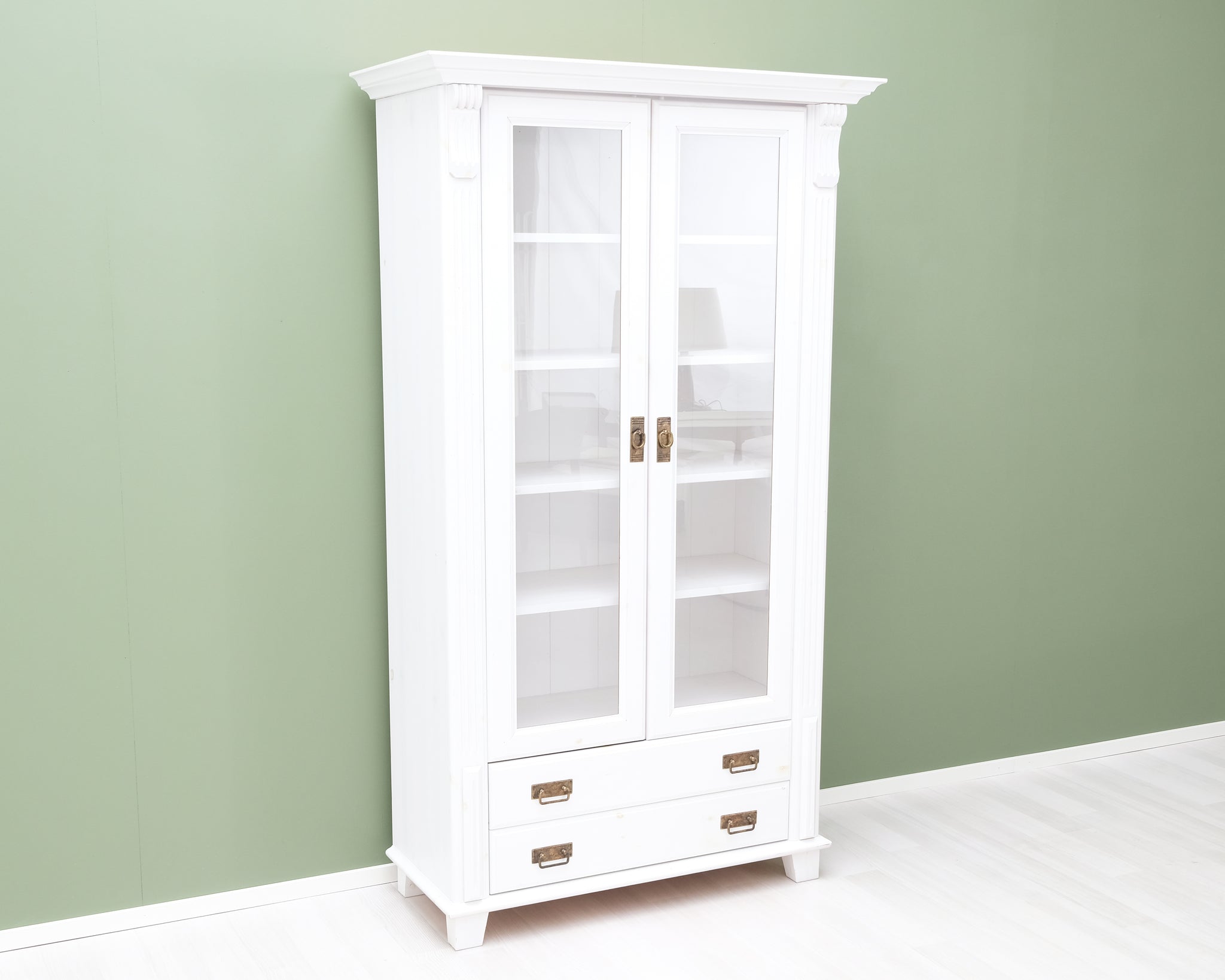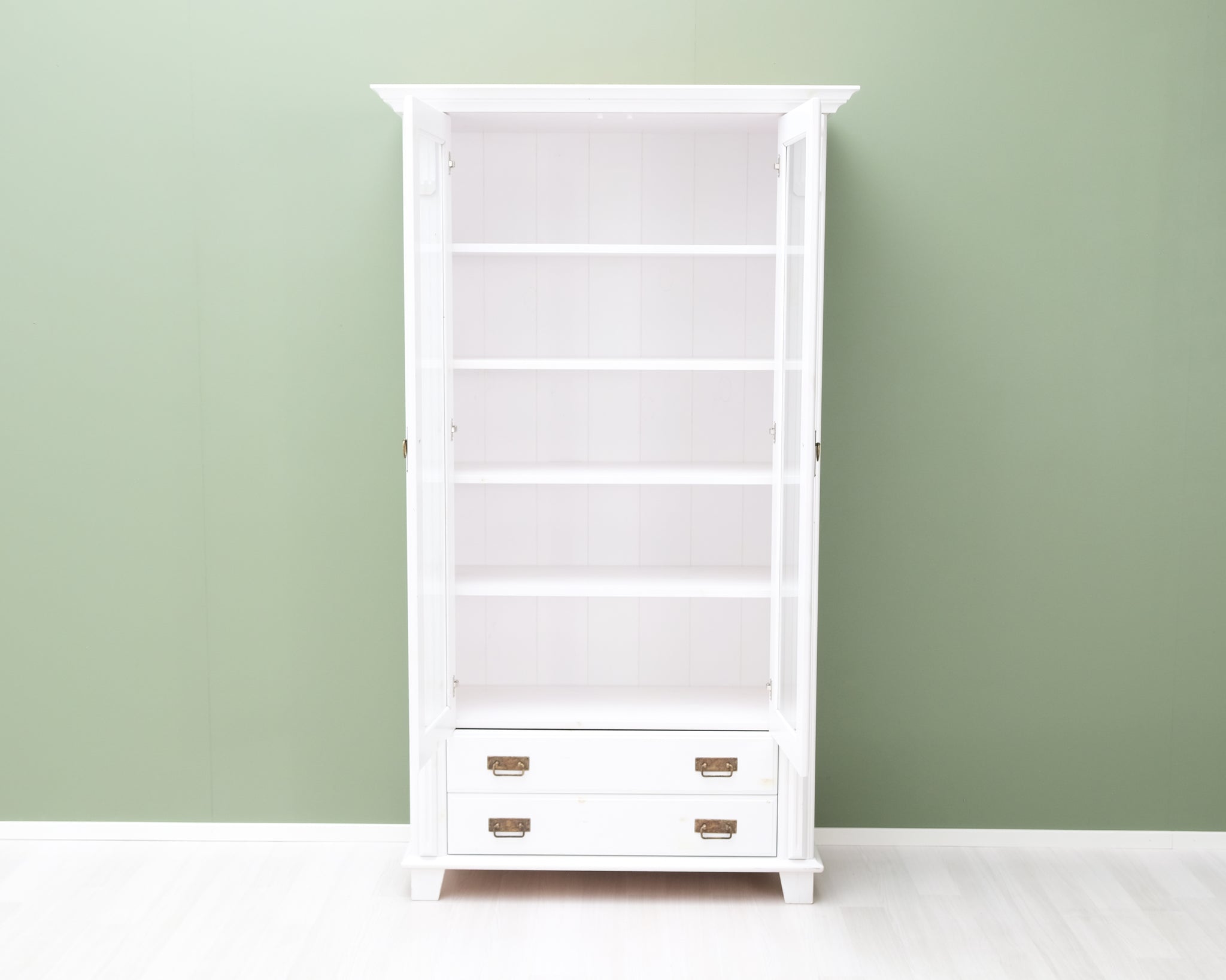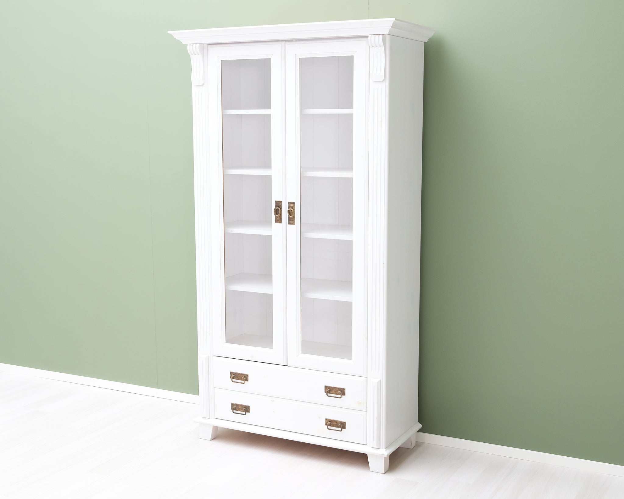 Tyylikäs vitriini valkoisessa värissä ja puisilla yksityiskohdilla. Lasiovet pitävät tavarat kauniisti esillä, mutta pölyttöminä. Paljon säilytystilaa.