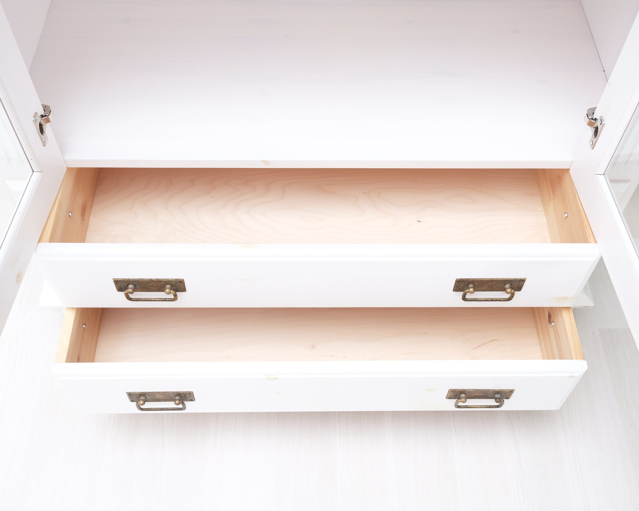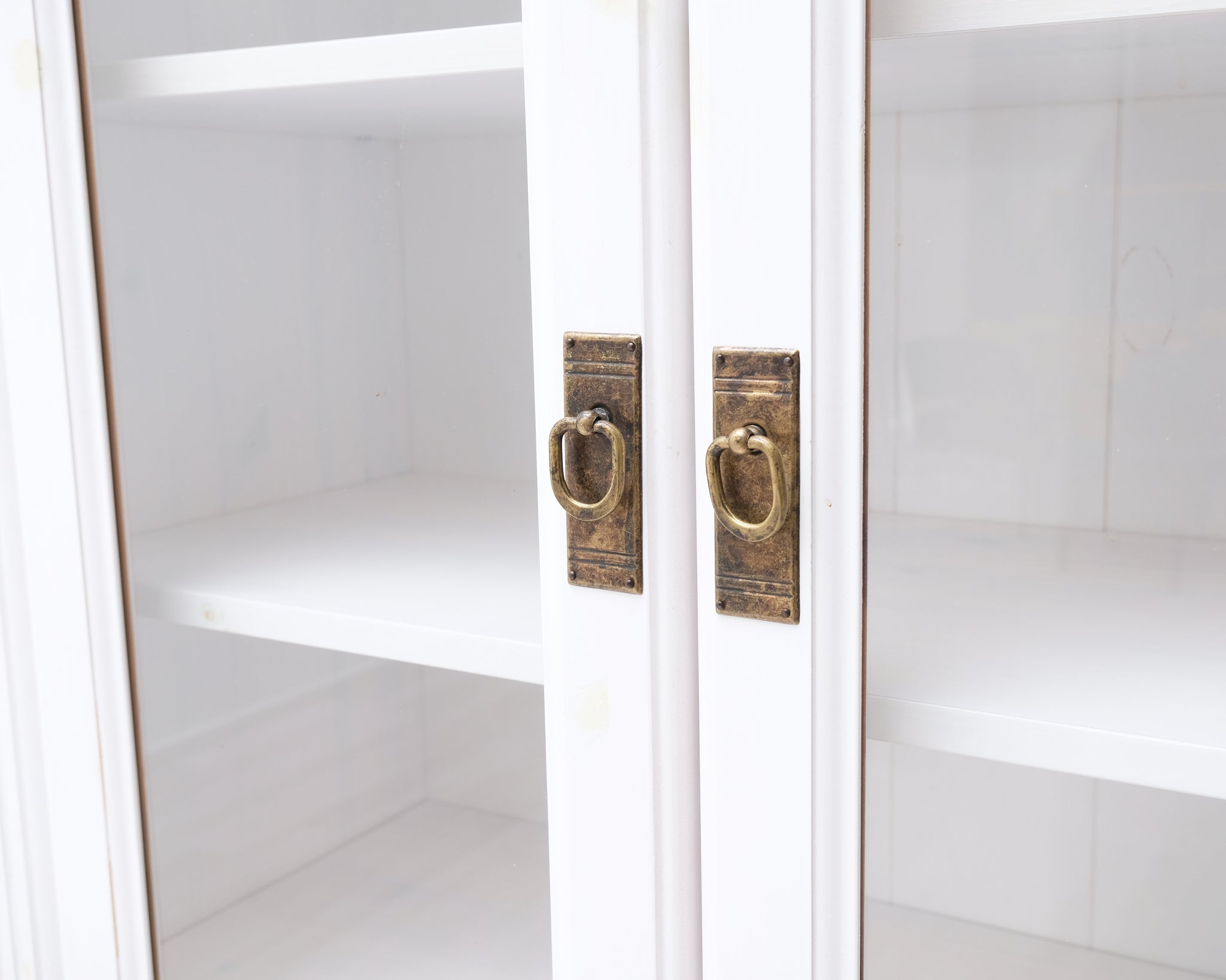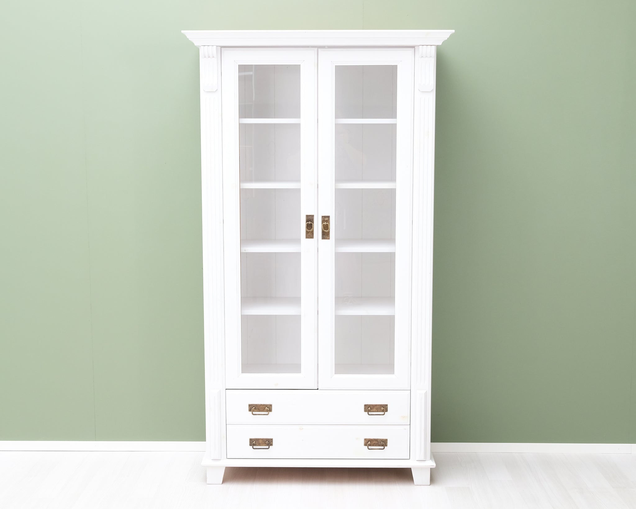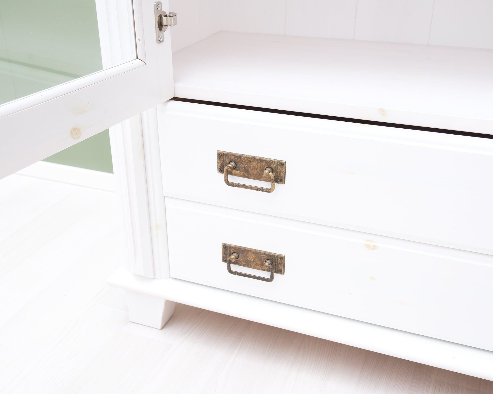 Tyylikäs vitriini valkoisessa värissä ja puisilla yksityiskohdilla. Lasiovet pitävät tavarat kauniisti esillä, mutta pölyttöminä. Paljon säilytystilaa.