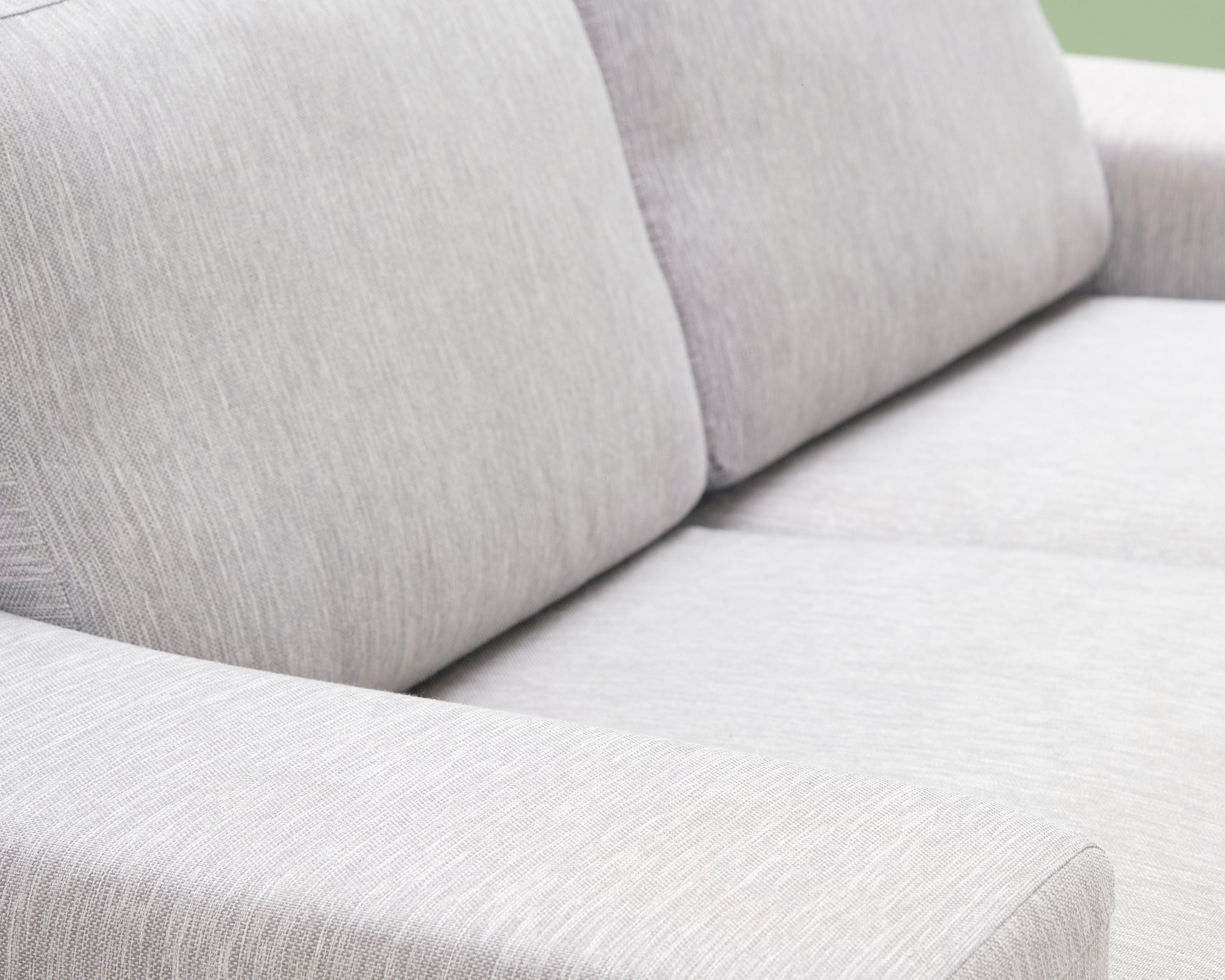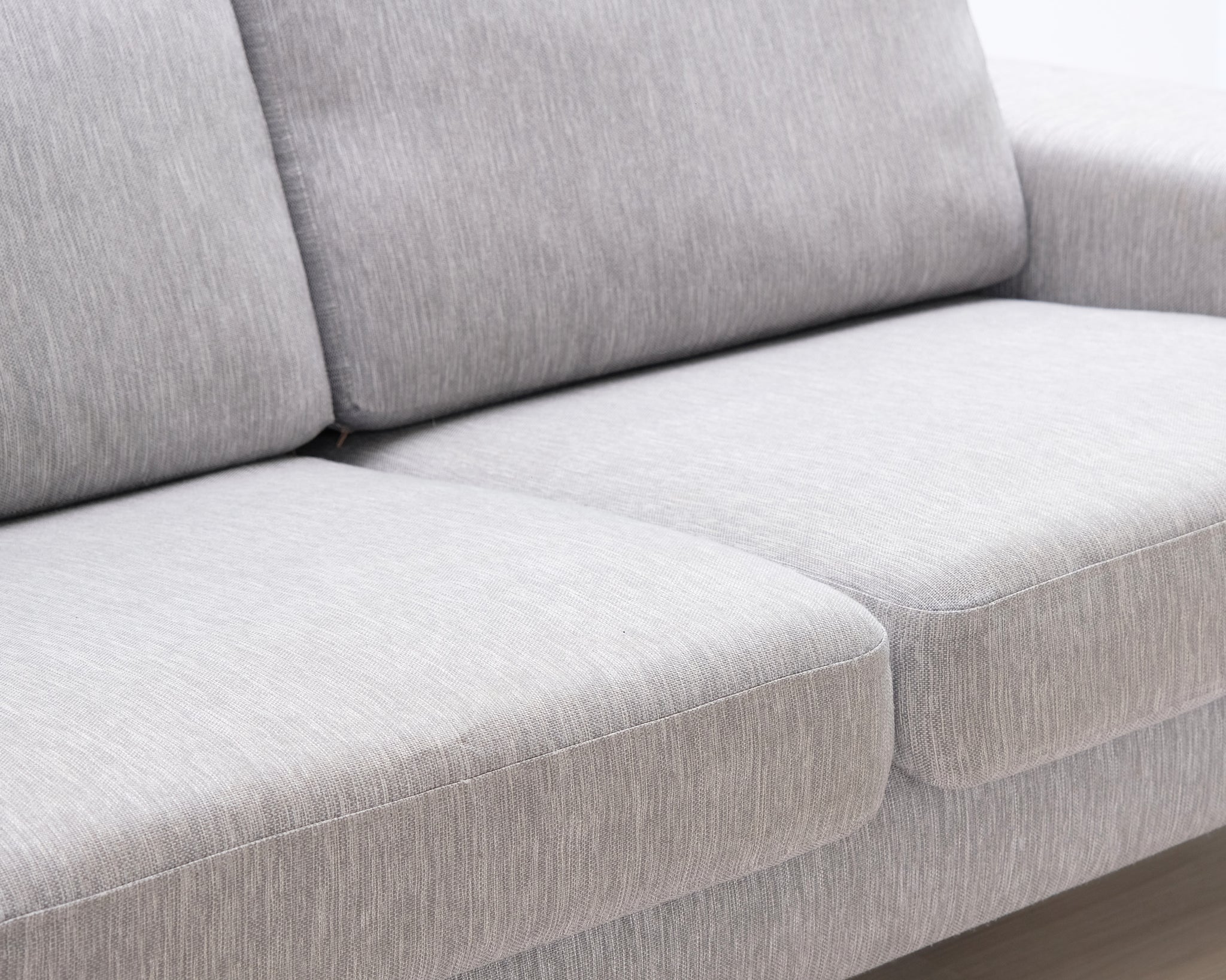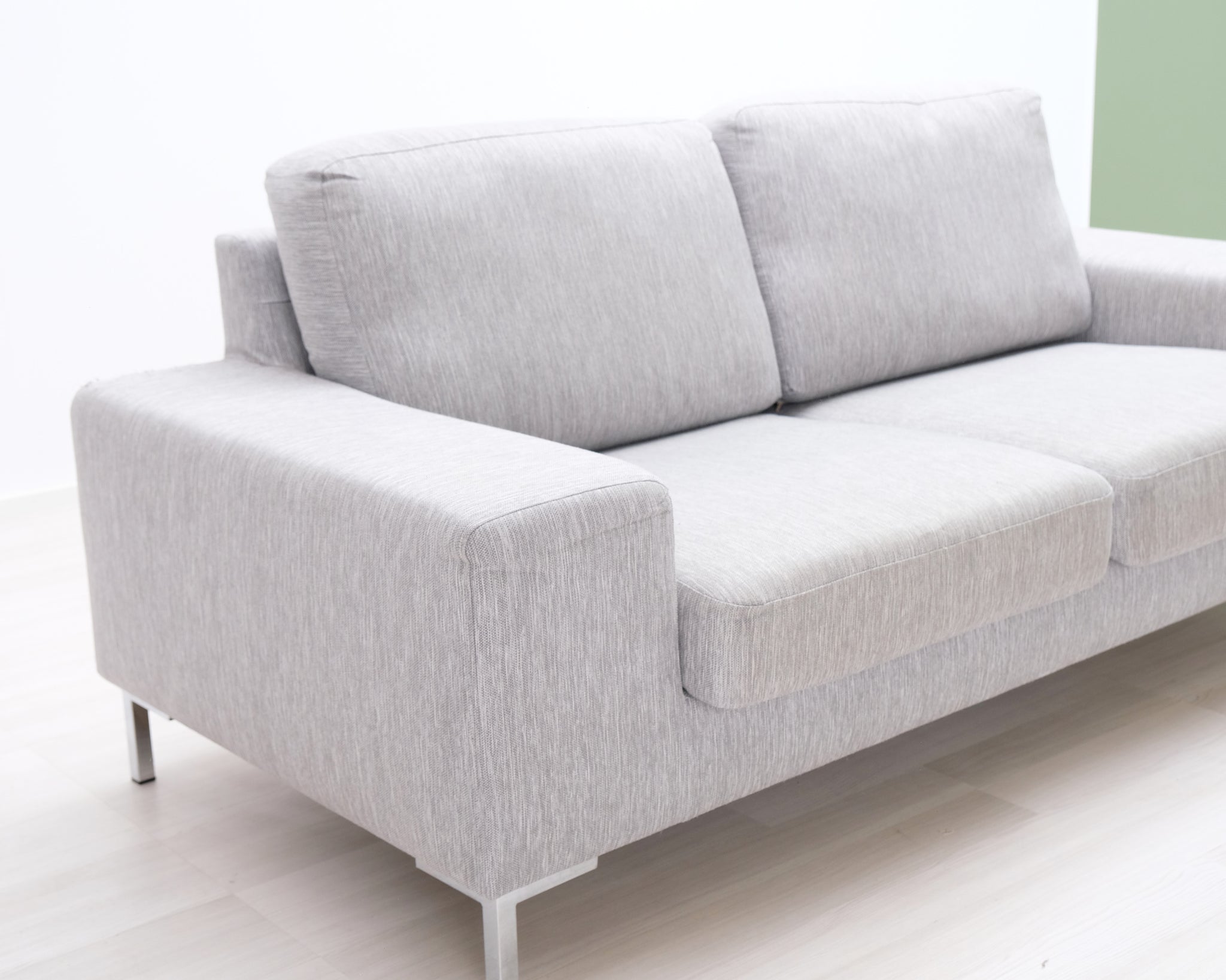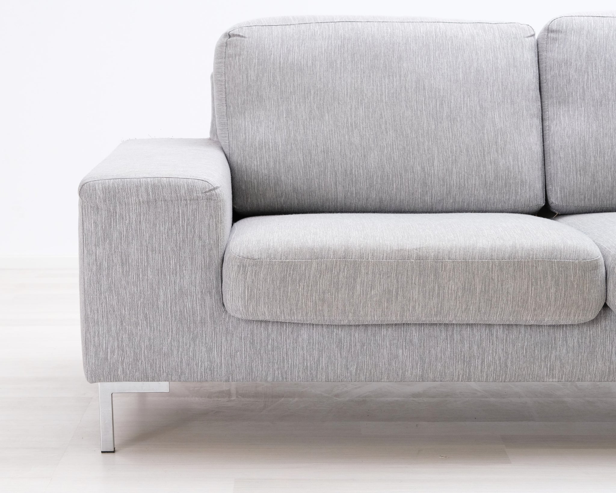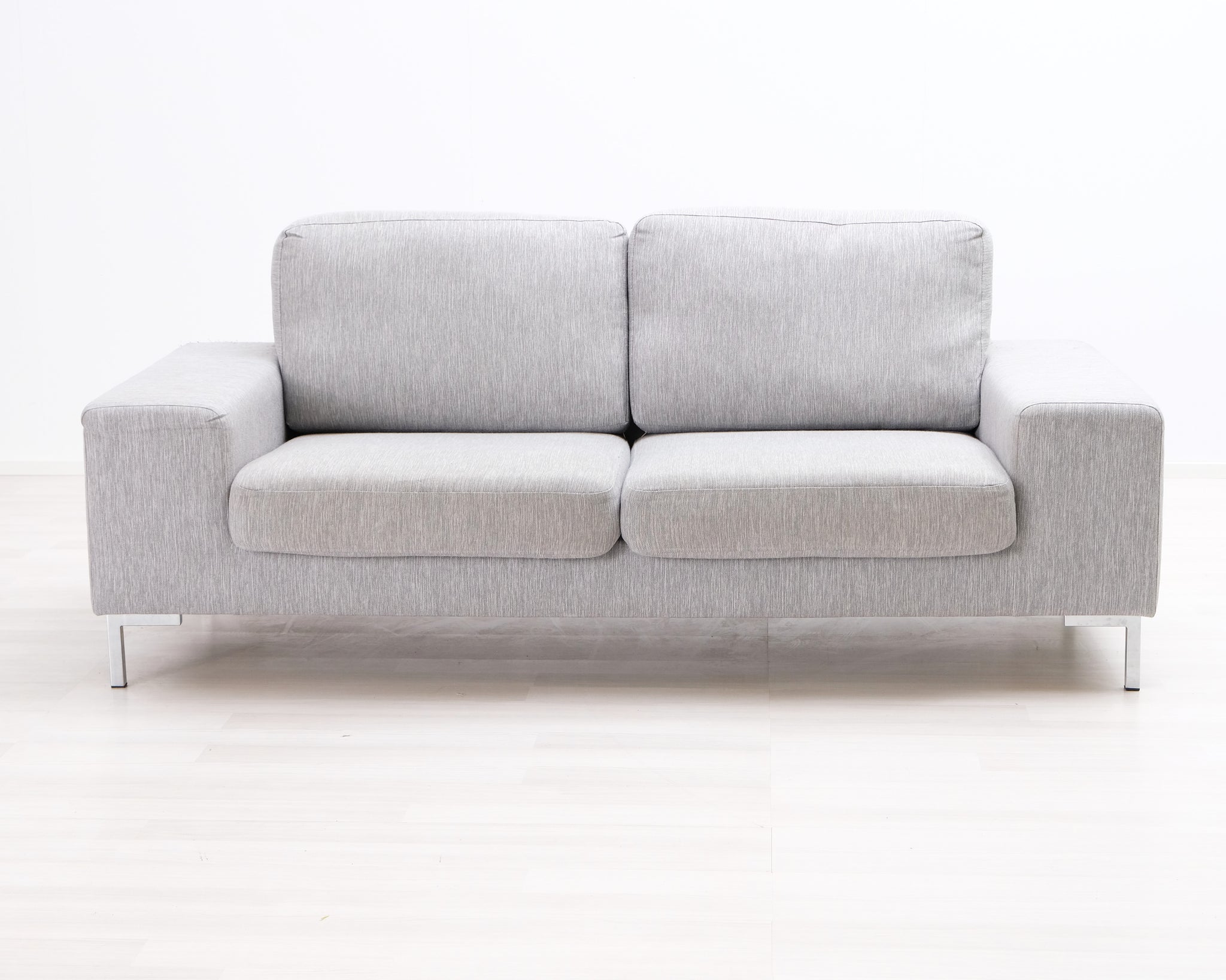 Kapeat jalat antavat sohvalle ilmavuutta. Ryhdikkäät käsinojat ja neutraalin vaaleanharmaa verhoilu.