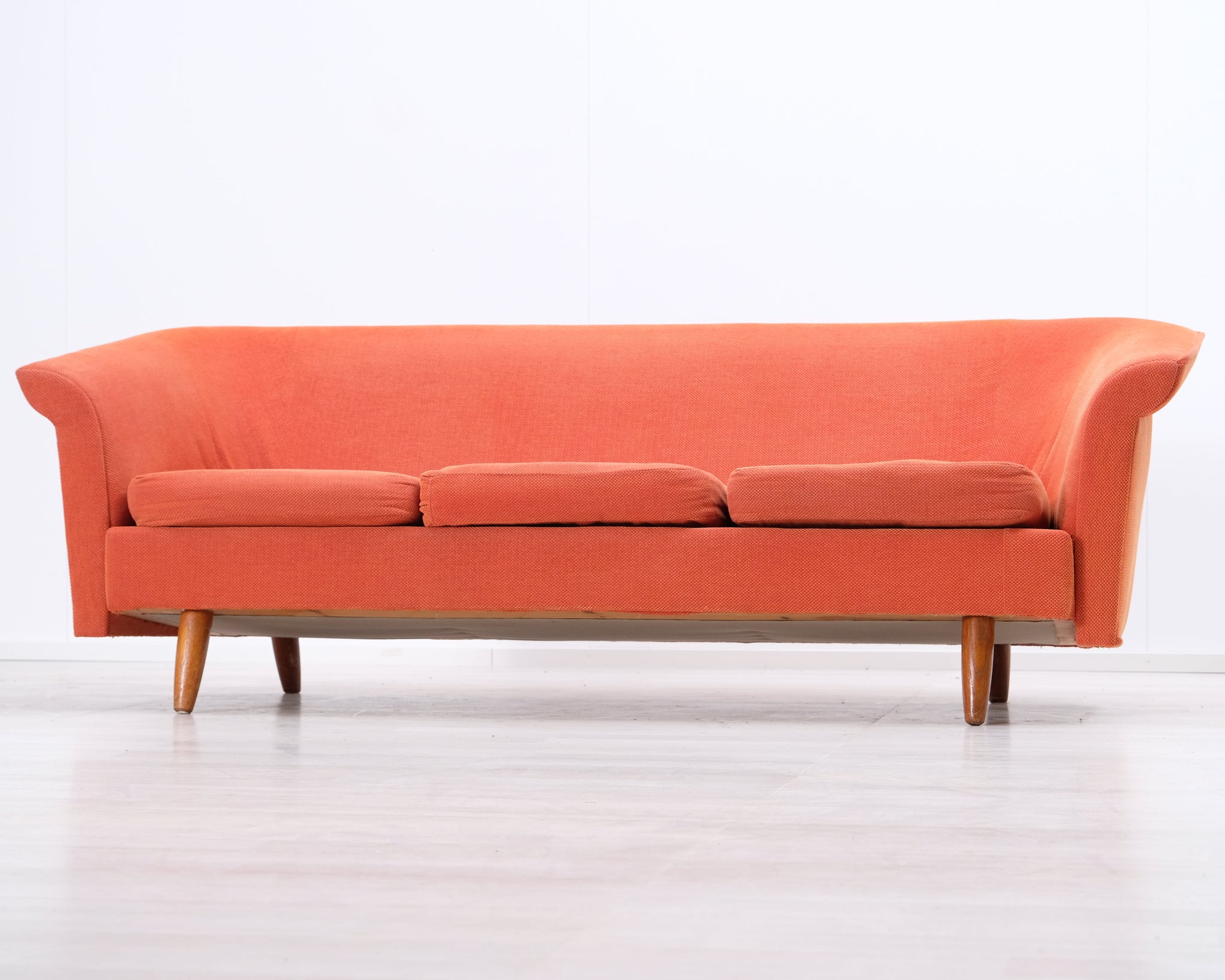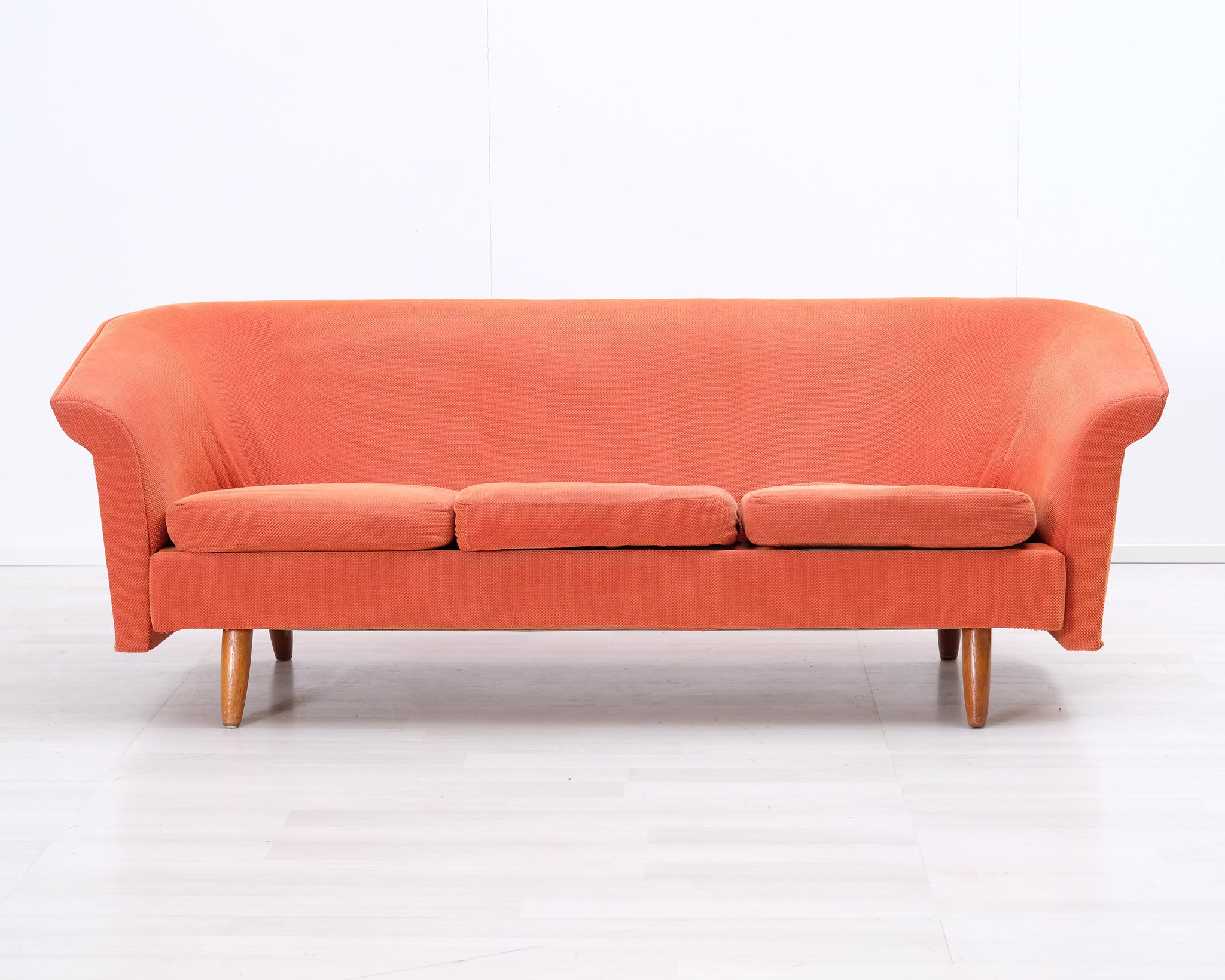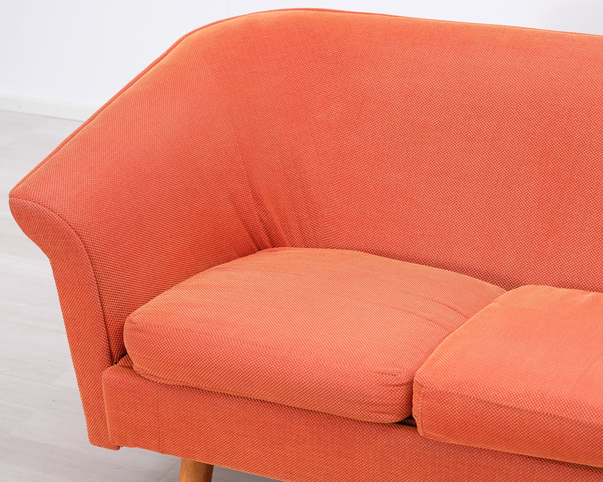 Kolmen istuttava vintage-sohva. Oranssi kangasverhoilu.