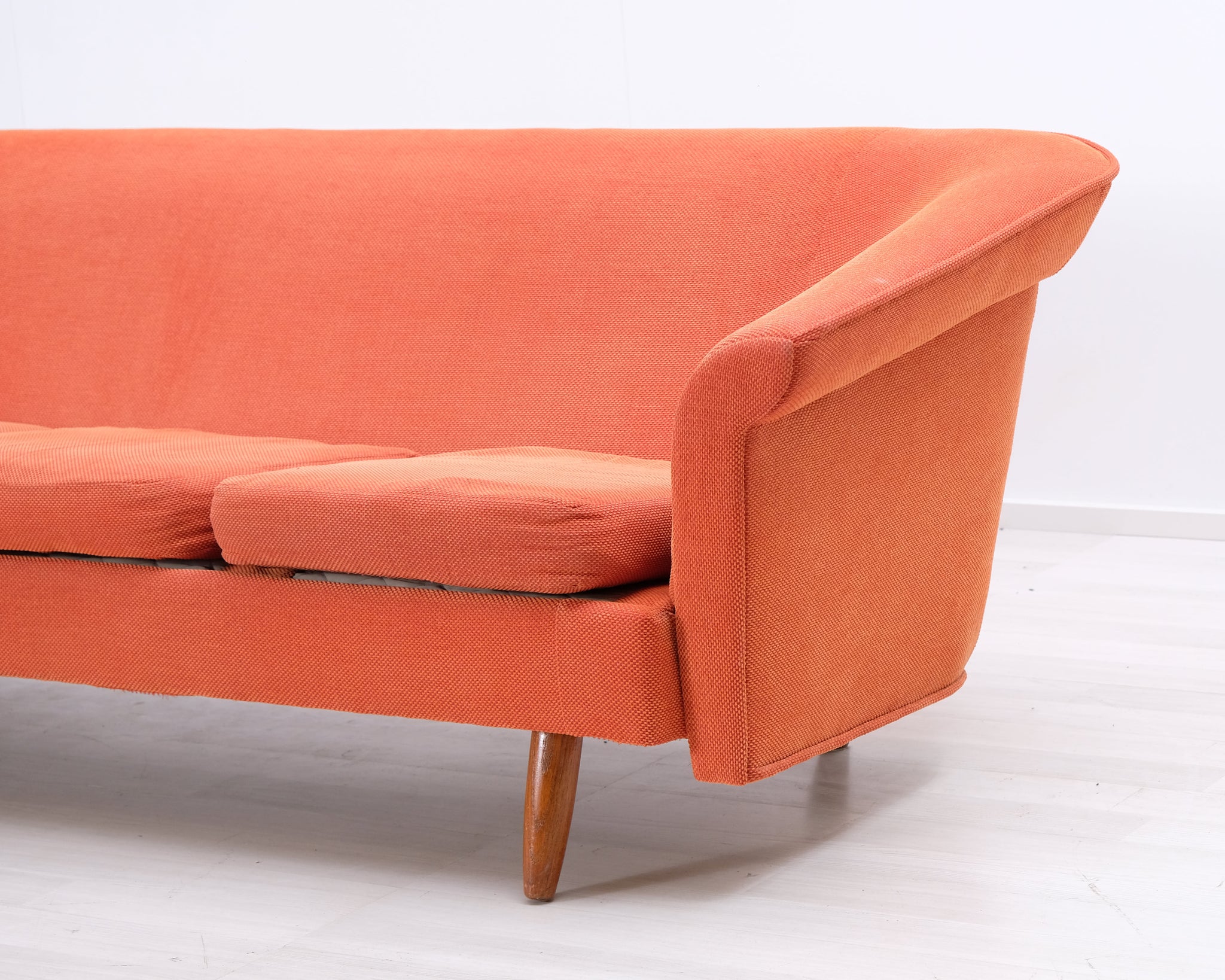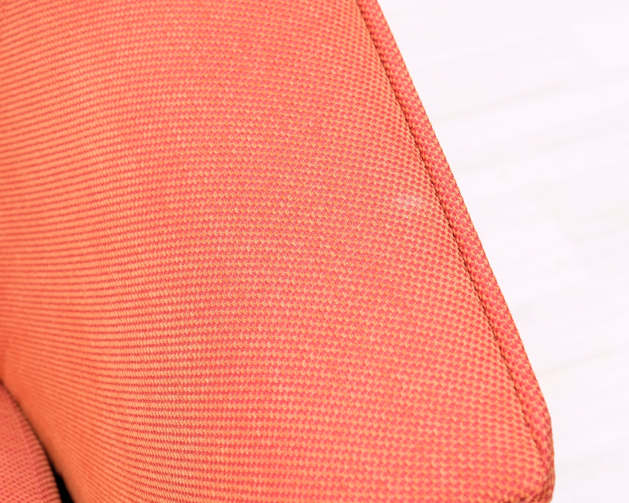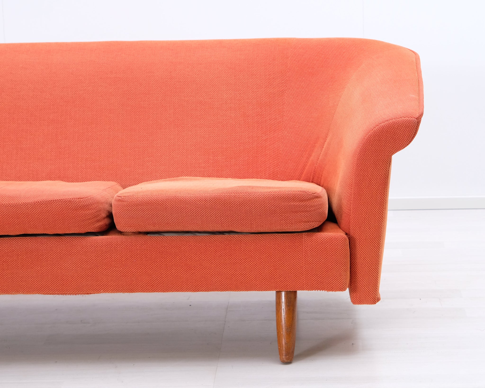 Kolmen istuttava vintage-sohva. Oranssi kangasverhoilu.