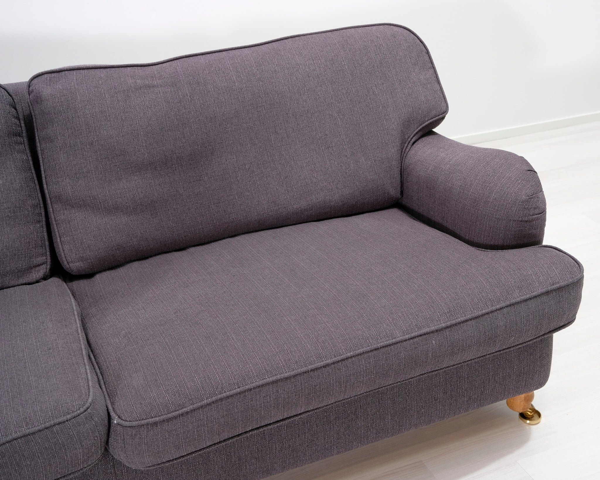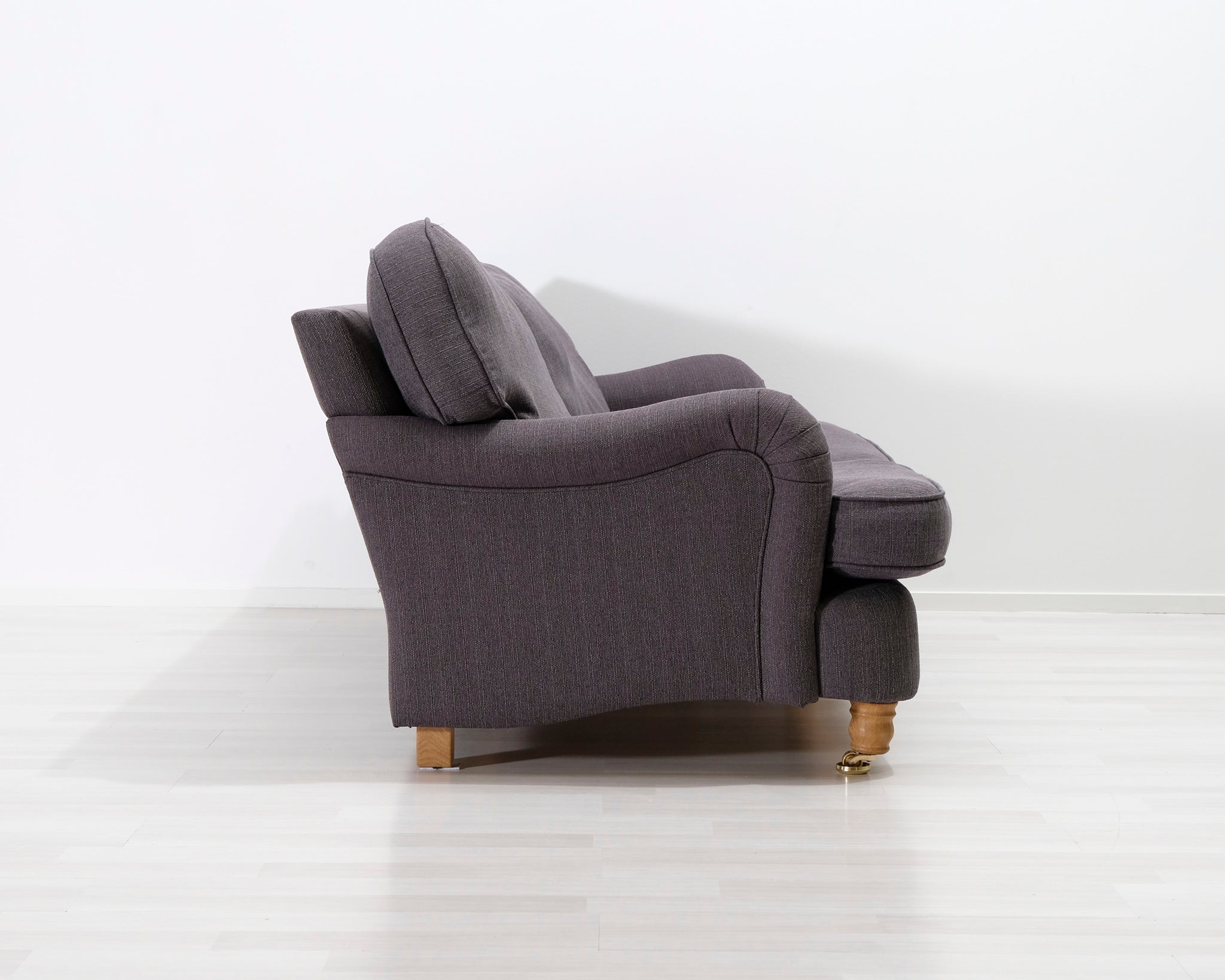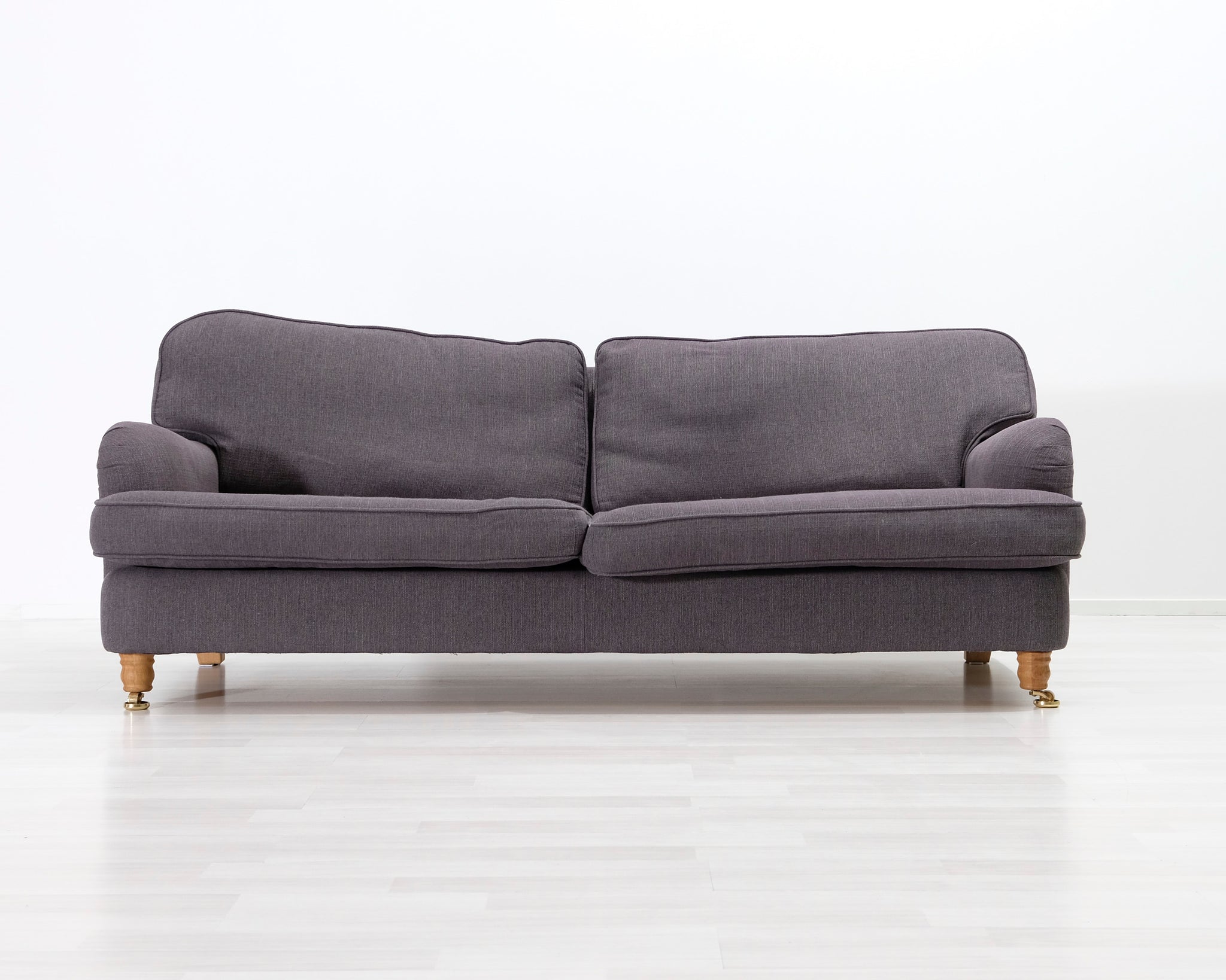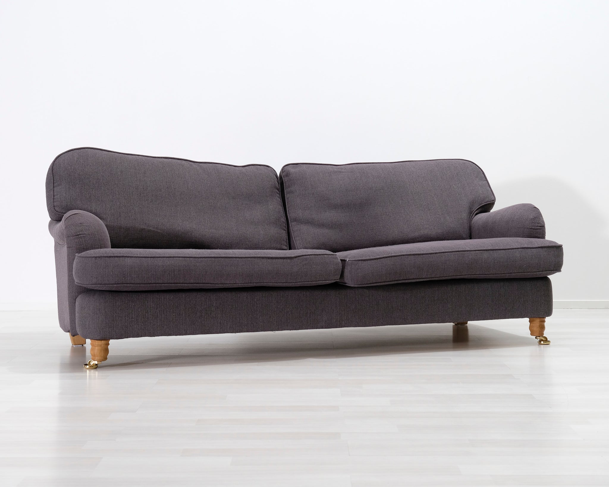 Harmaa Howard-tyylinen sohva. Untuvatäyte.
