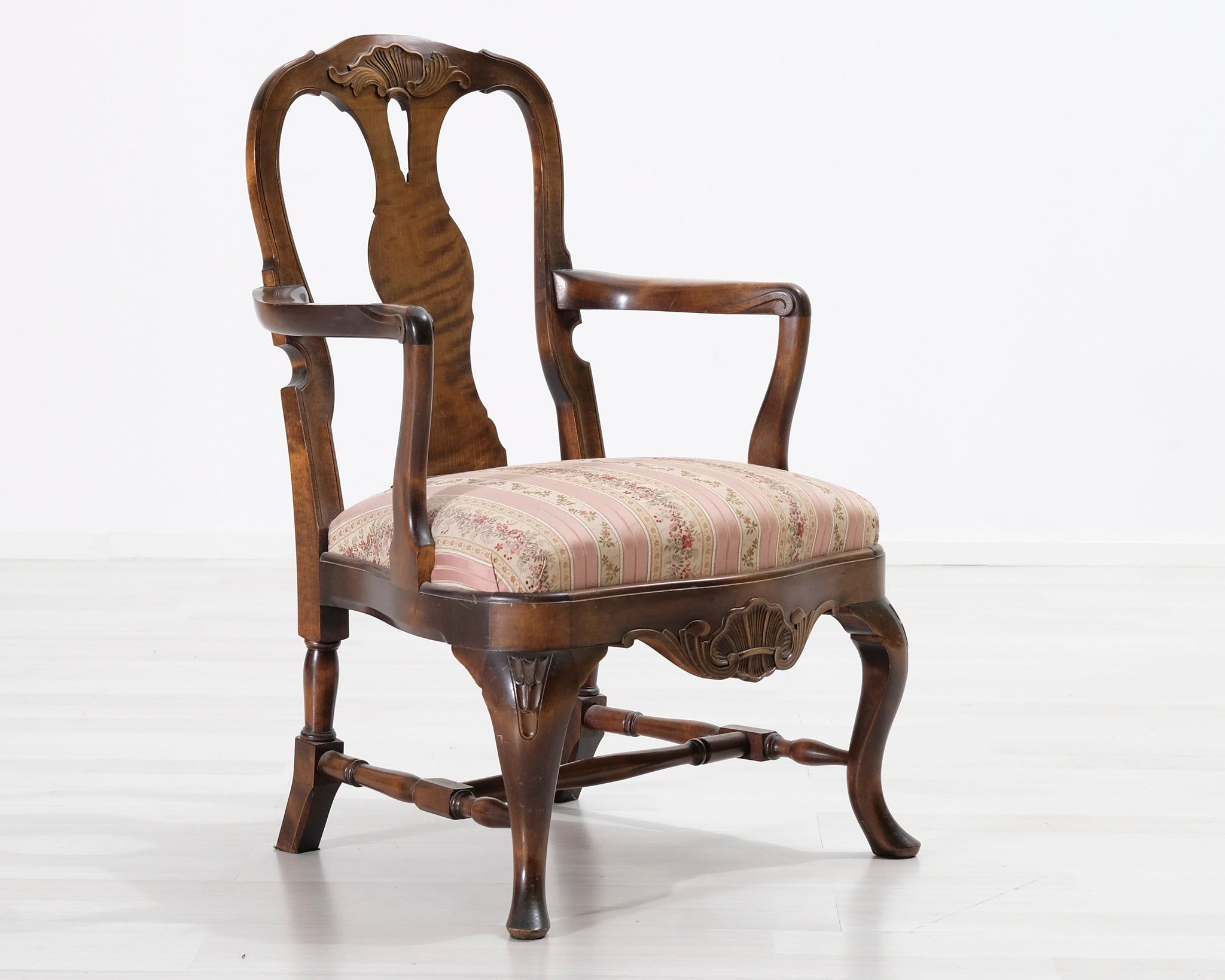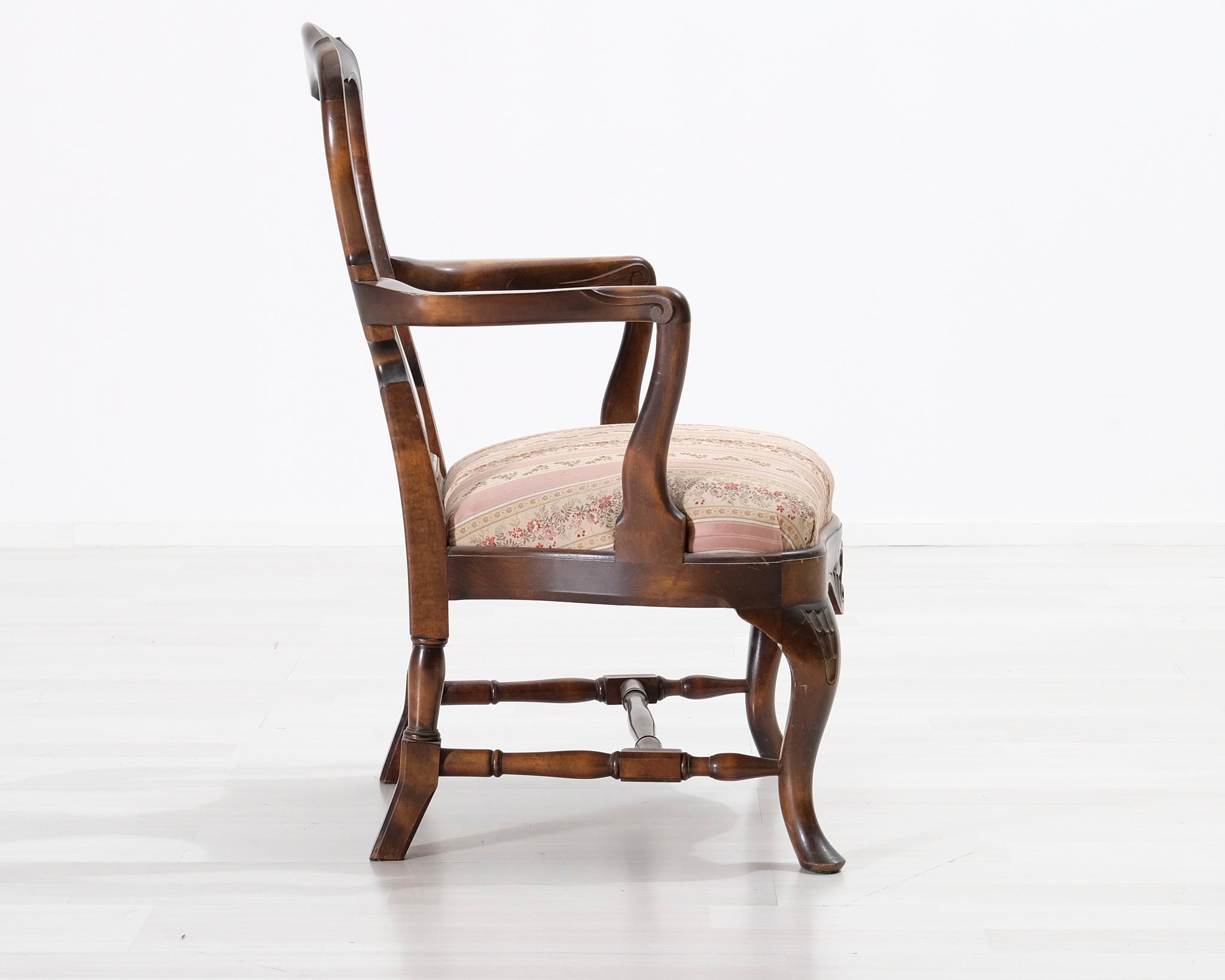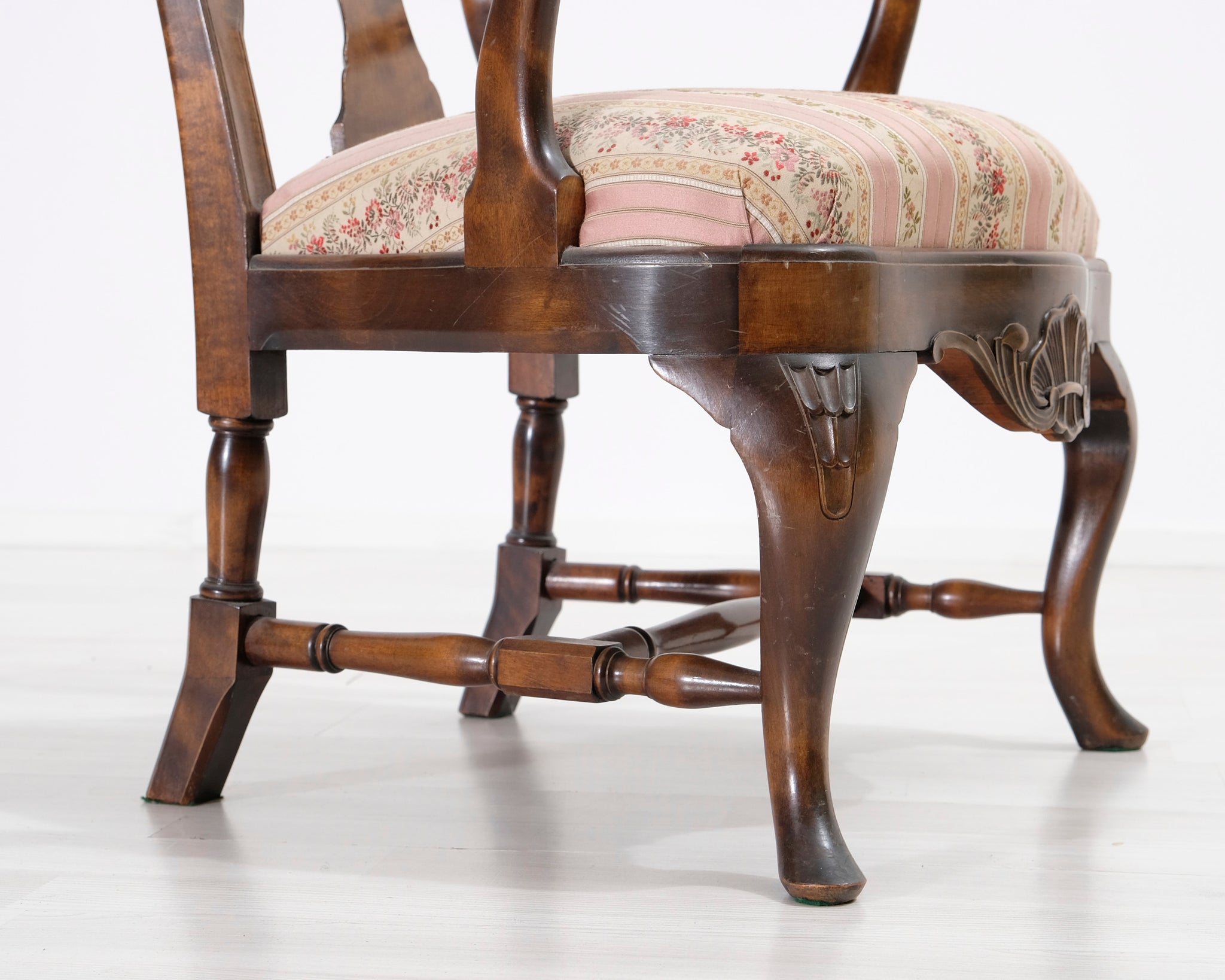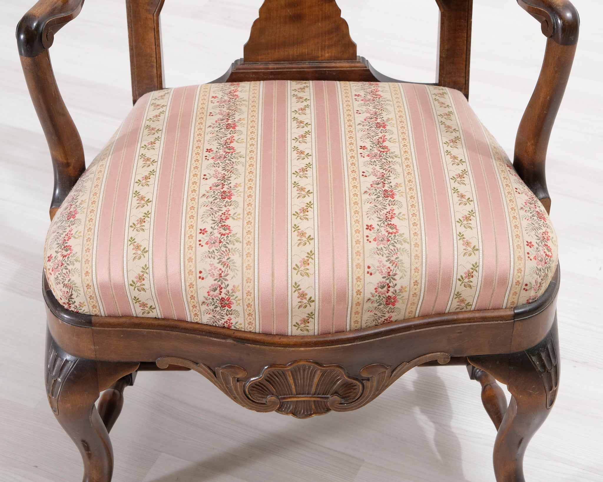 Antiikkinen nojatuoli kukallisella istuimella