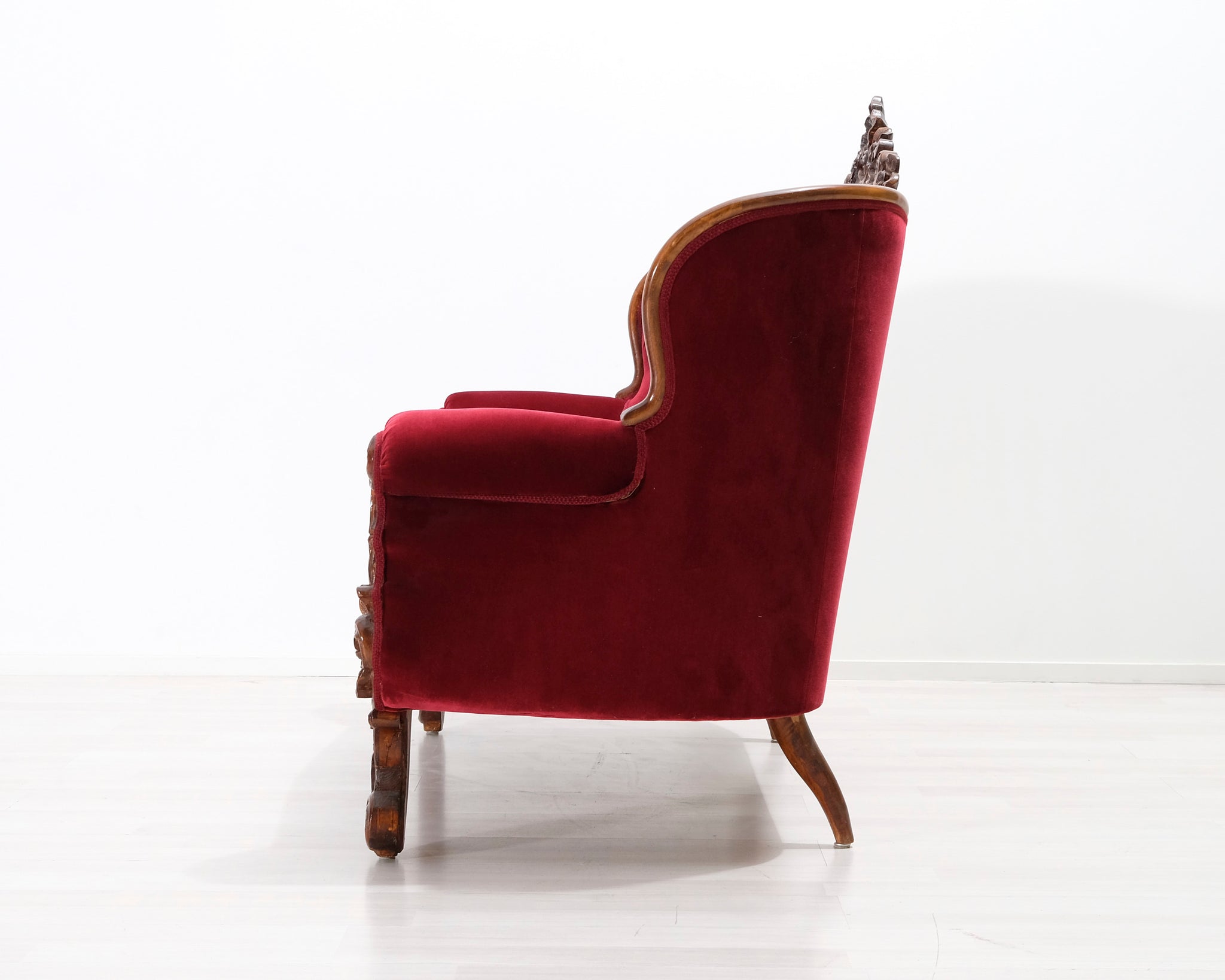 Antiikkinen kahden istuttava sohva. Punainen samettiverhoilu.