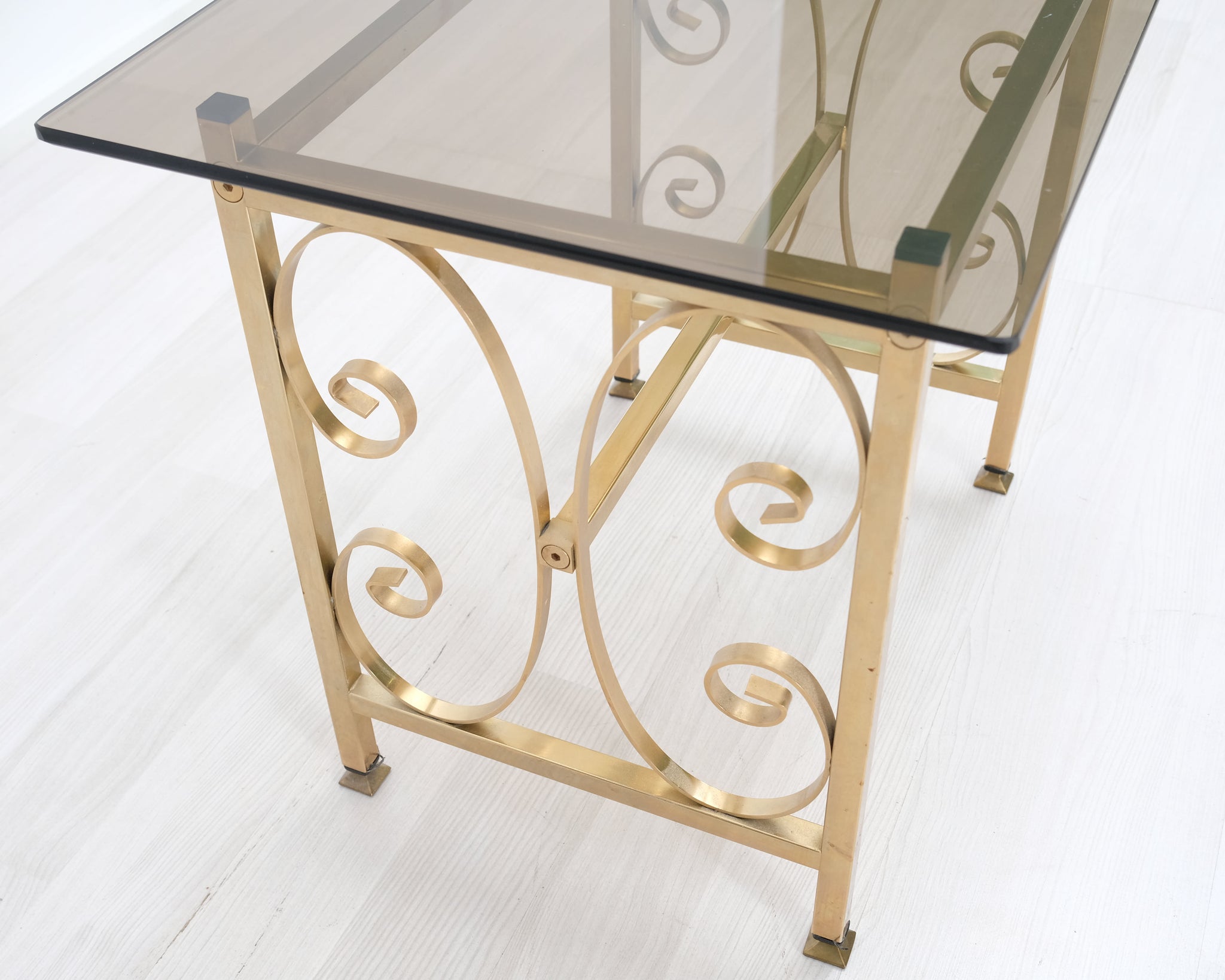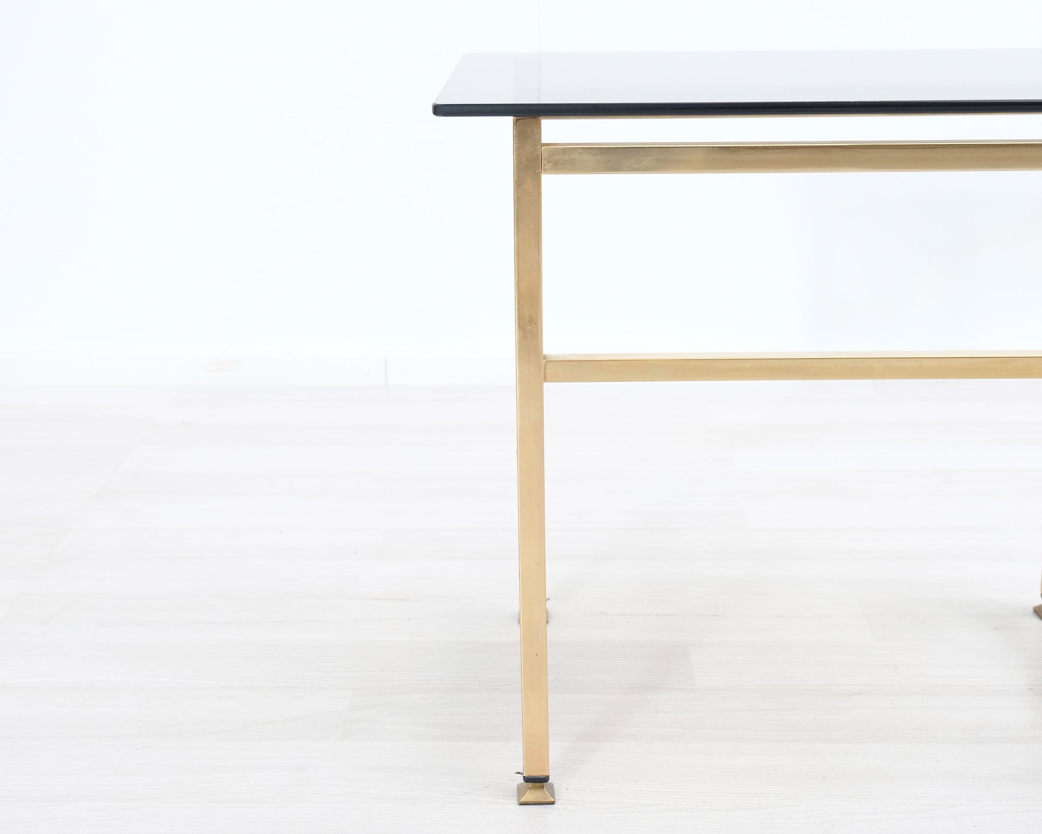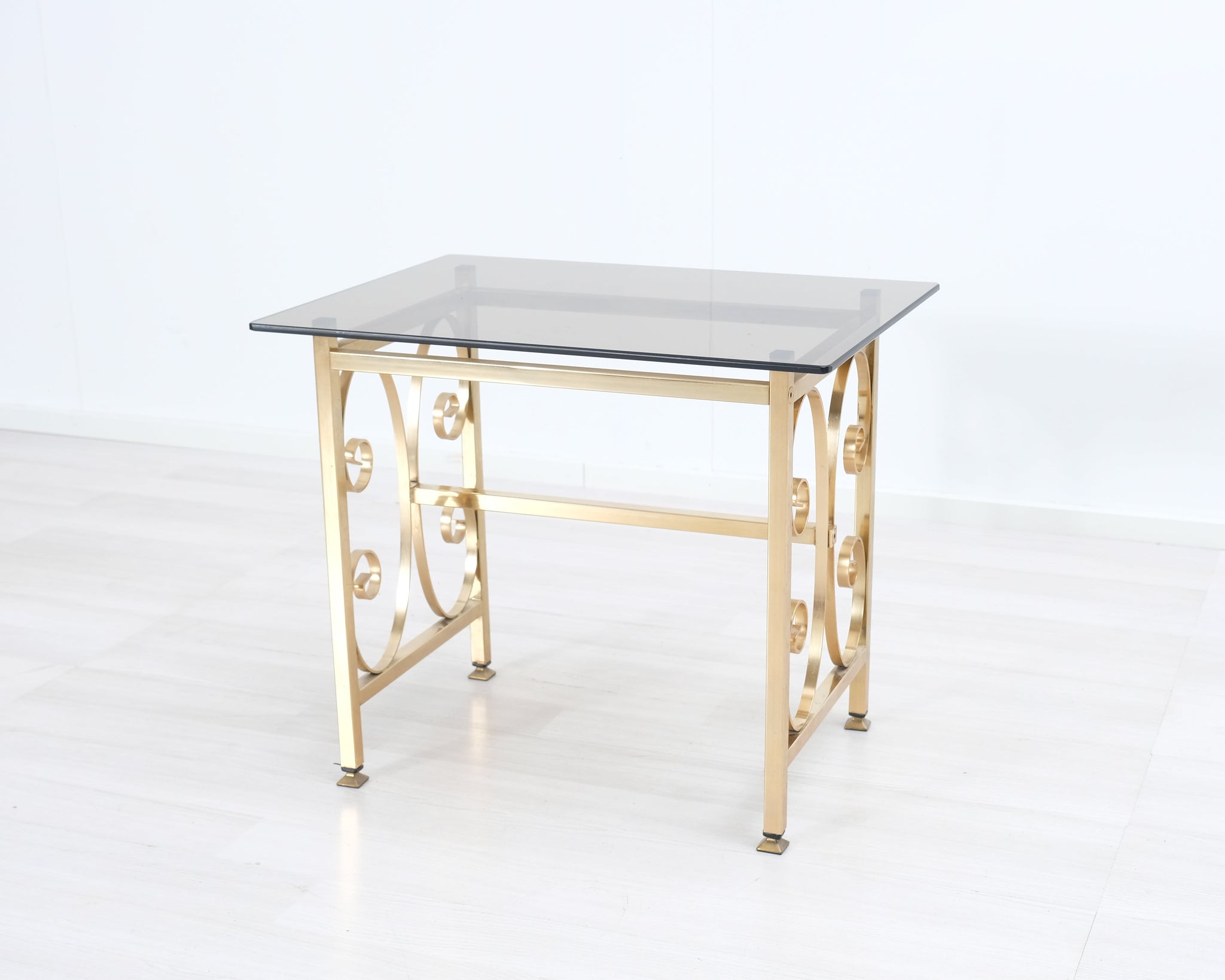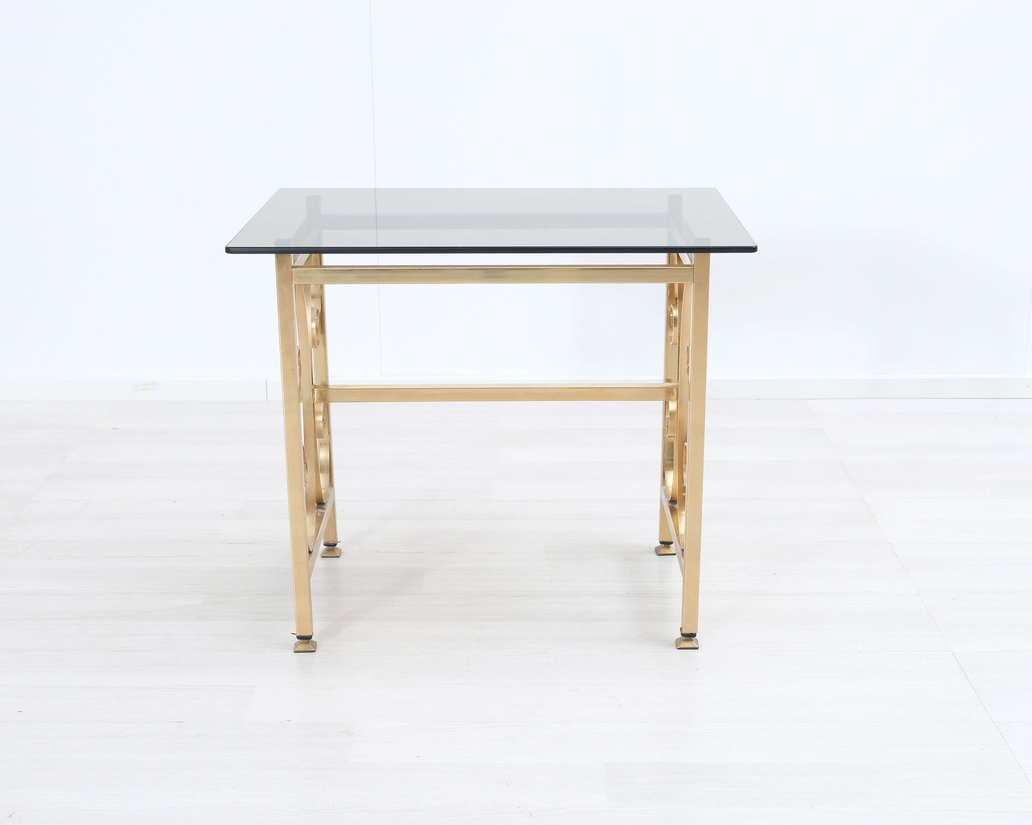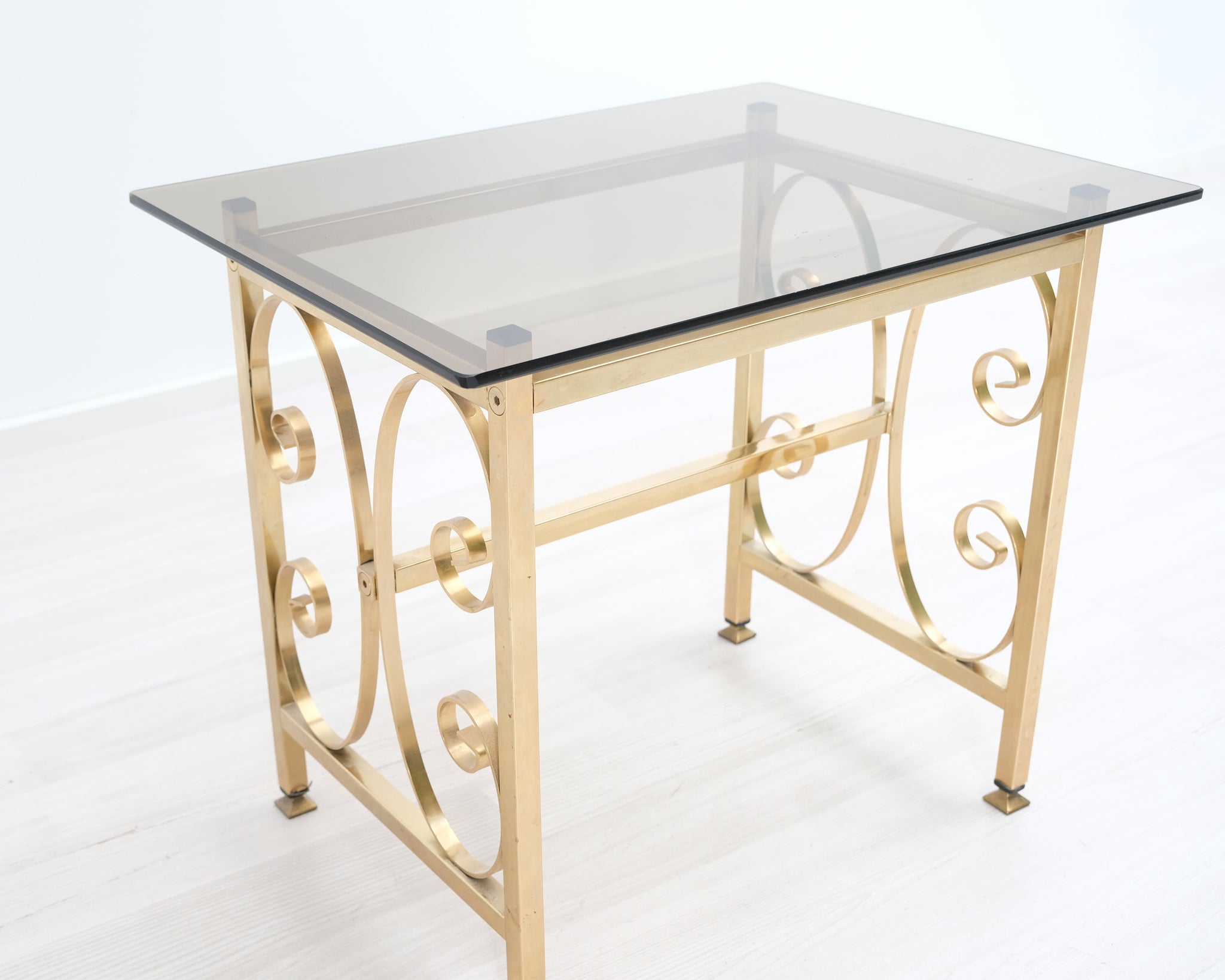 Tyylikäs sivupöytä 1970-luvulta. Pöydässä yhdistyy kaunis messinkirunko sekä savunvärinen lasilevy.
