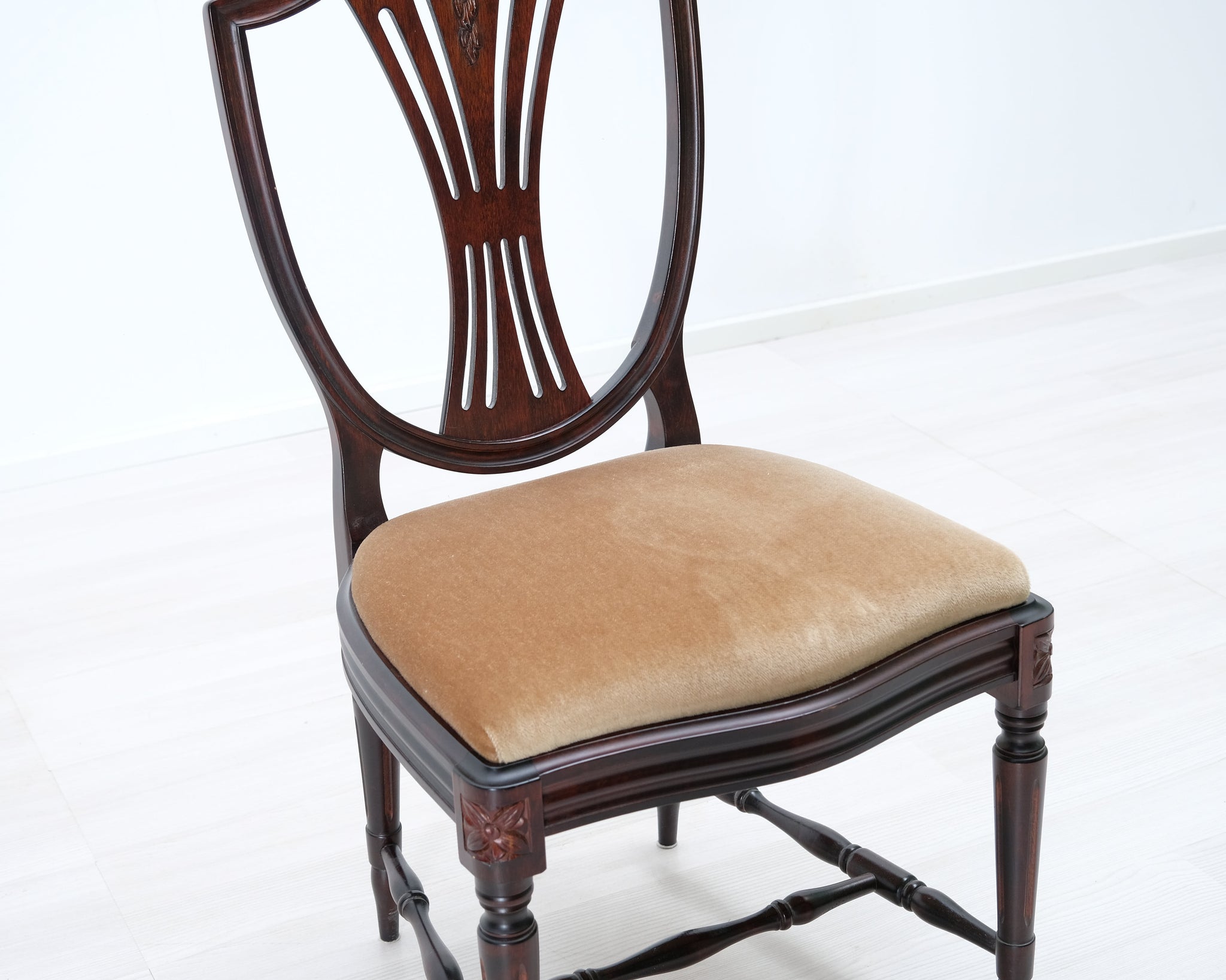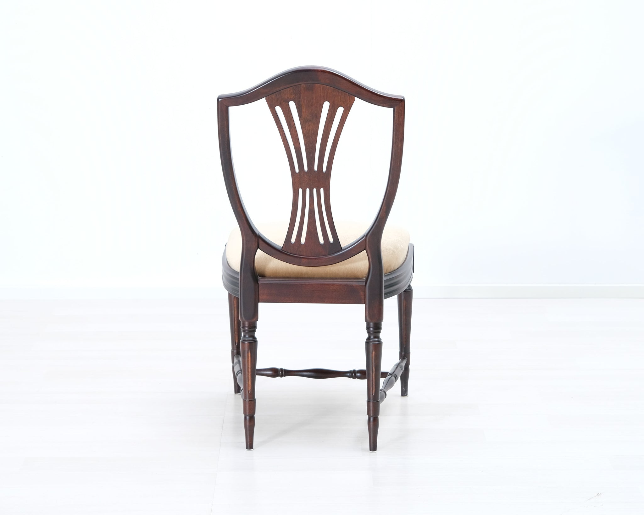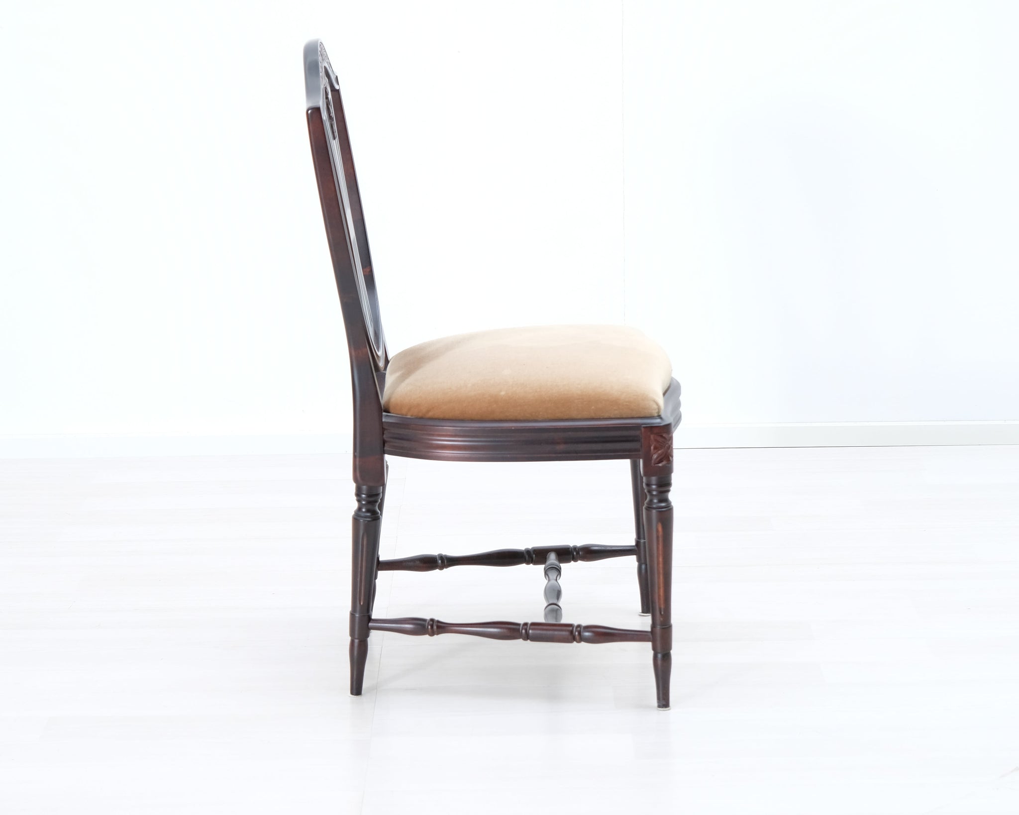 Kustavilaistyylinen tuoli beigellä kangasistuimella.