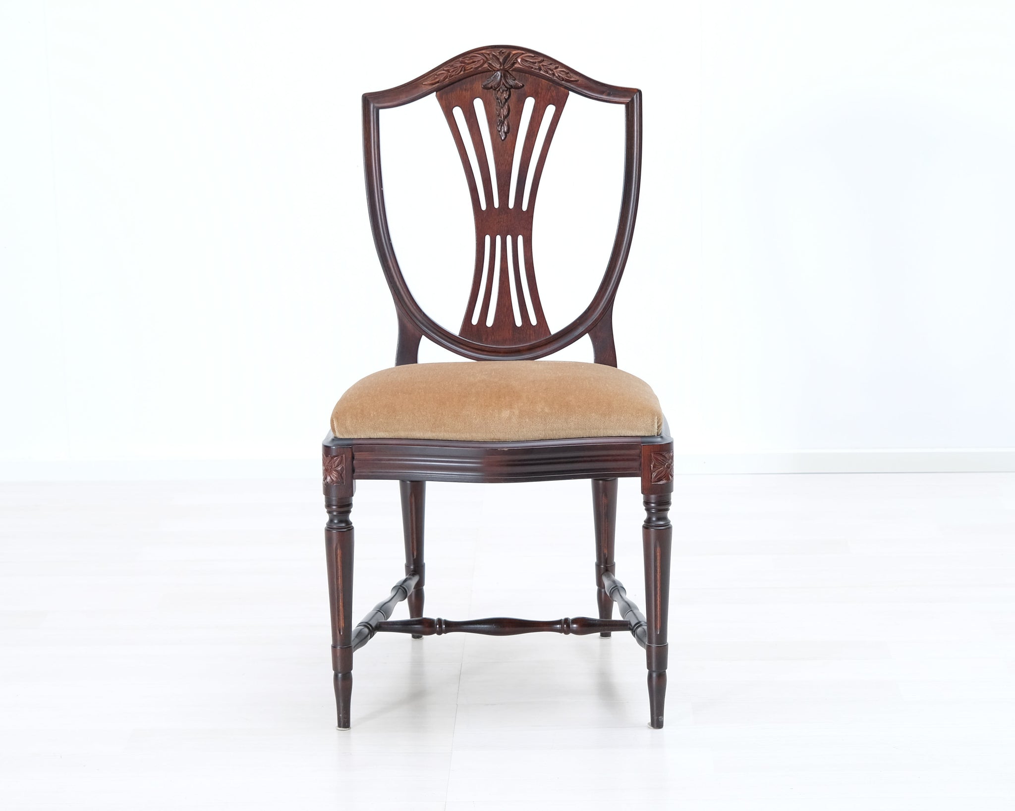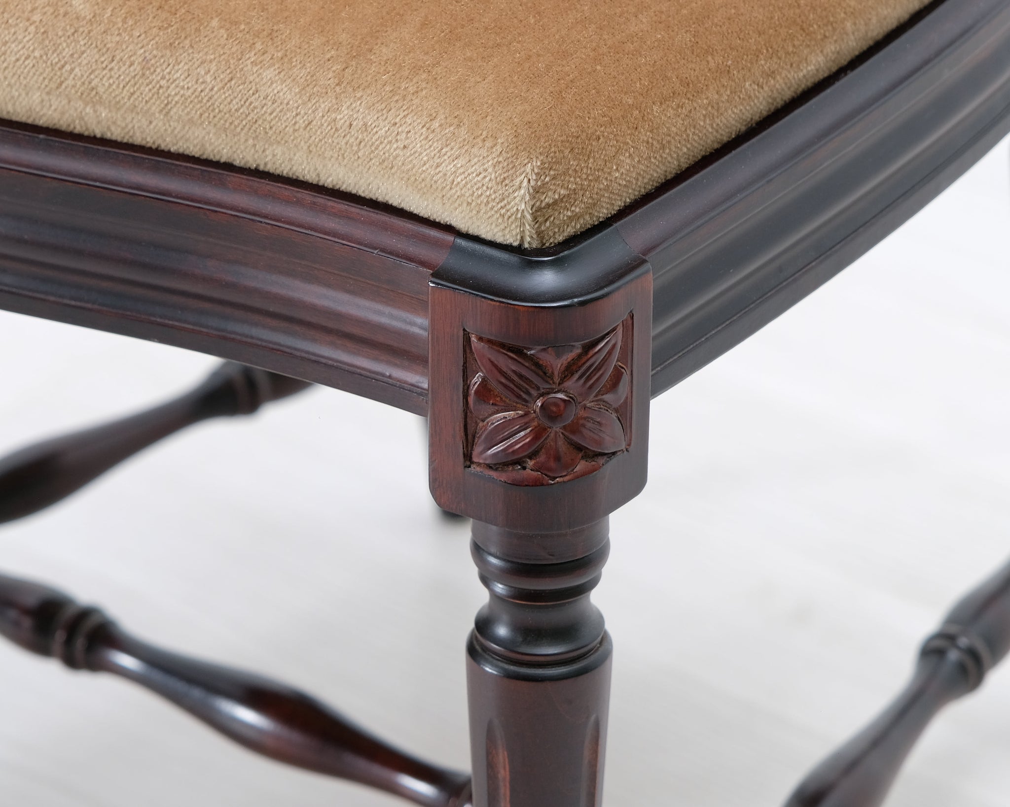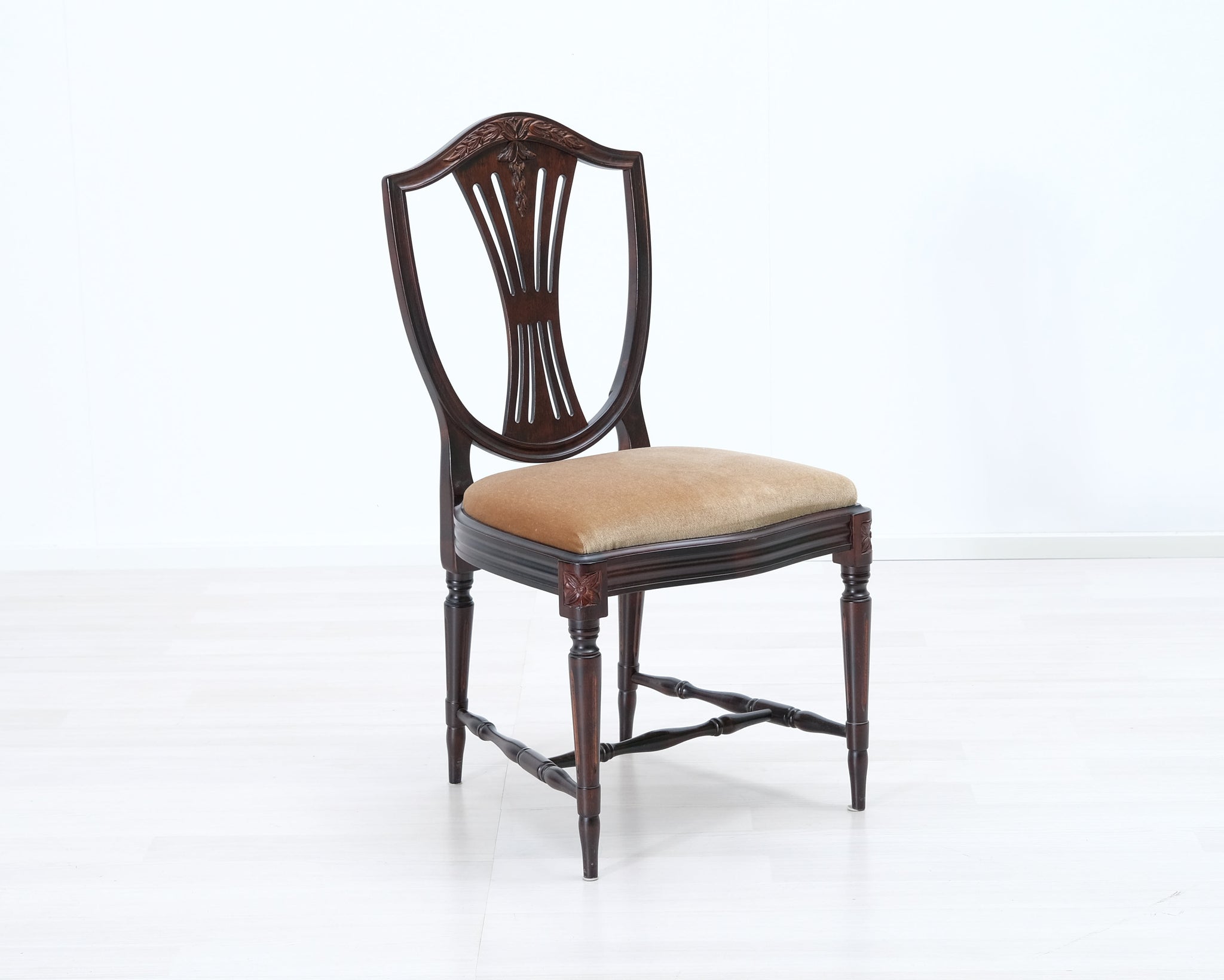Kustavilaistyylinen tuoli beigellä kangasistuimella.