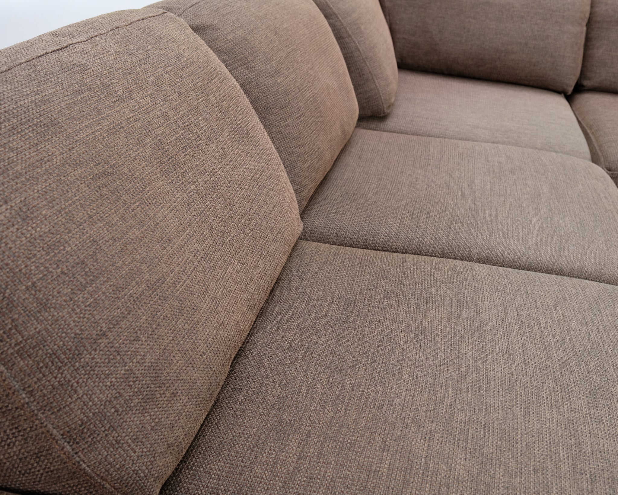 Ruskea kangasverhoiltu kulmasohva ja sohvaan sopiva divaani.