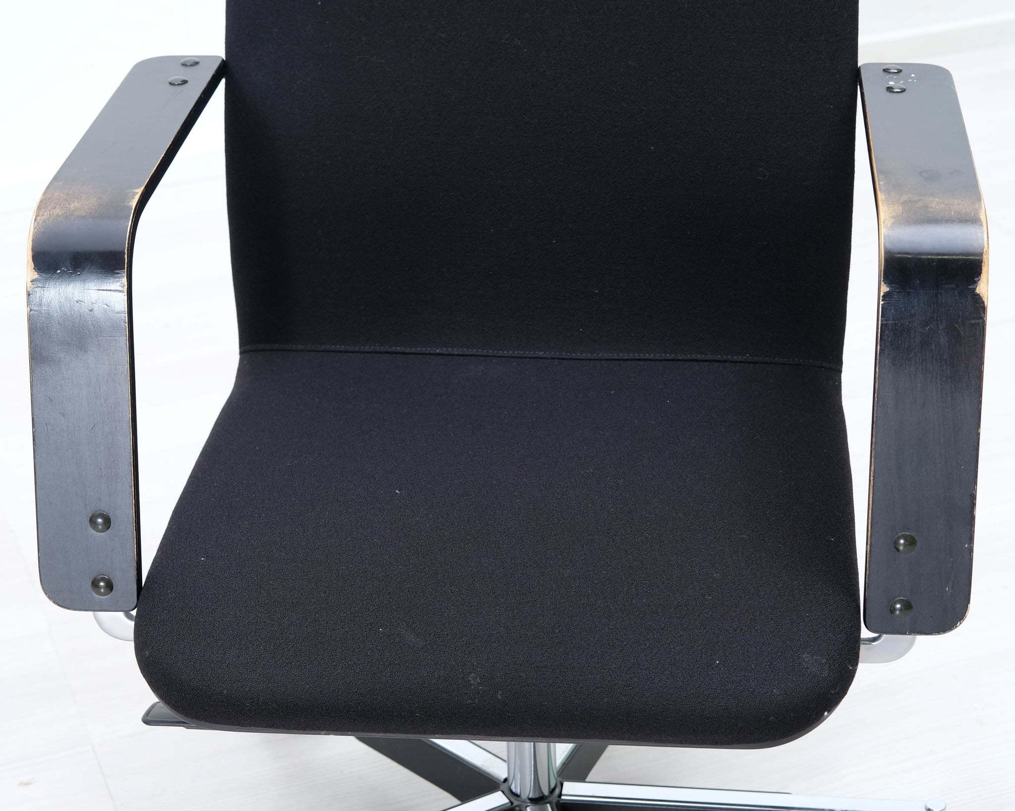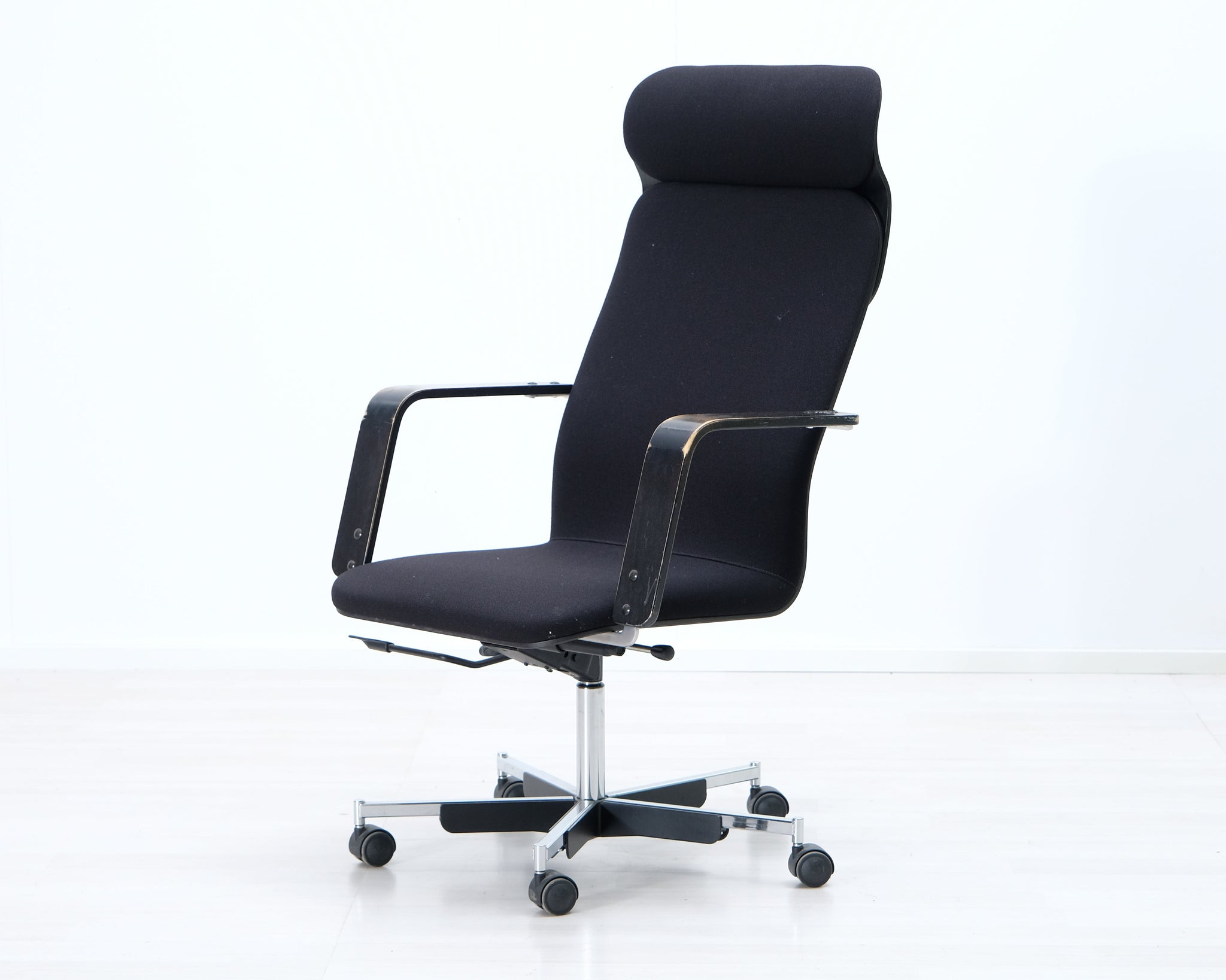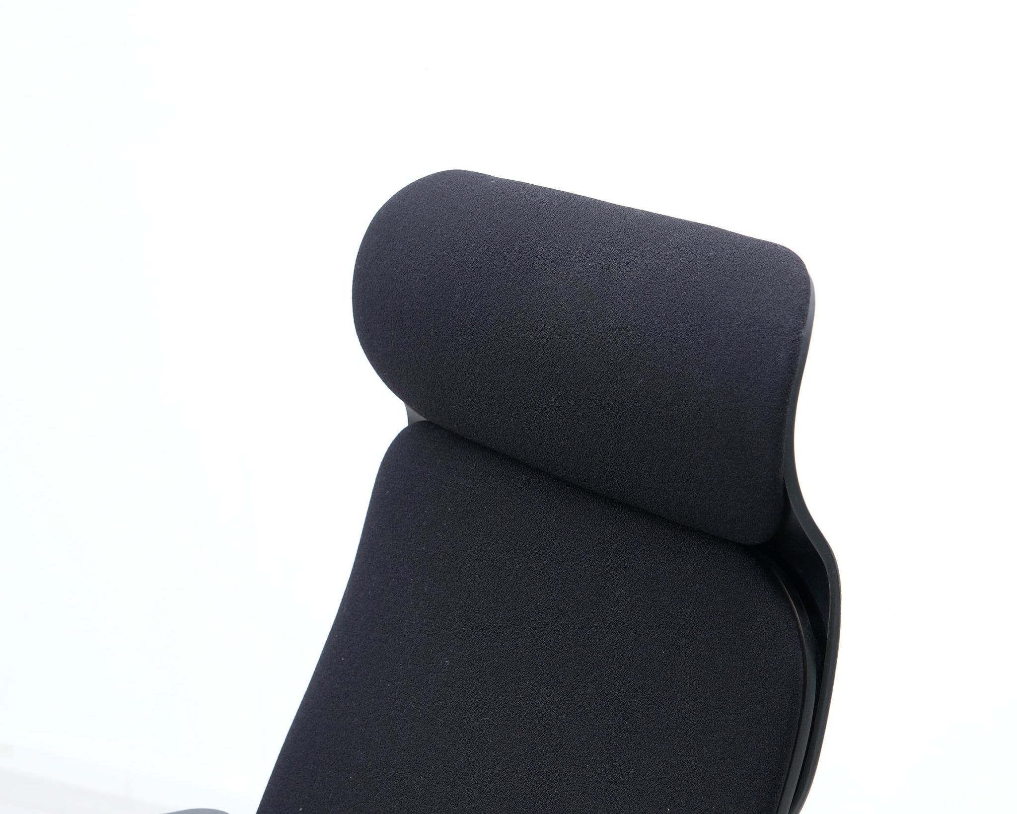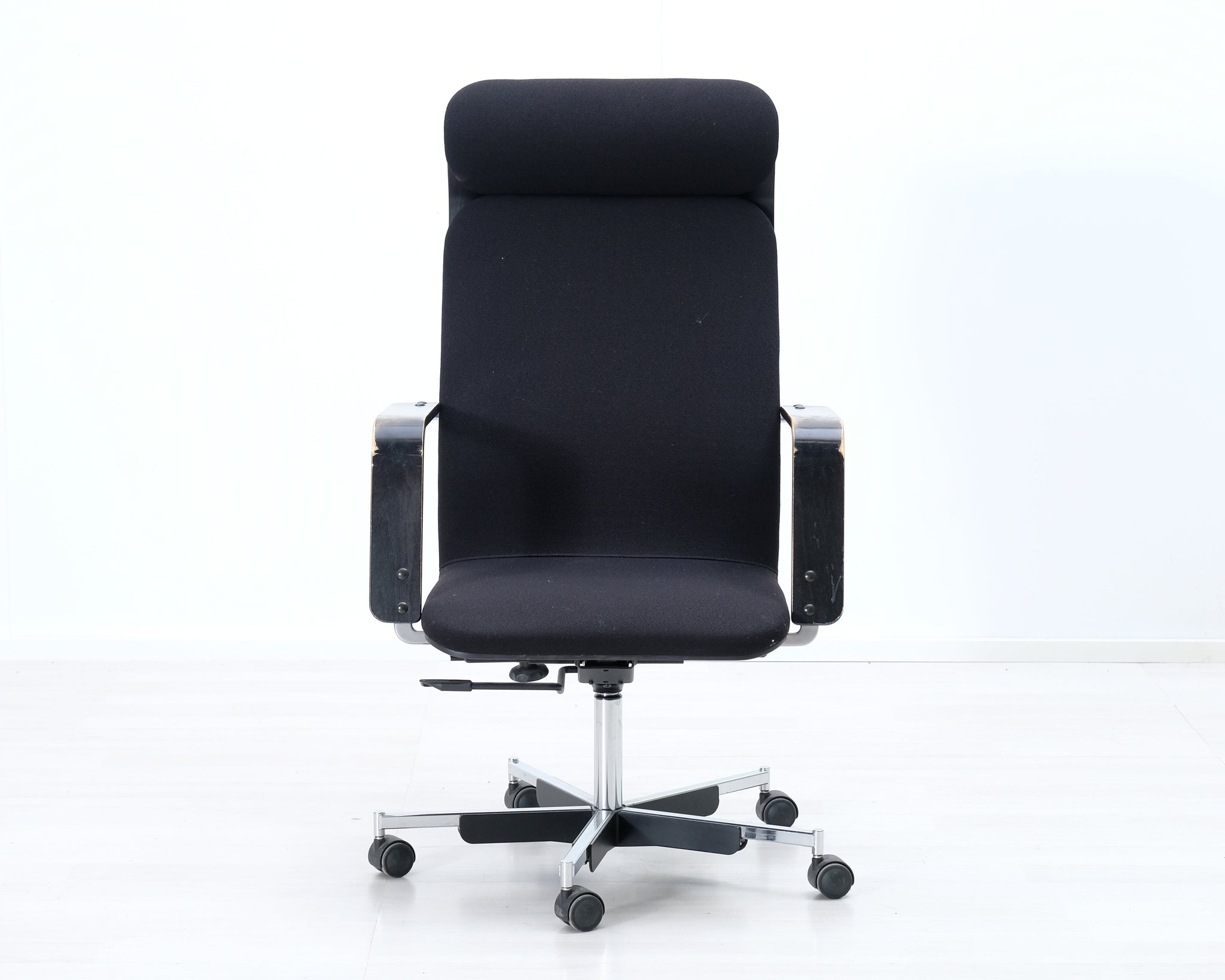 Kotimaisen Avarten musta toimistotuoli, suunnittelijana Yrjö Kukkapuro. Pehmustettu istuin ja selkänoja. Säädettävä korkeus.