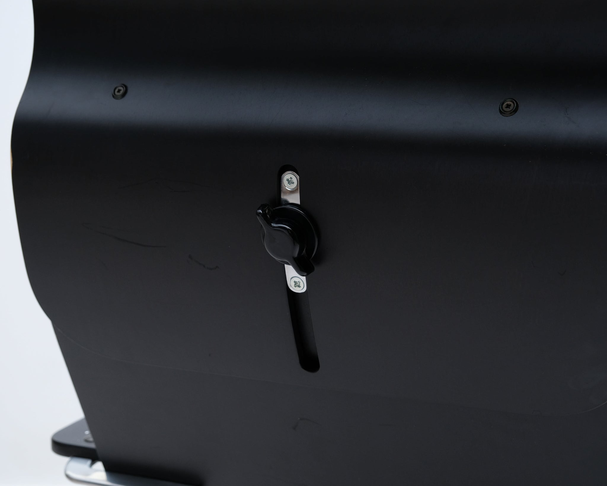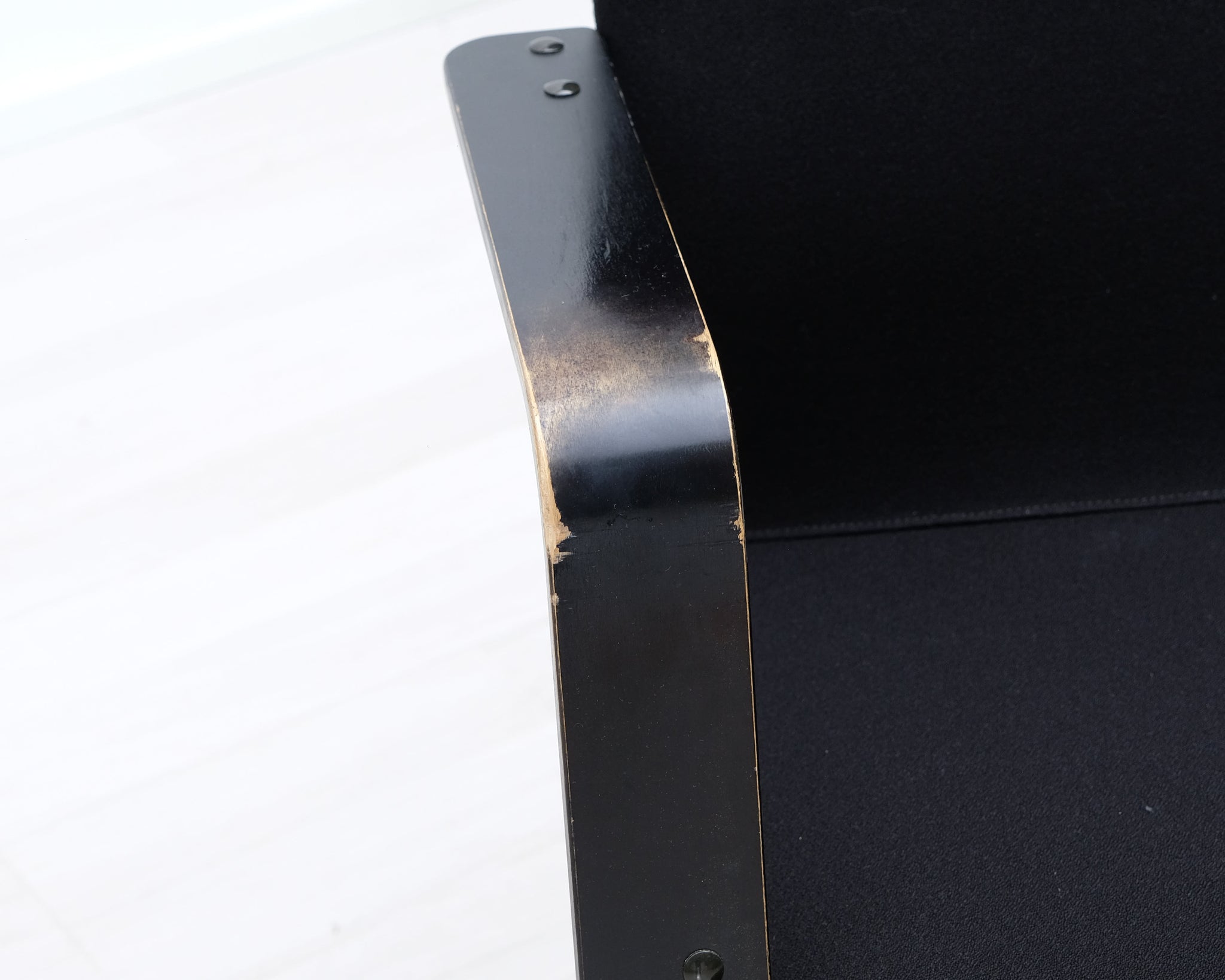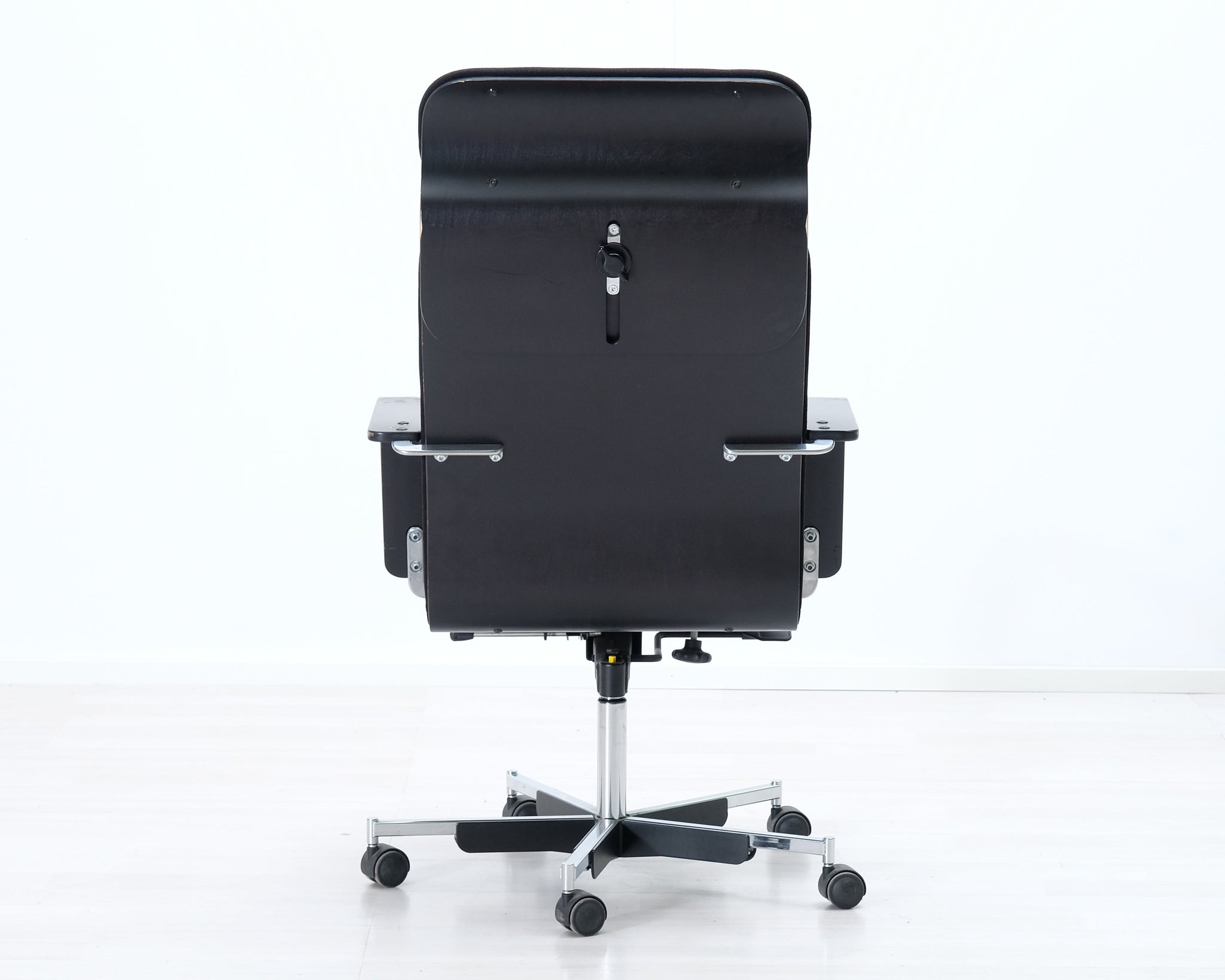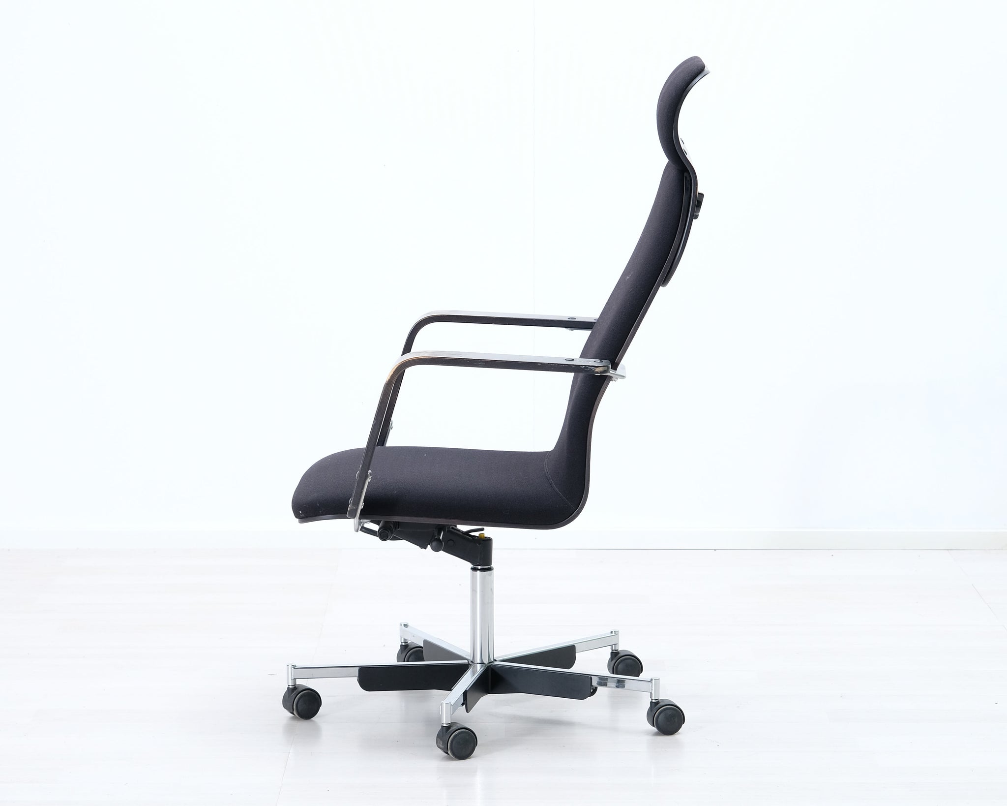 Kotimaisen Avarten musta toimistotuoli, suunnittelijana Yrjö Kukkapuro. Pehmustettu istuin ja selkänoja. Säädettävä korkeus.