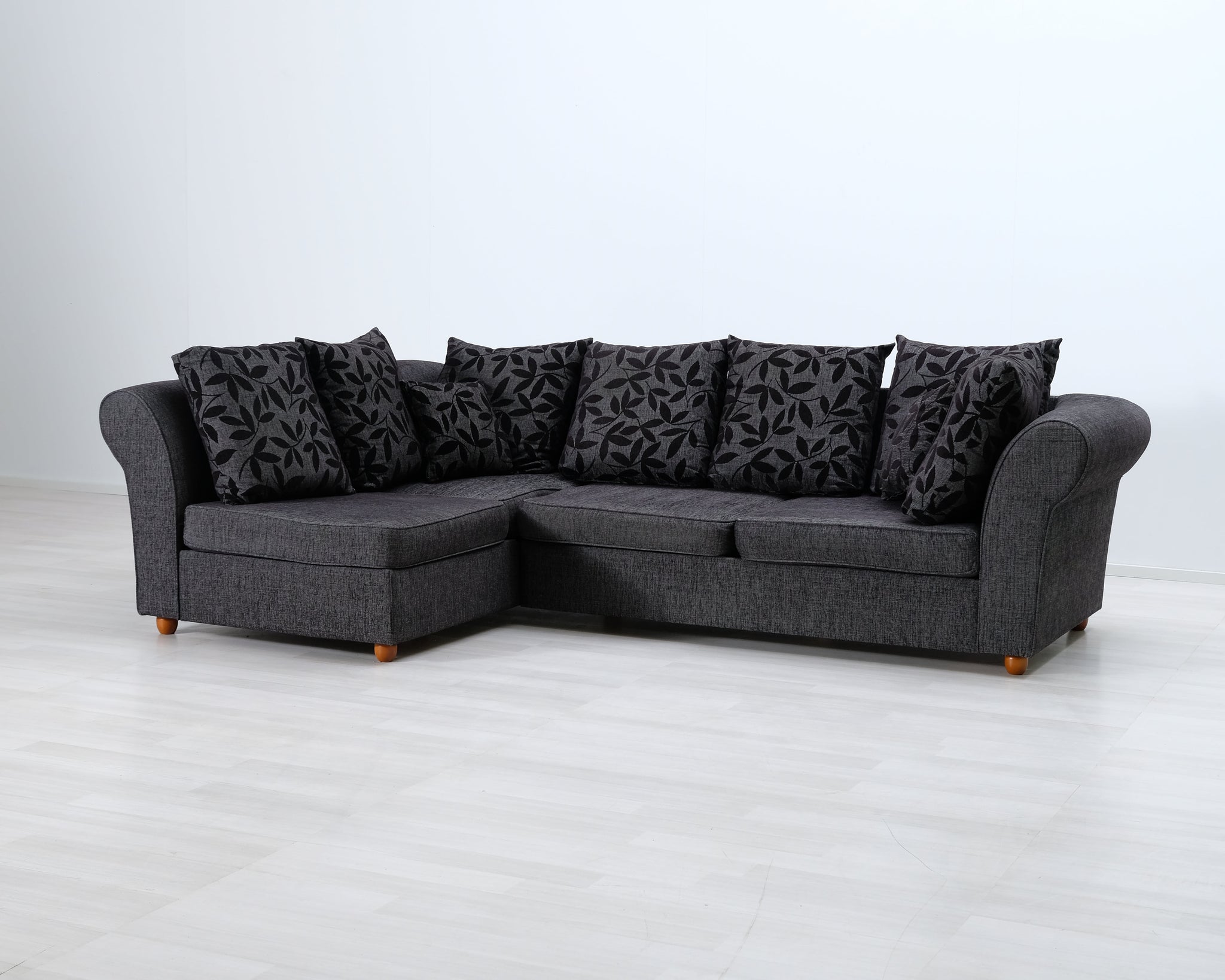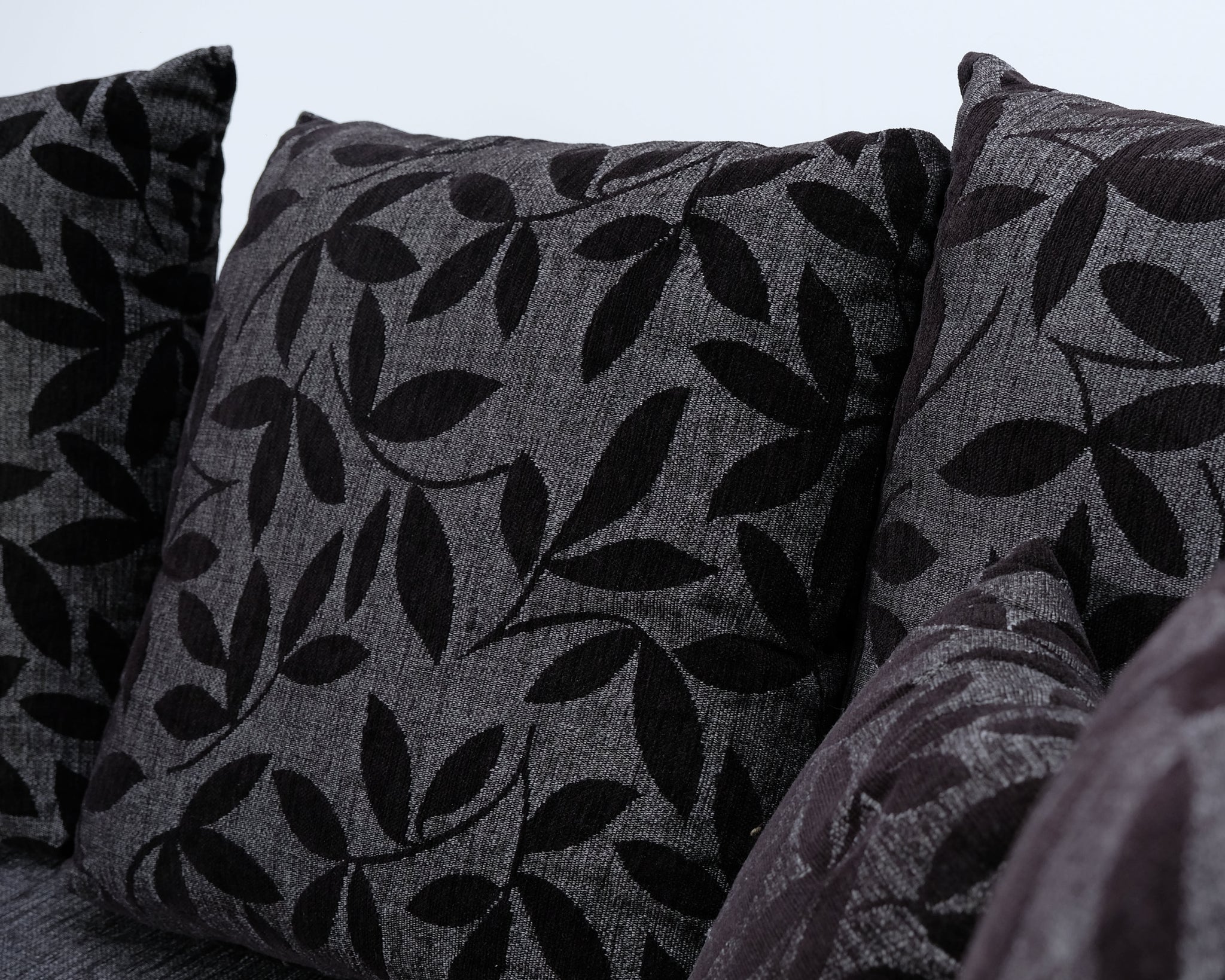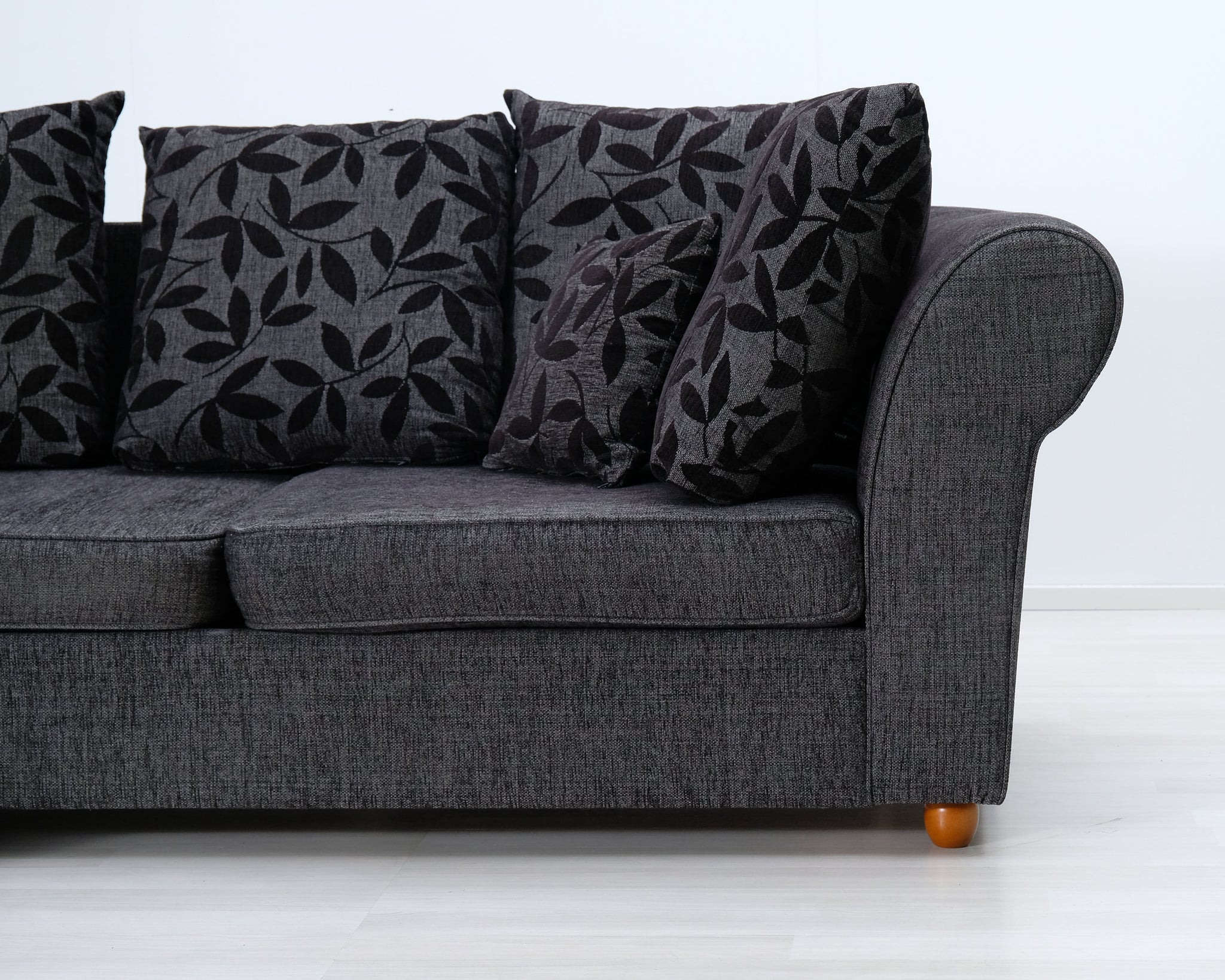 Harmaa divaanisohva kangasverhoilulla. Kukalliset heittotyynyt tuovat rentoutta sohvan ilmeeseen.