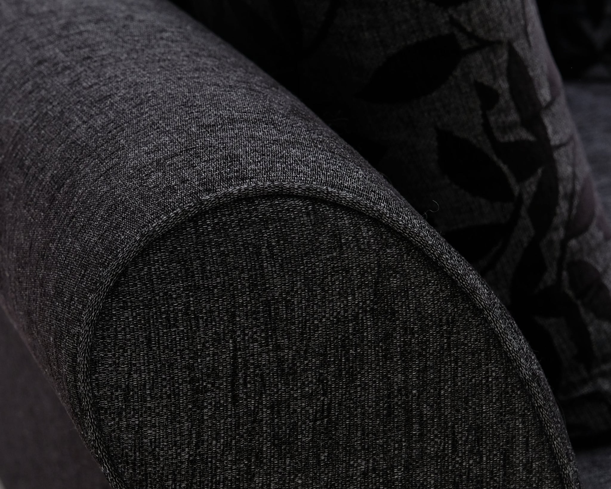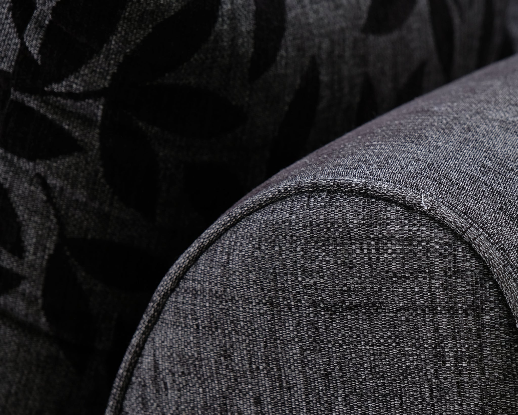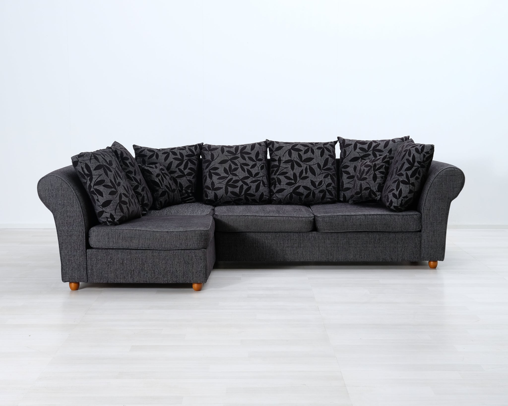 Harmaa divaanisohva kangasverhoilulla. Kukalliset heittotyynyt tuovat rentoutta sohvan ilmeeseen.