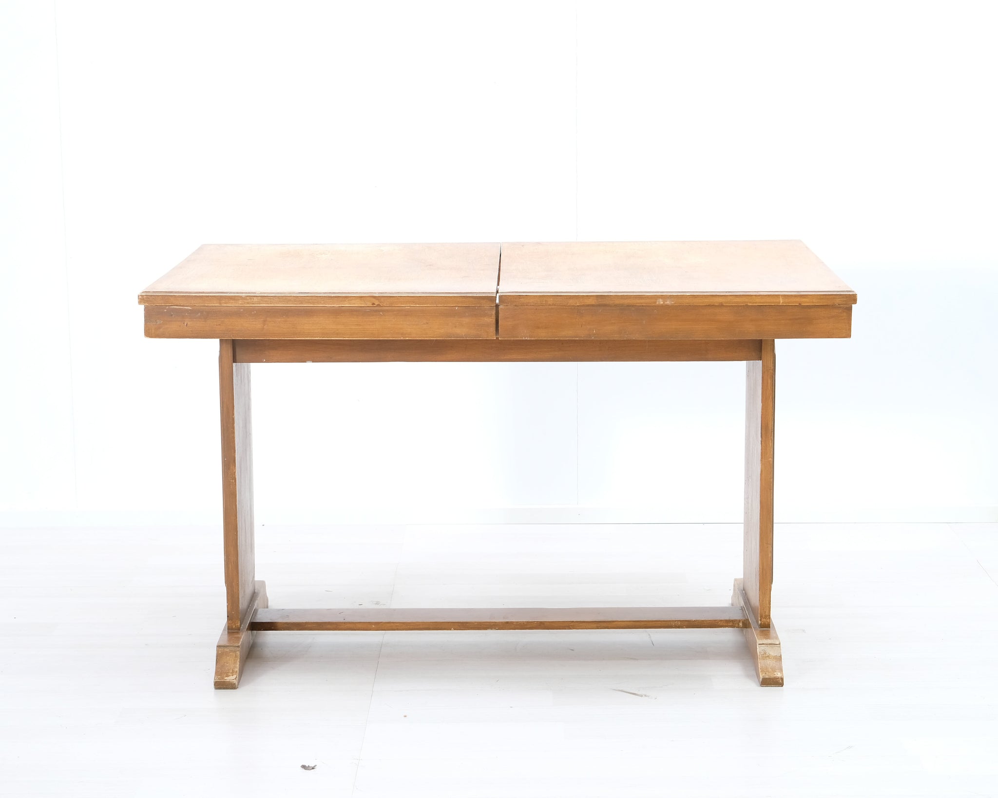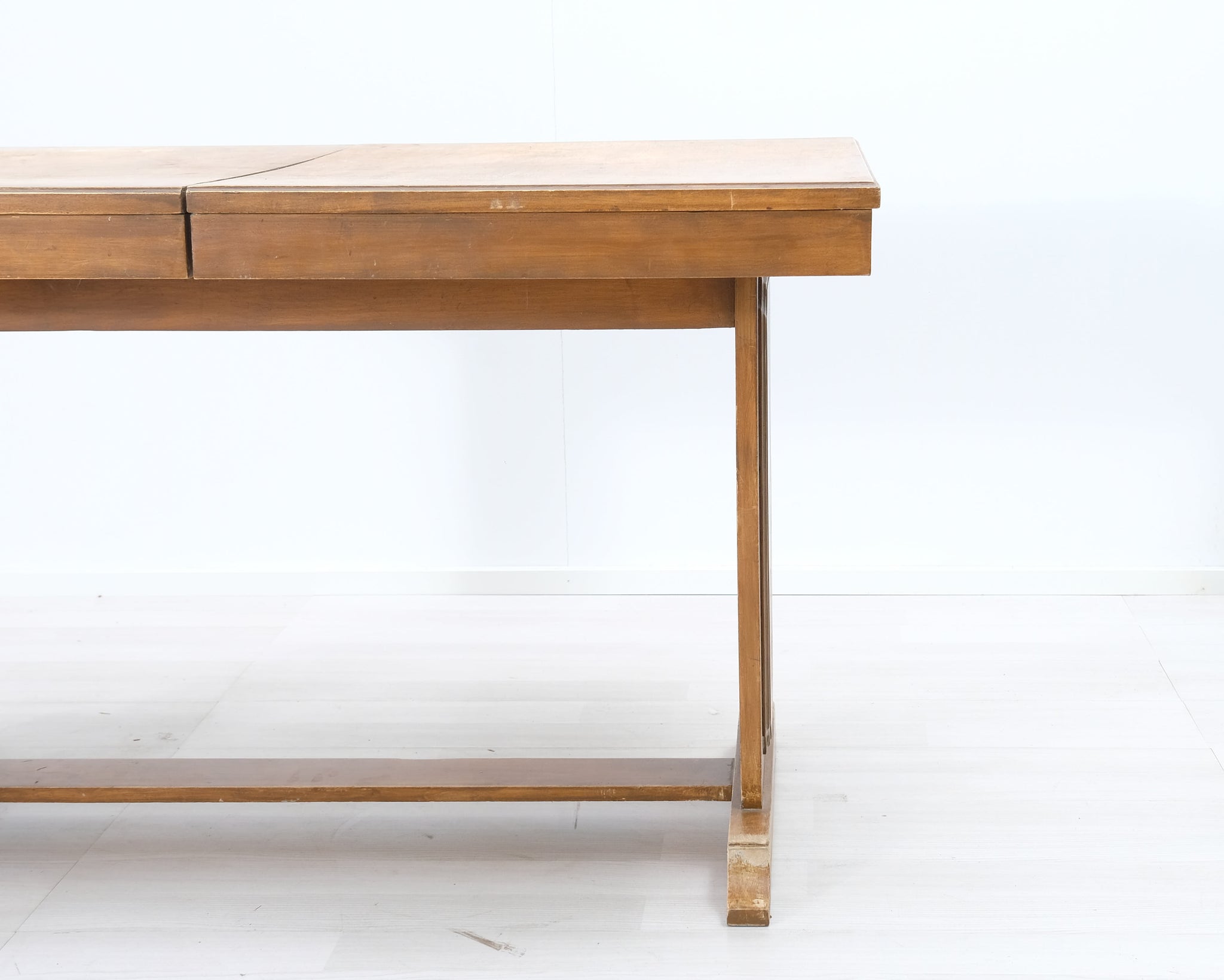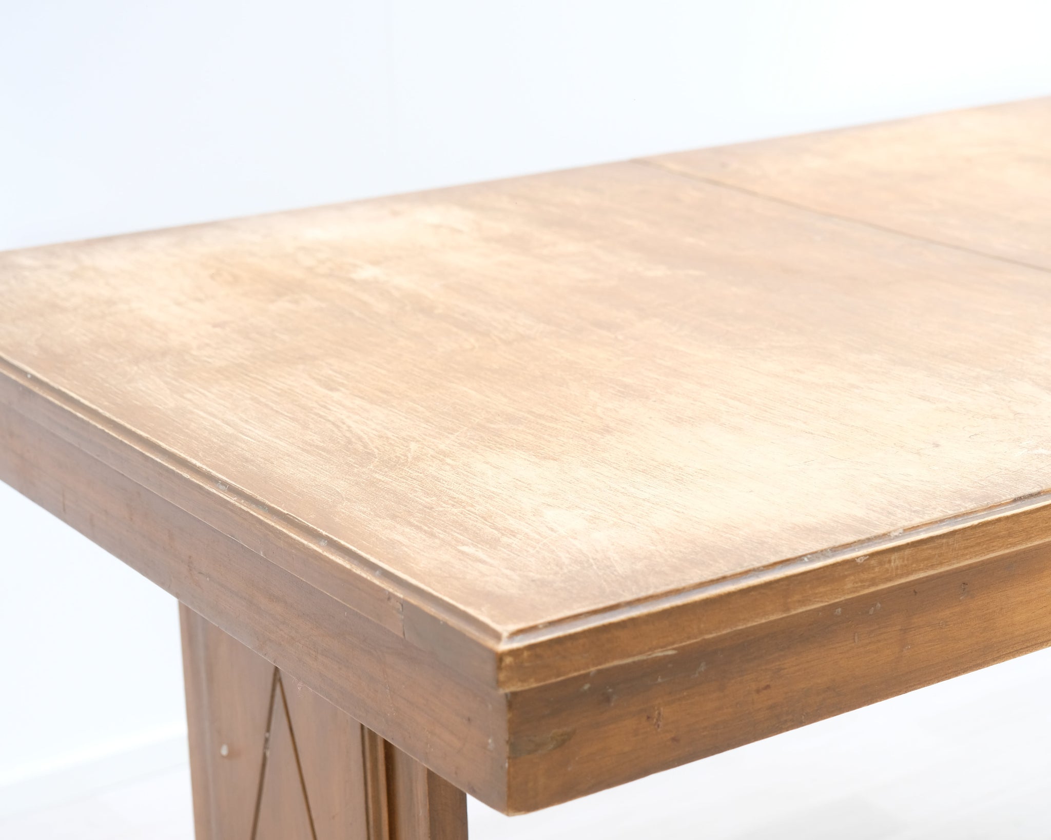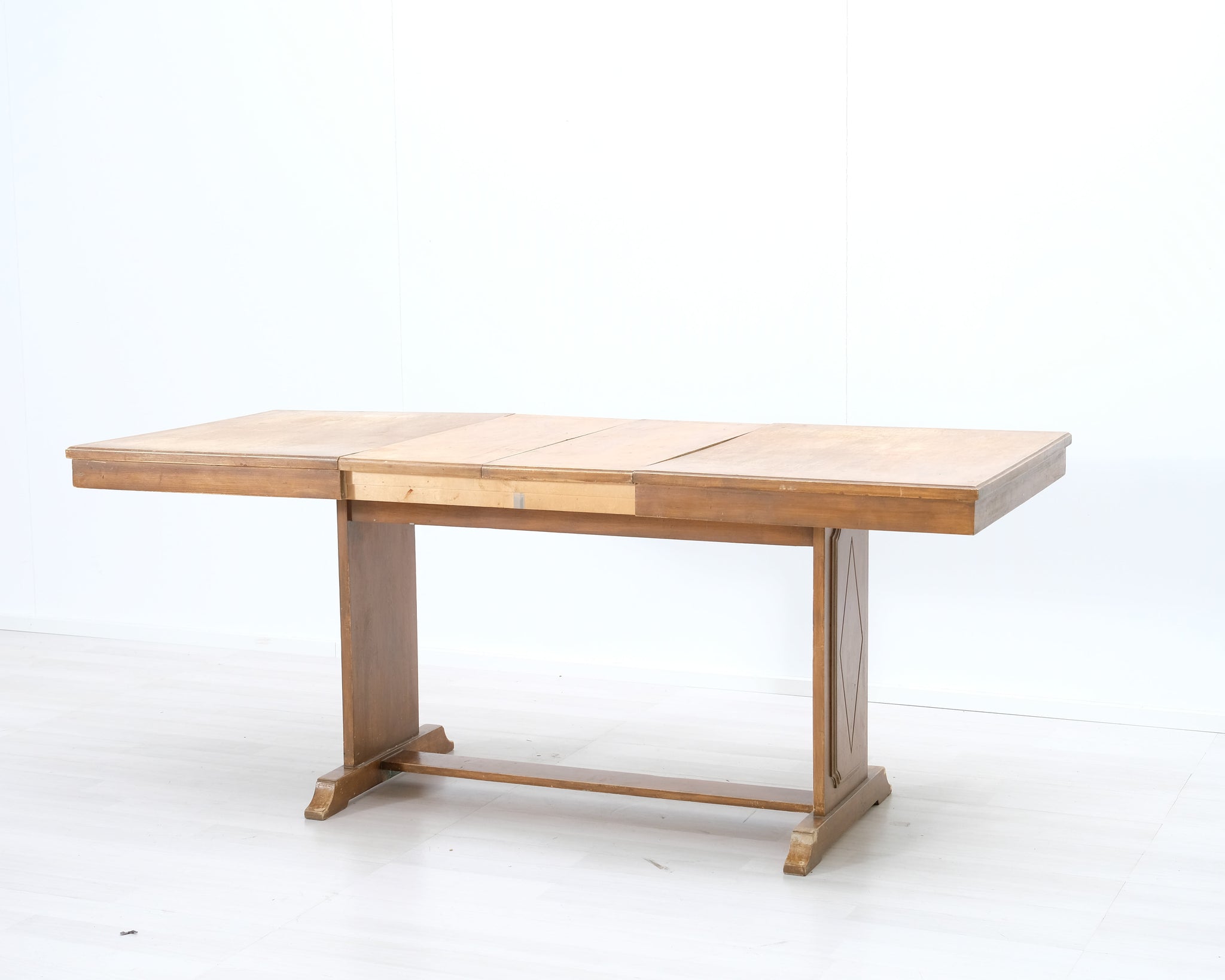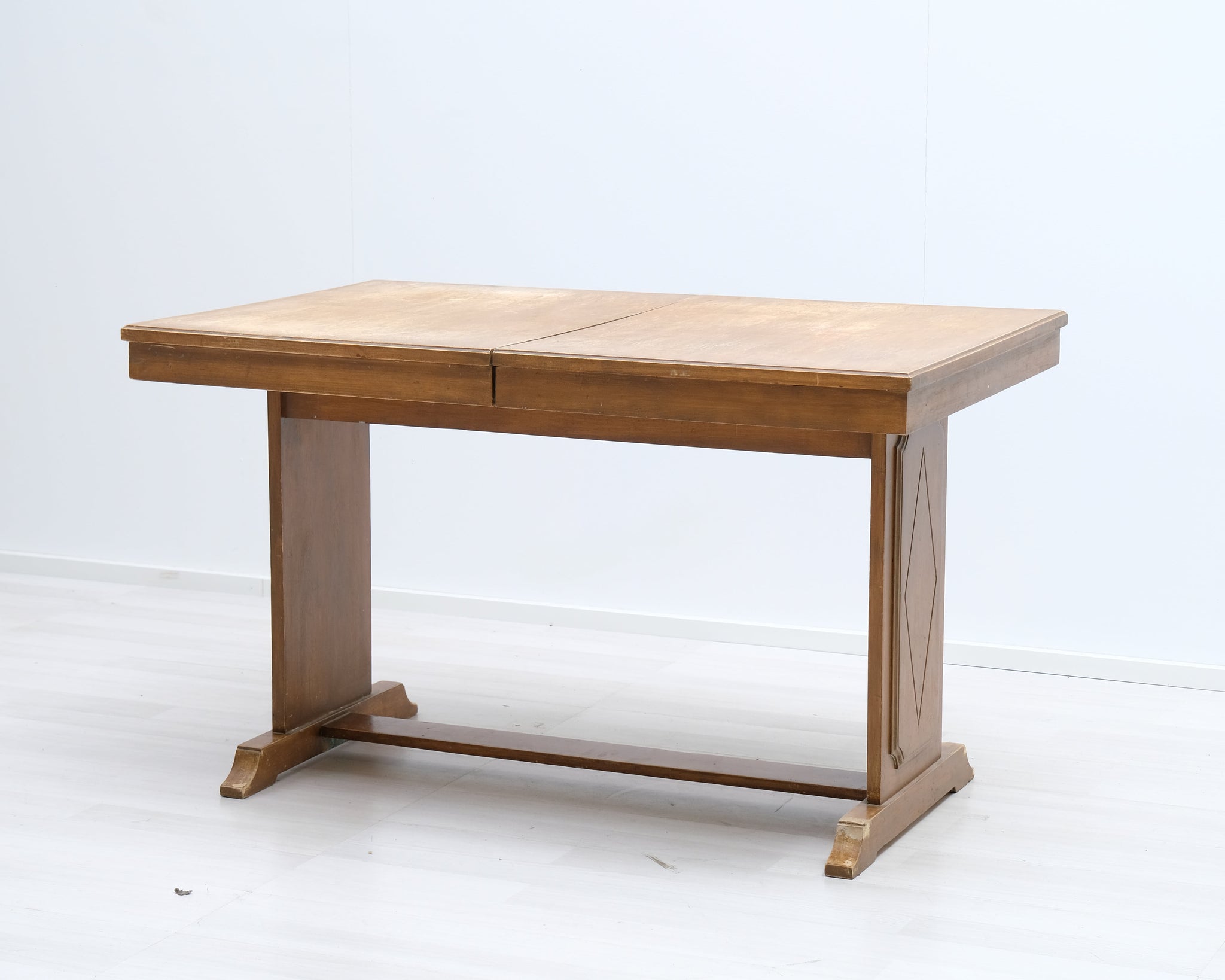 Täyspuinen antiikkiruokapöytä 1940-luvulta. Yhdistetyt jalat. Pöytä on helposti jatkettava lisälevyn avulla.