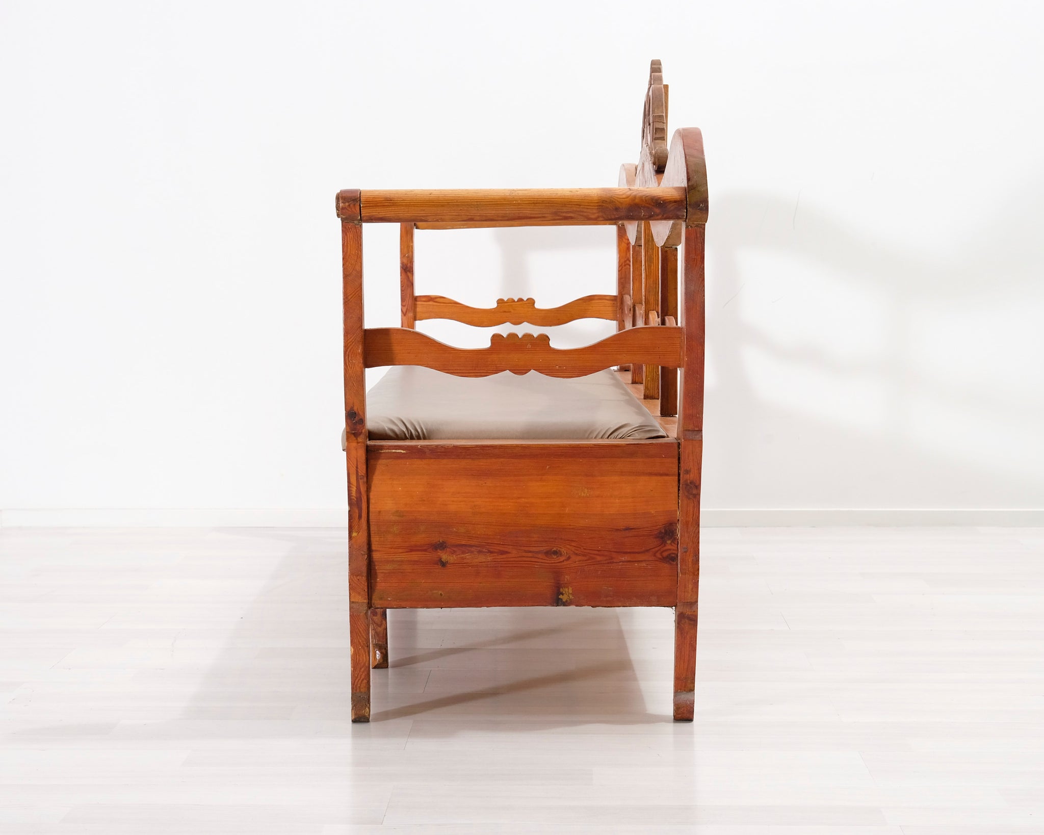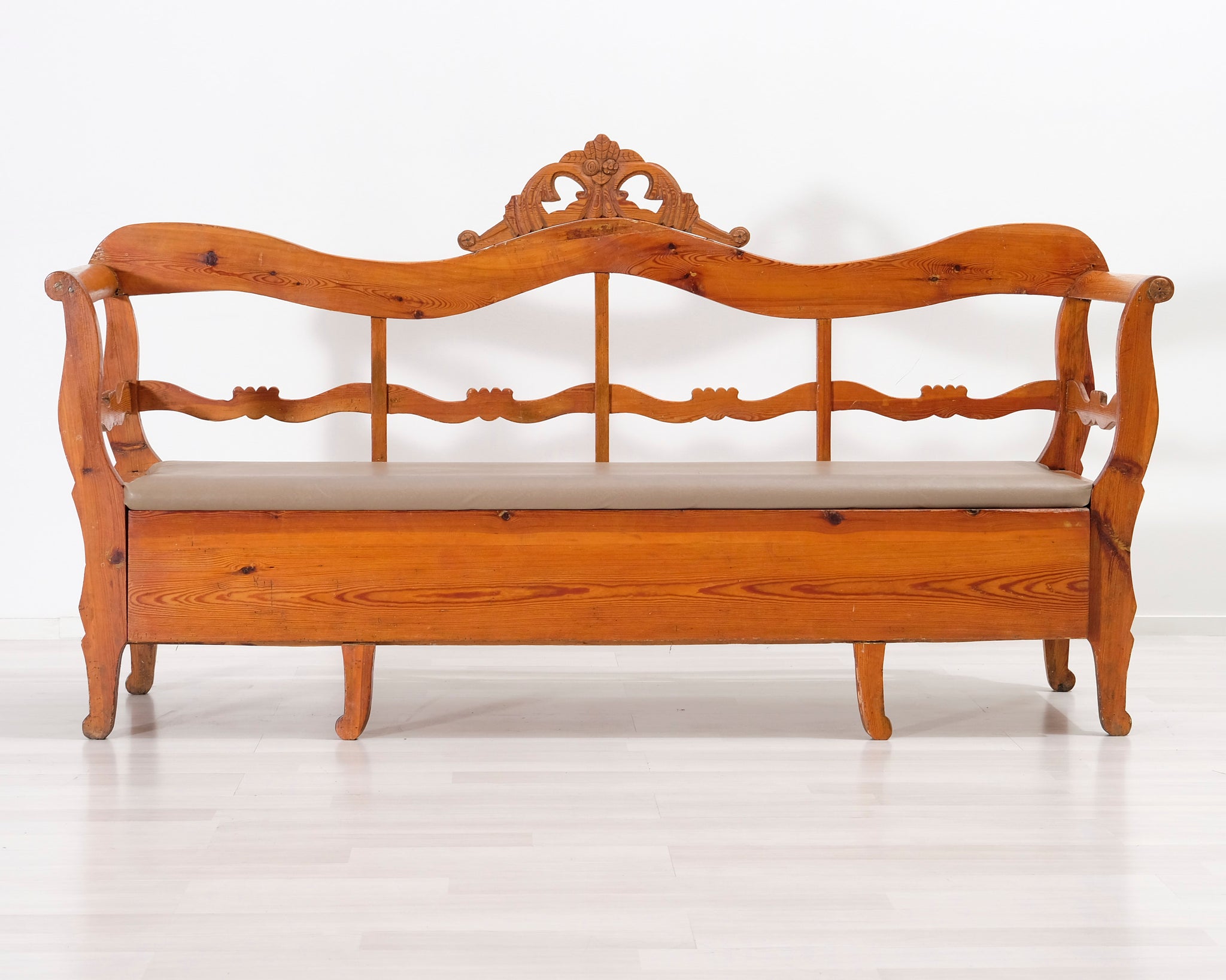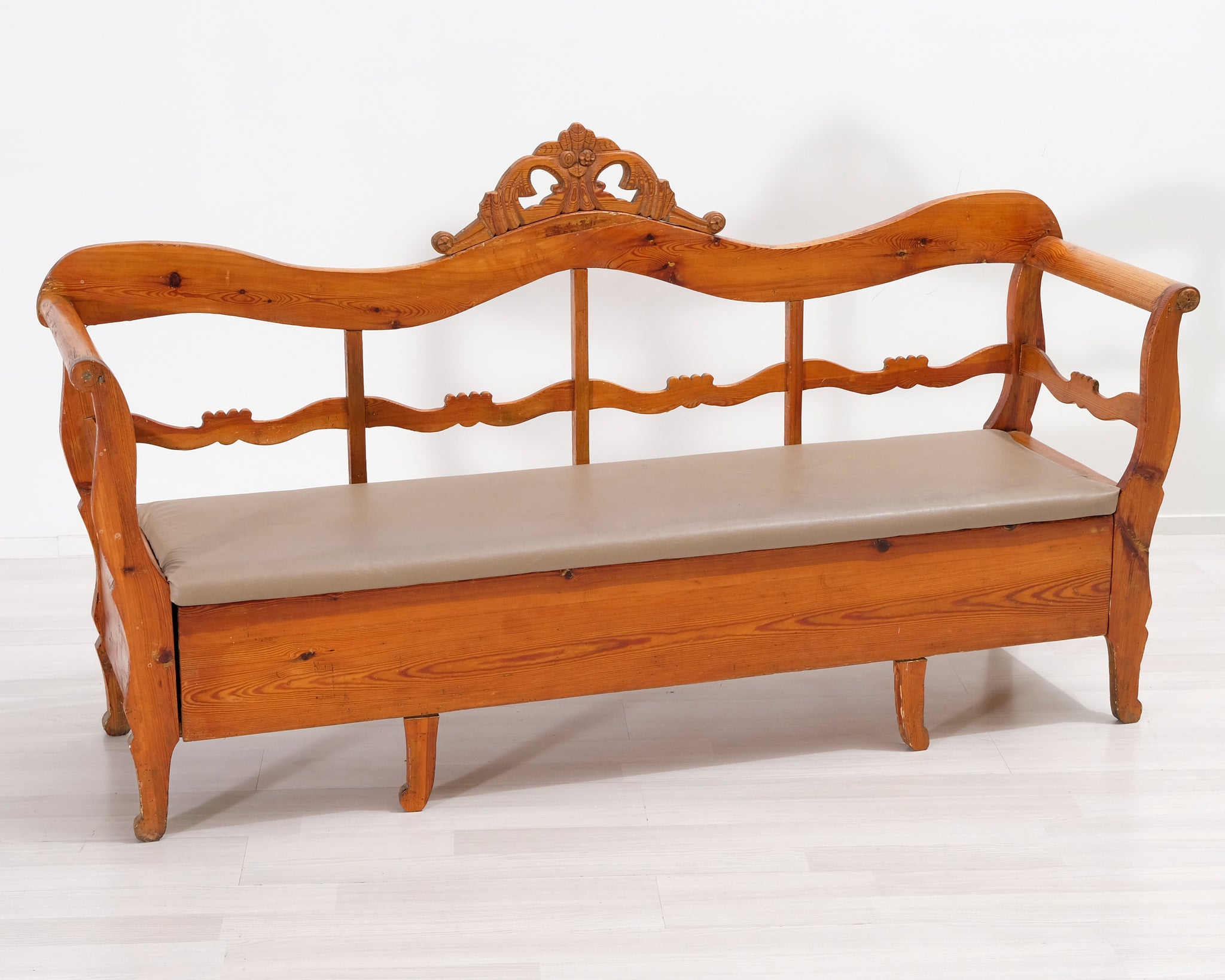 Mäntysohva pehmustetulla istuimella. Istuimen alla on säilytystilaa. Istuinosan voi helposti verhoilla uudelleen omaan sisustukseen sopivalla kankaalla.