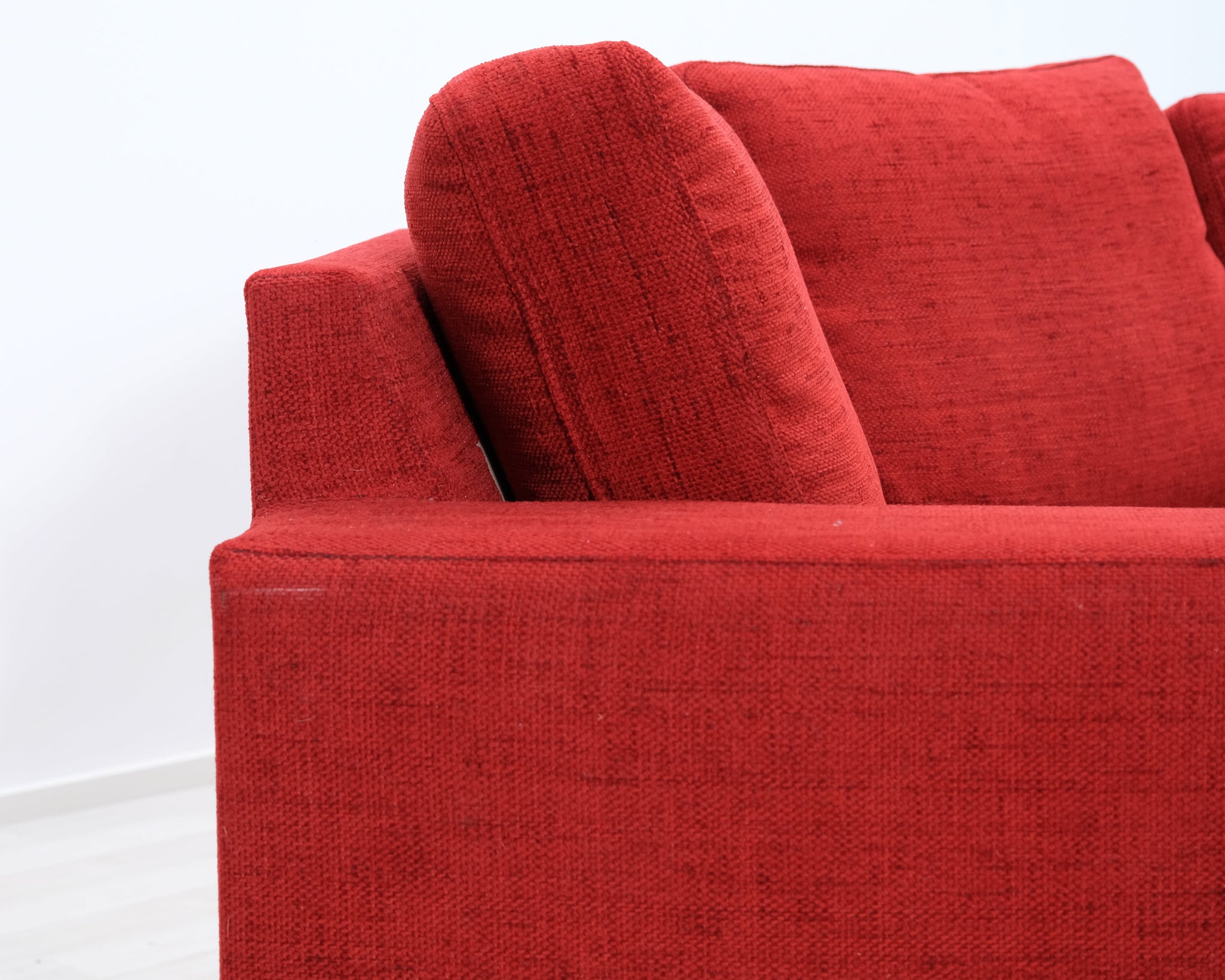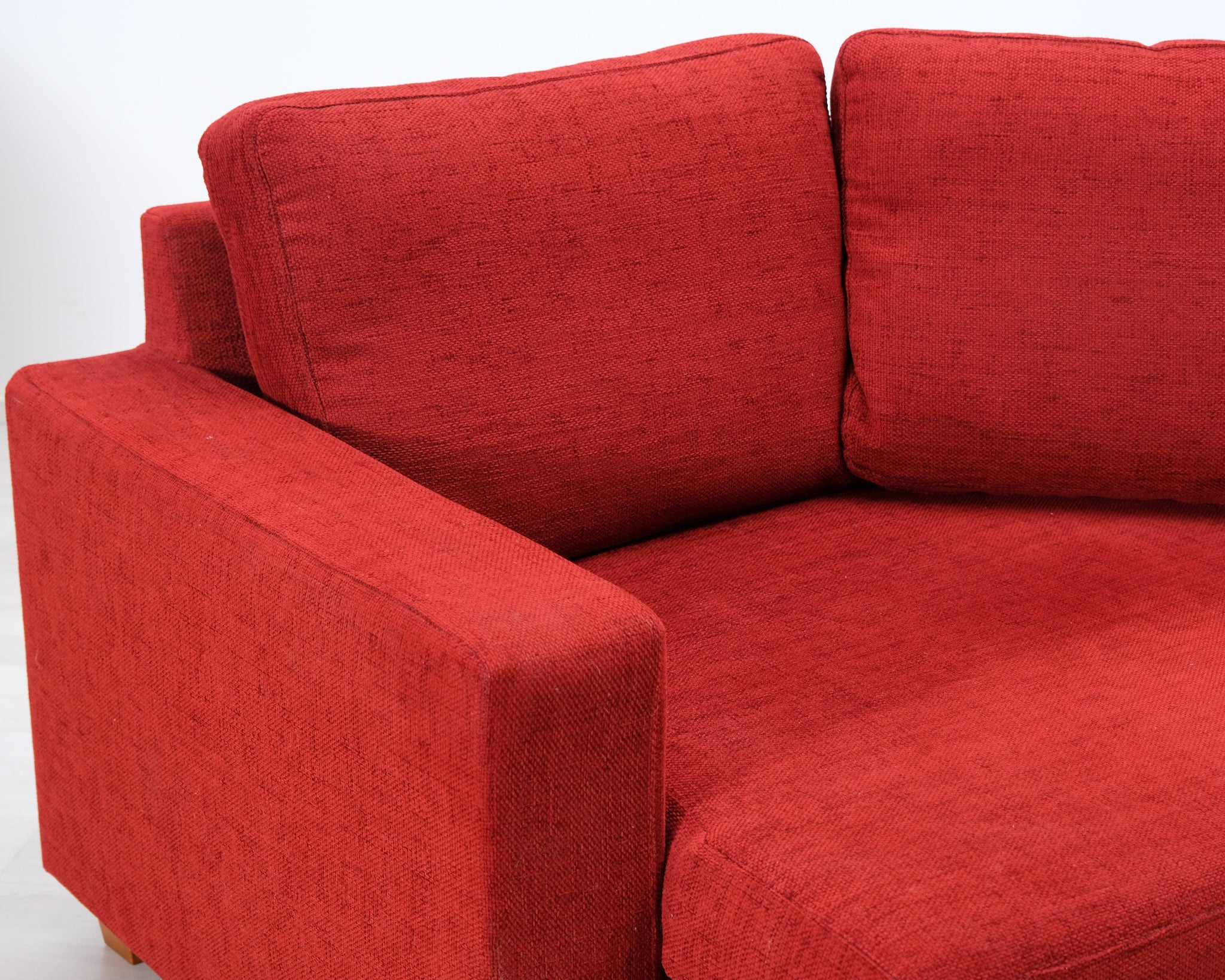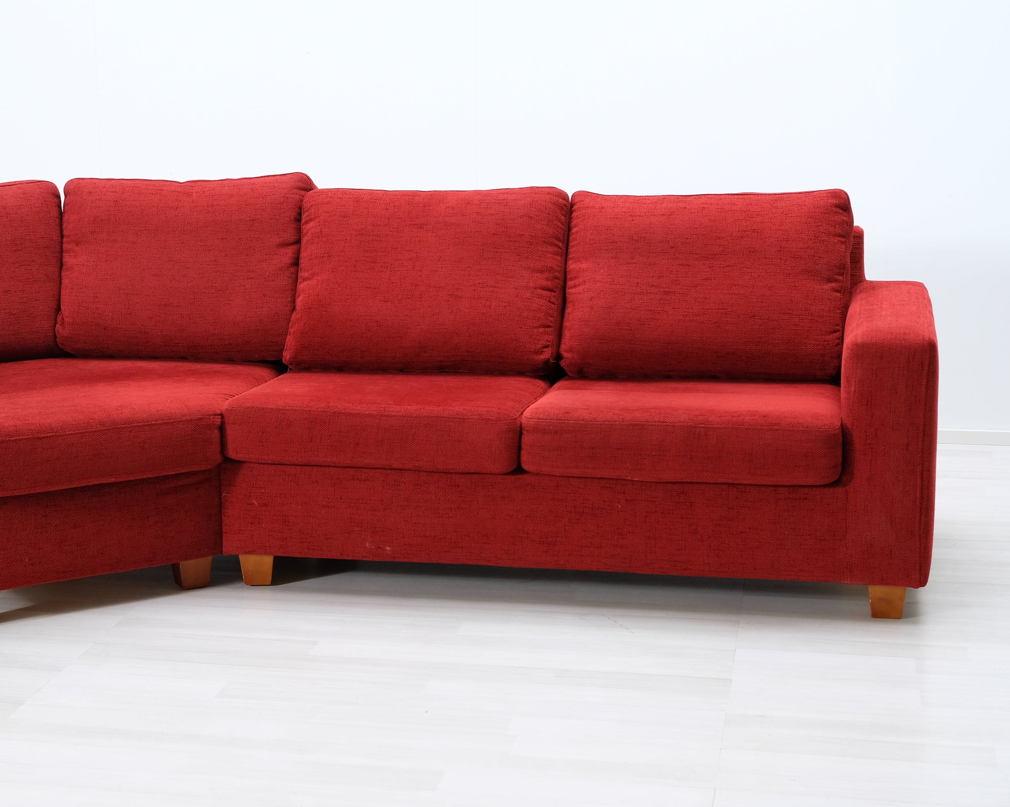 Punainen kangassohva pienellä kulmalla. Sopii neljälle hengelle.