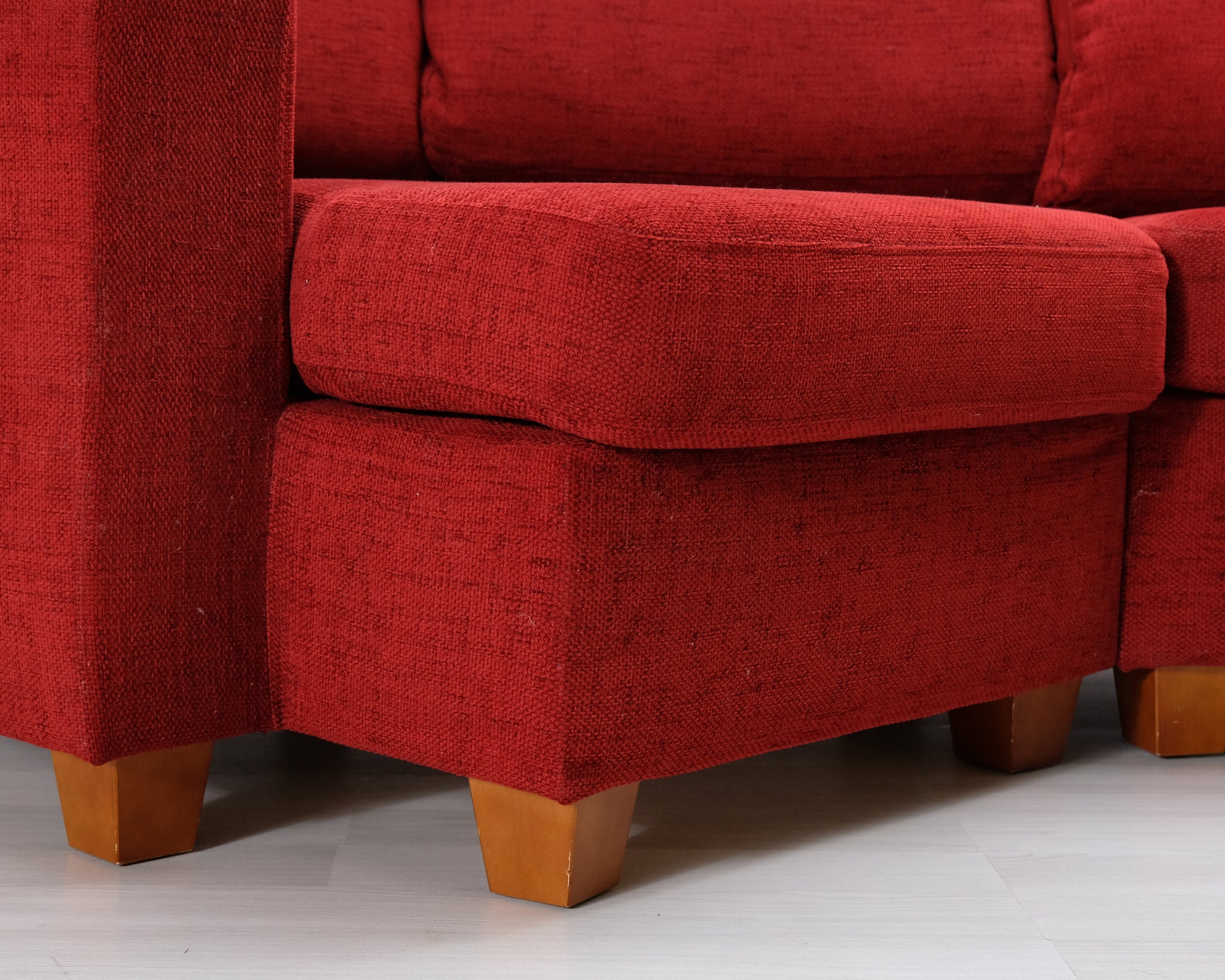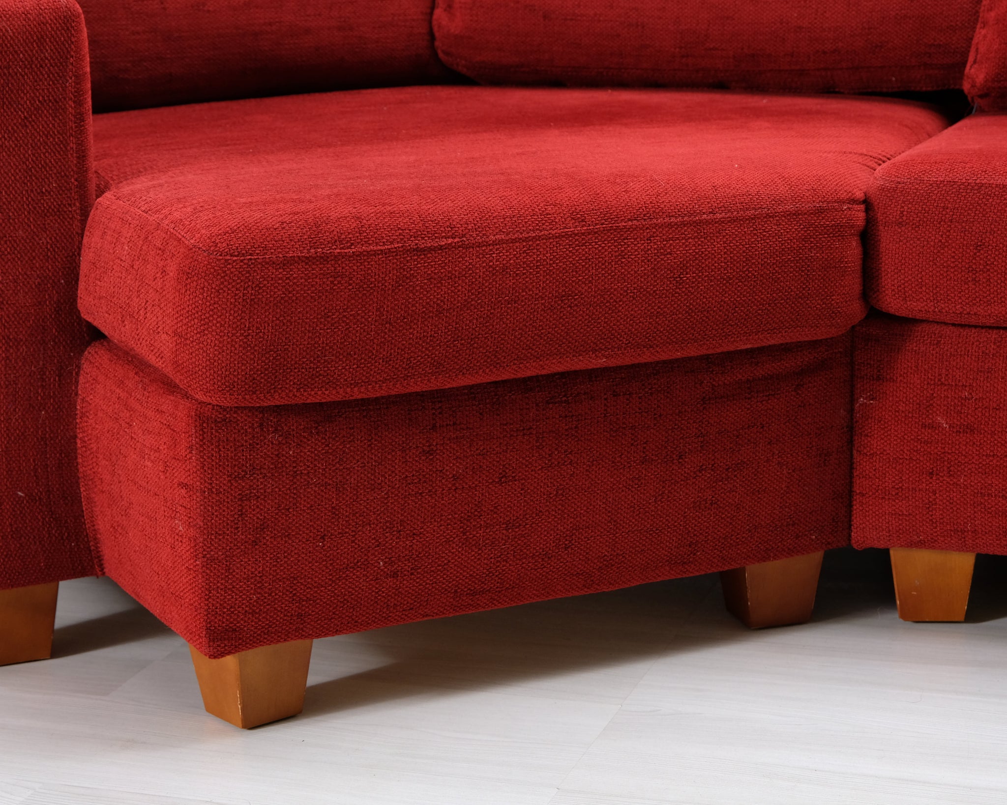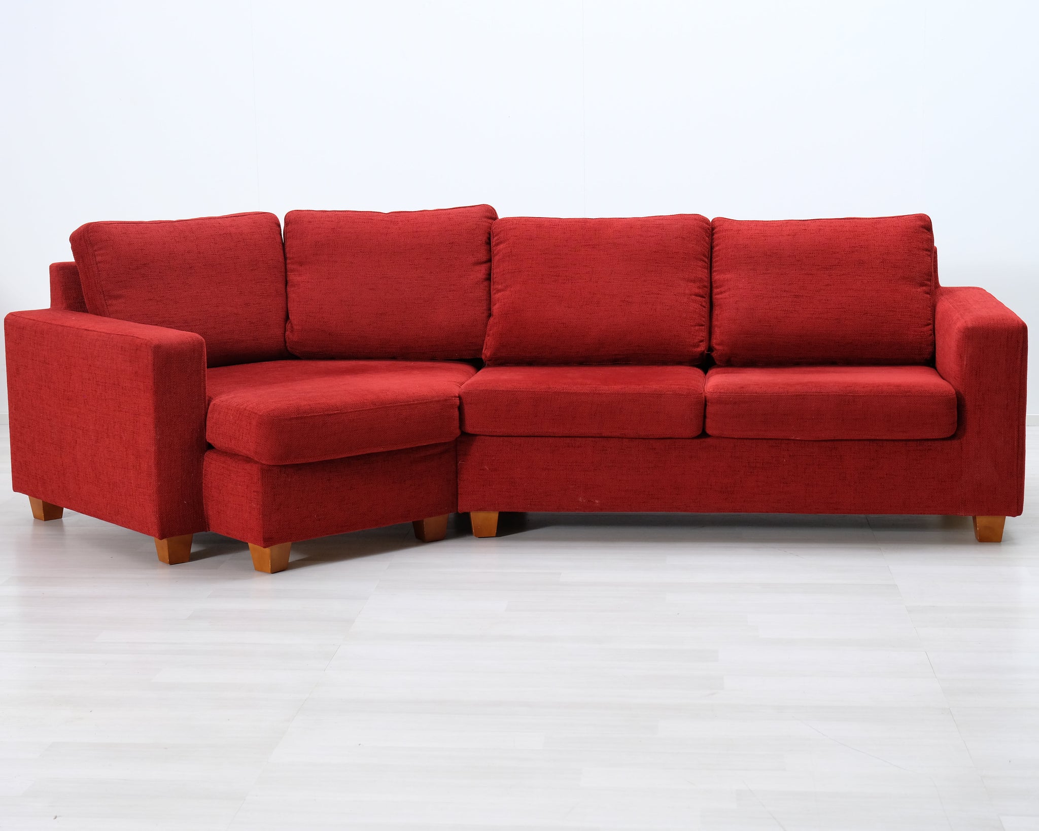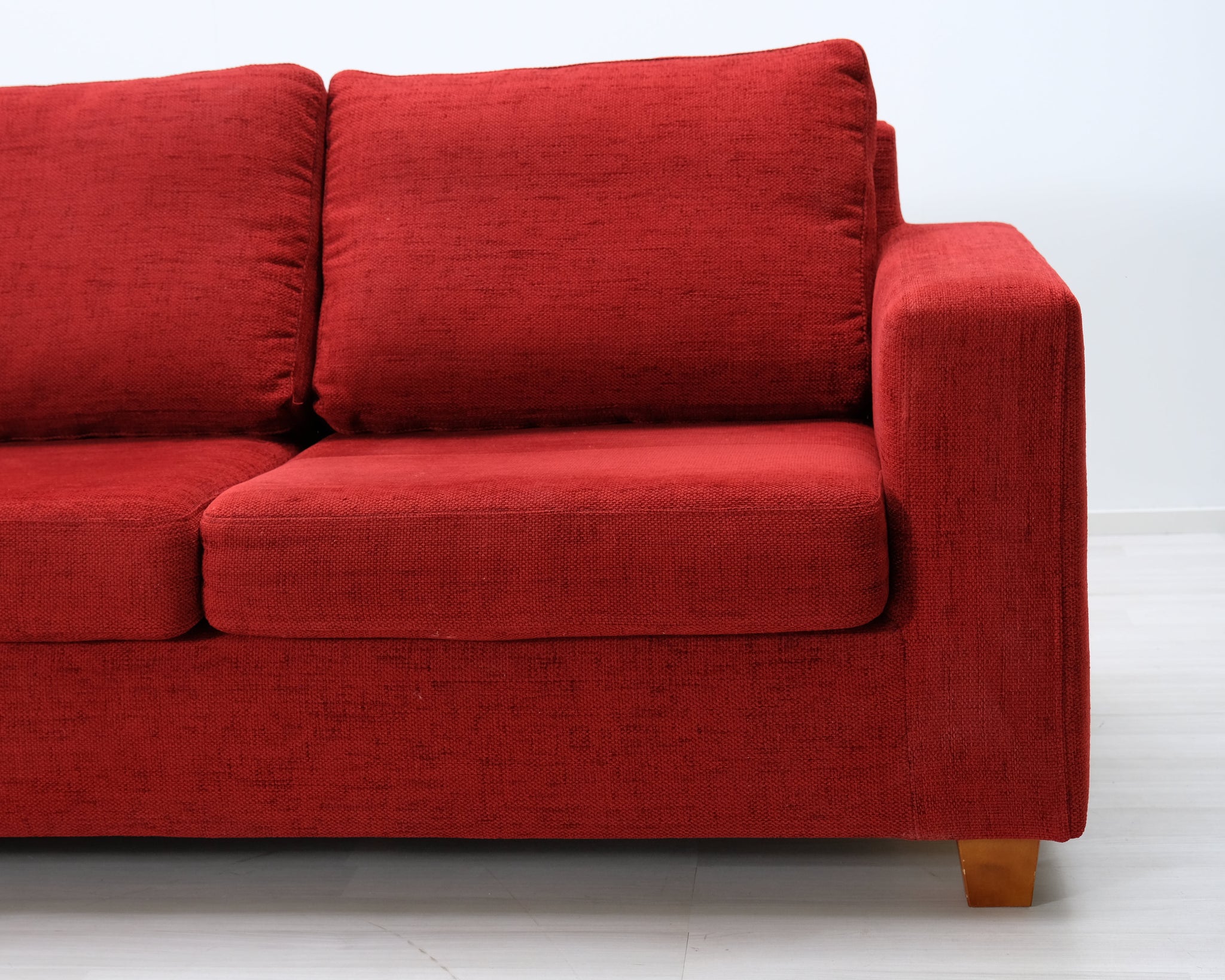 Punainen kangassohva pienellä kulmalla. Sopii neljälle hengelle.