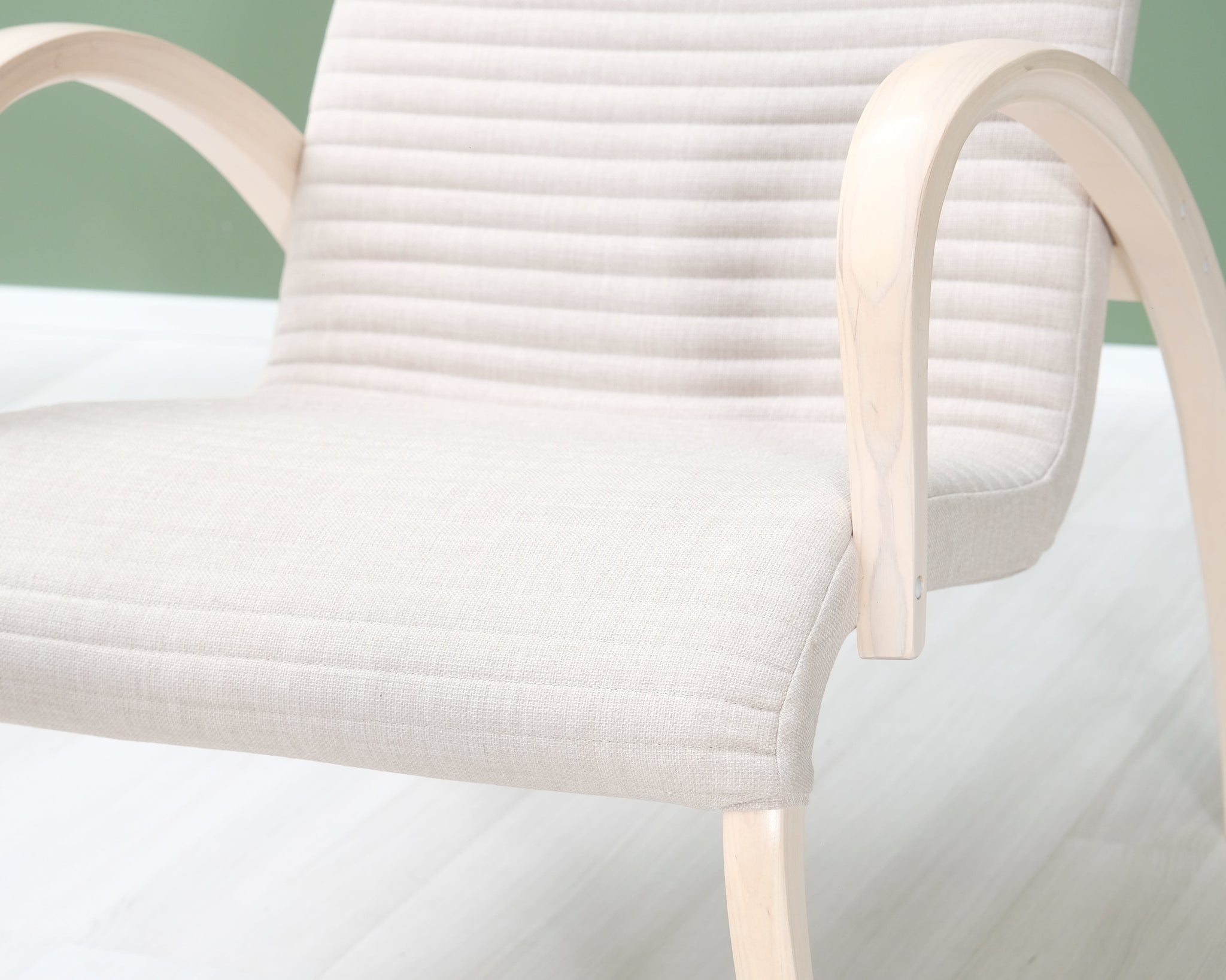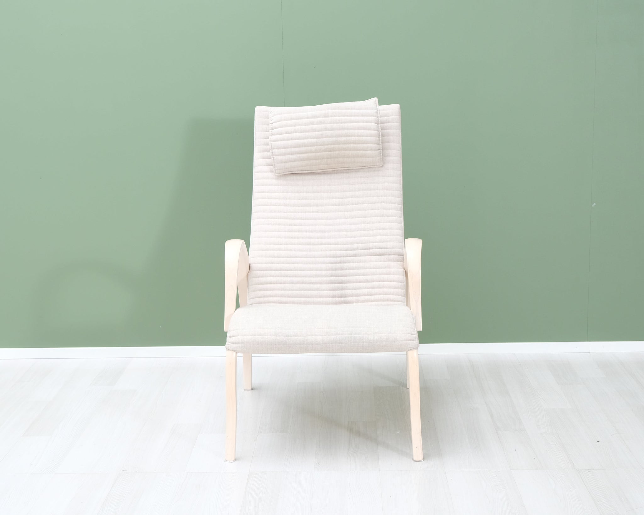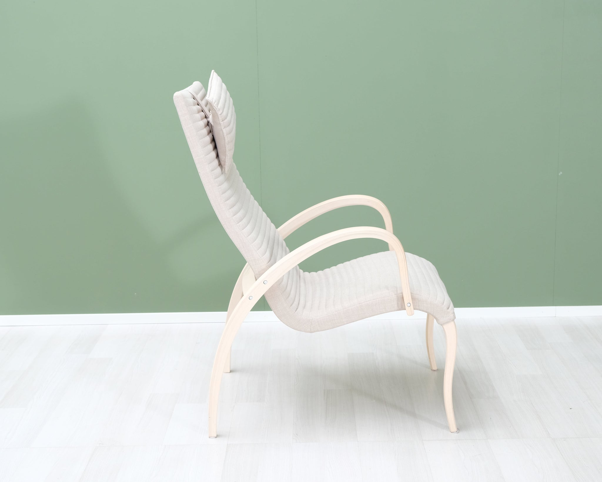 Askon valmistama Harlekiini-lepotuoli on suomalainen klassikko. Jalat ja käsinojat muotoonpuristetusta koivusta ja harmaa kangasverhoilu. Niskatyyny ja rahi tuovat lepotuoliin lisämukavuutta.