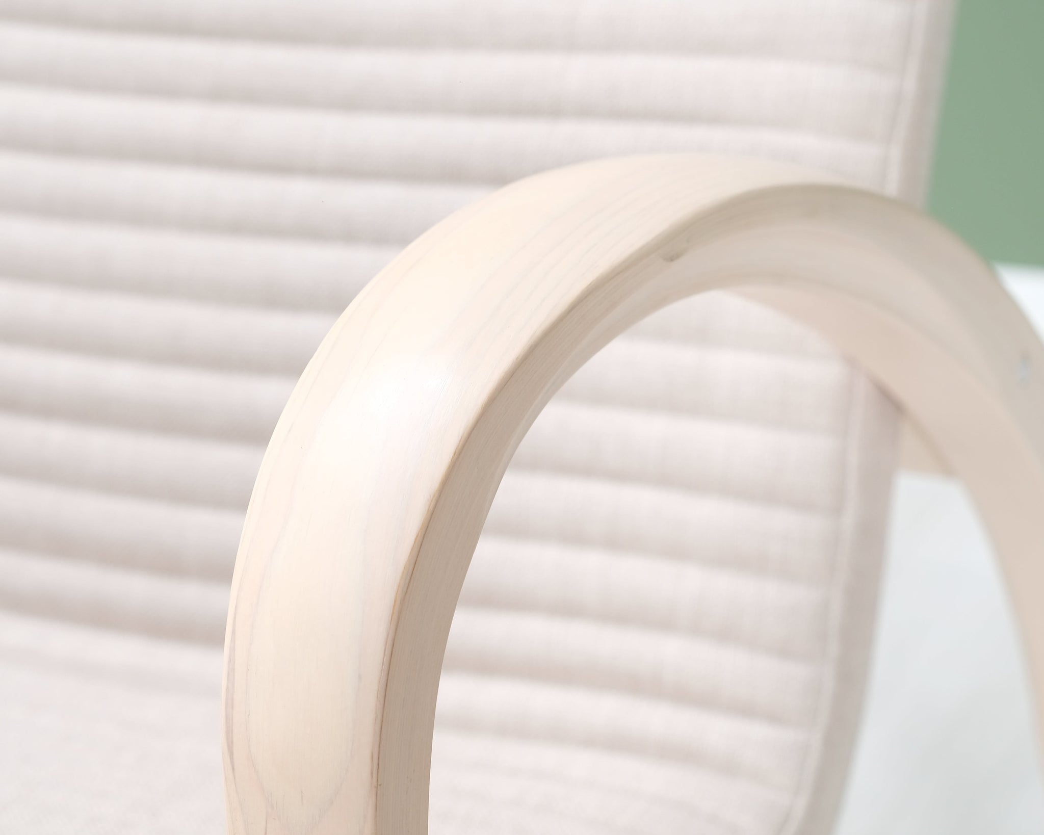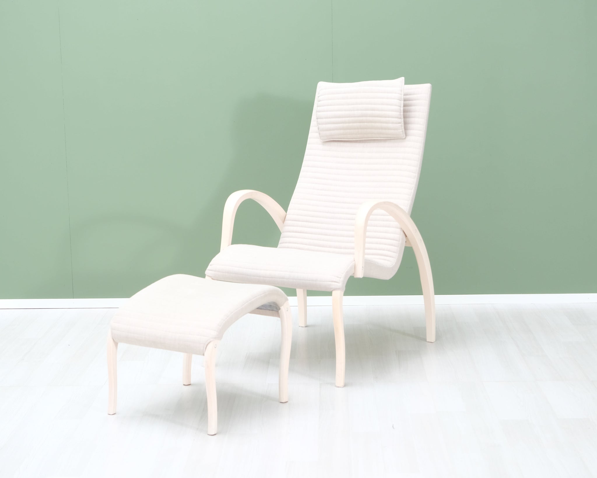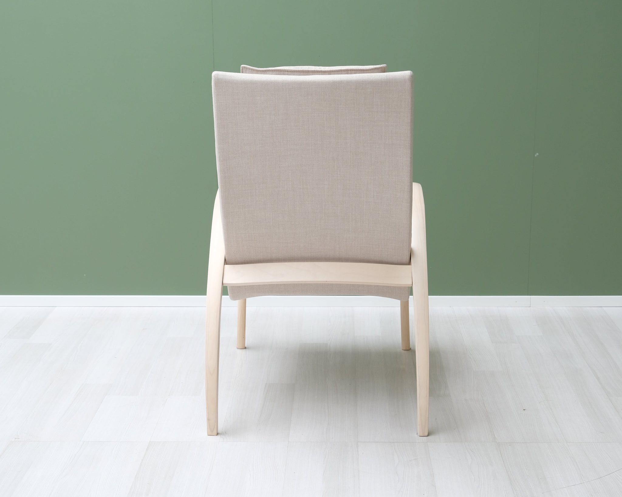 Askon valmistama Harlekiini-lepotuoli on suomalainen klassikko. Jalat ja käsinojat muotoonpuristetusta koivusta ja harmaa kangasverhoilu. Niskatyyny ja rahi tuovat lepotuoliin lisämukavuutta.