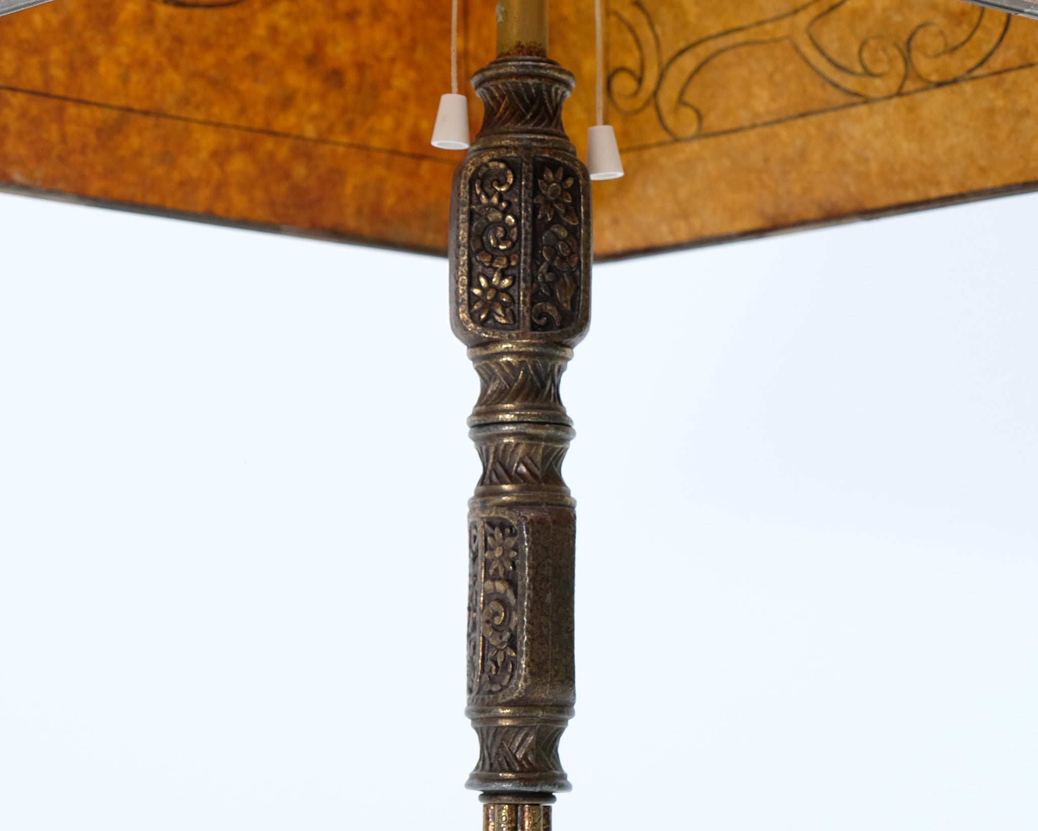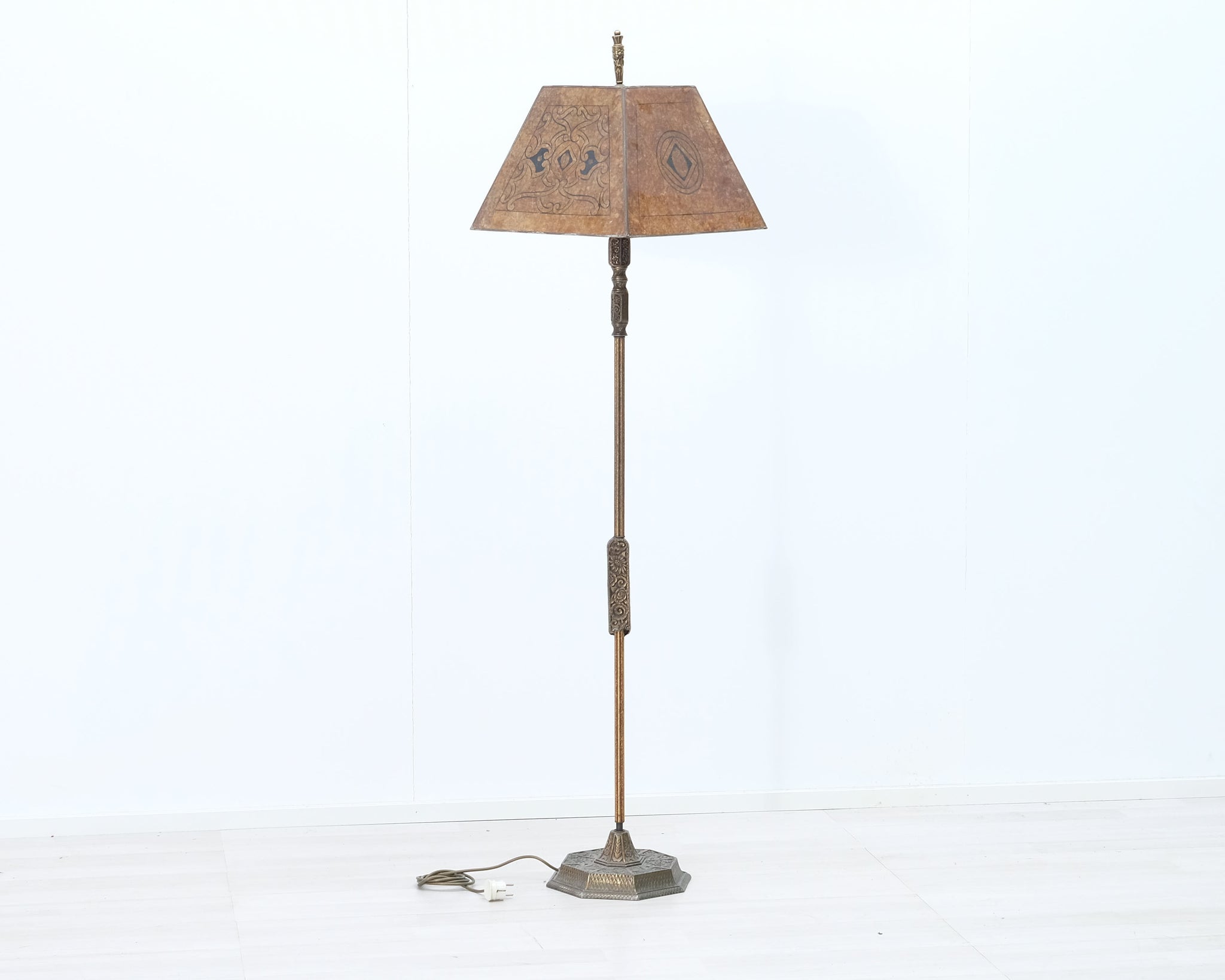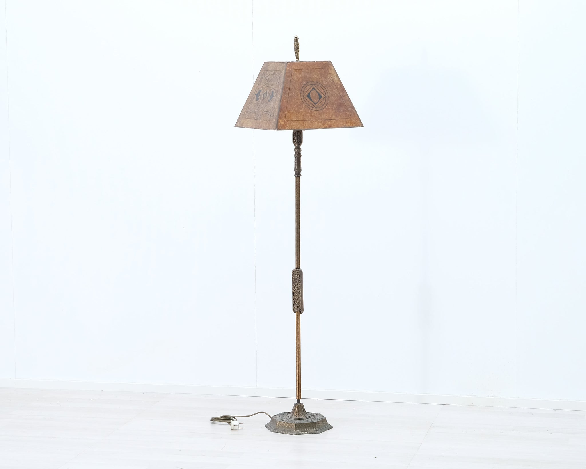 Jugendtyylinen vanha lattiavalaisin 1900-luvun alusta. Koristeellisia yksityiskohtia jalassa ja varjostimessa