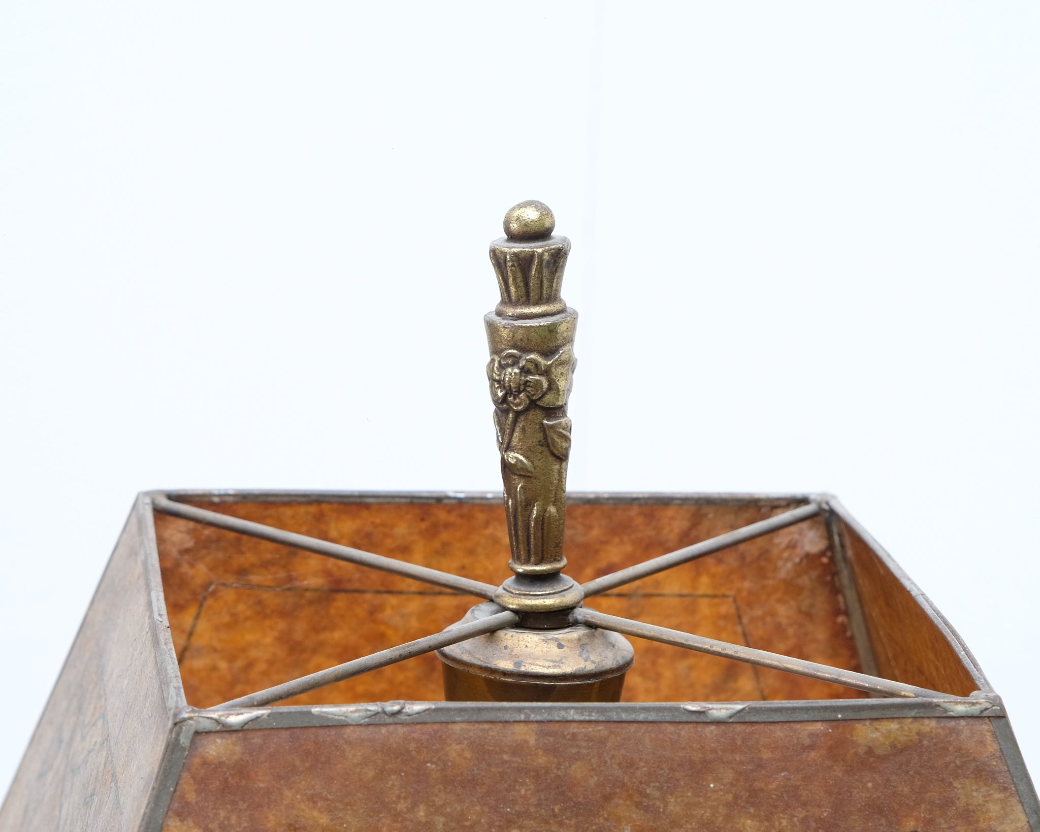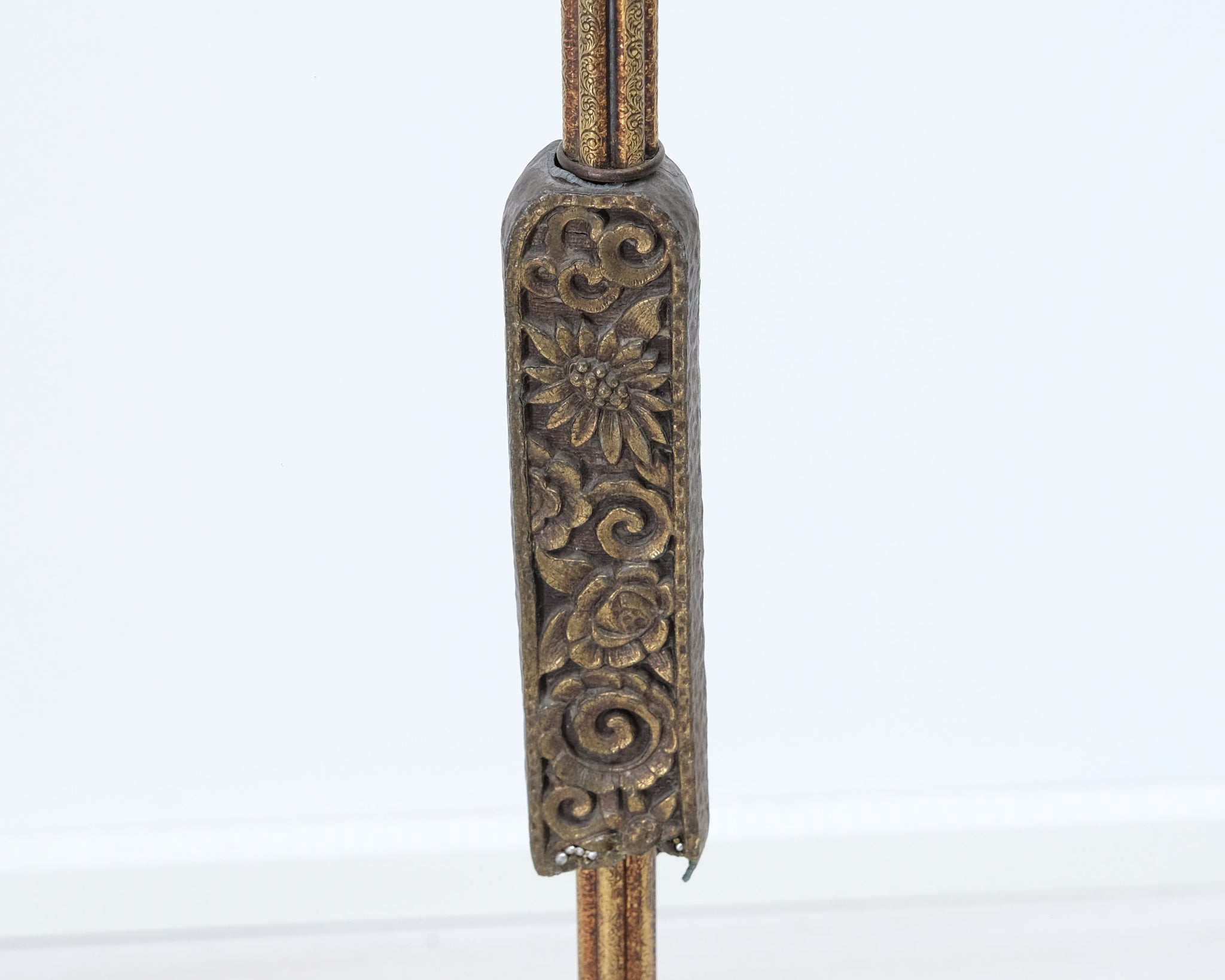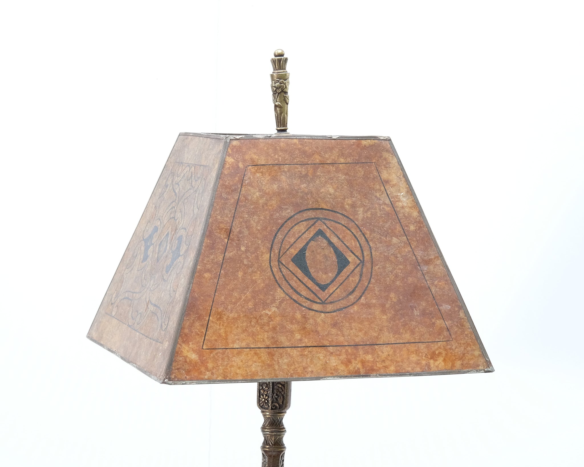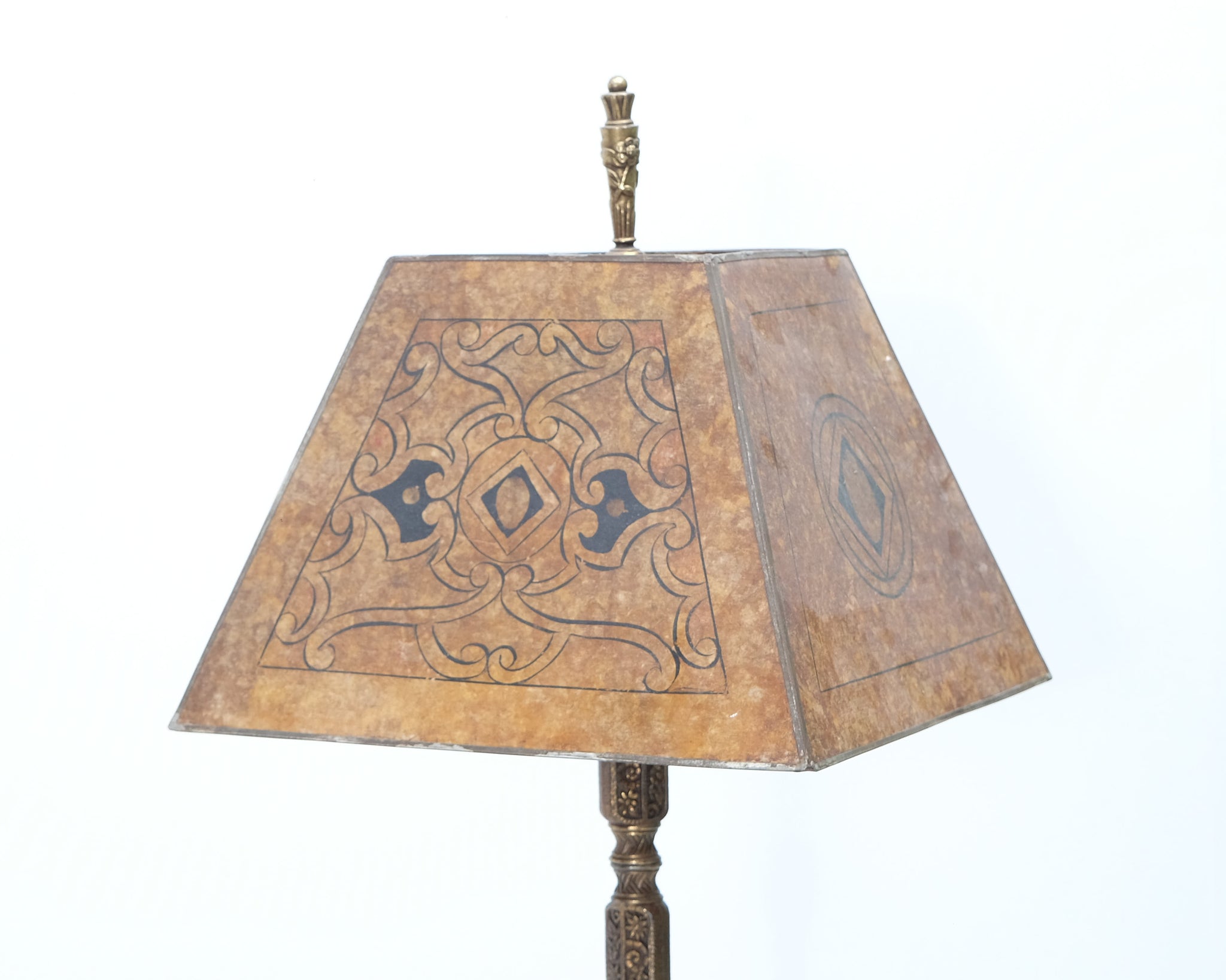 Jugendtyylinen vanha lattiavalaisin 1900-luvun alusta. Koristeellisia yksityiskohtia jalassa ja varjostimessa