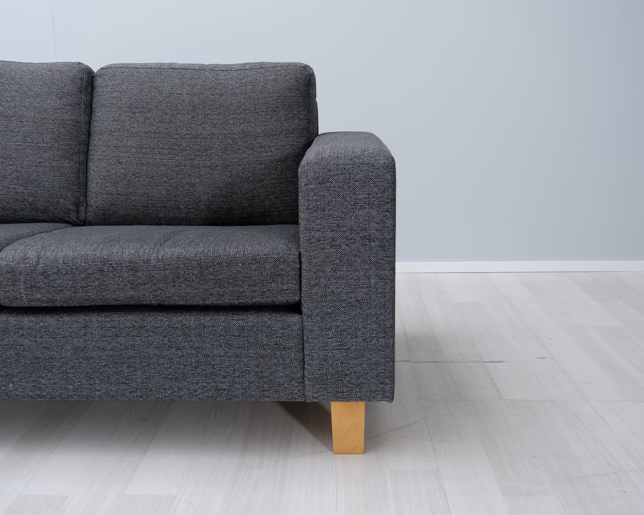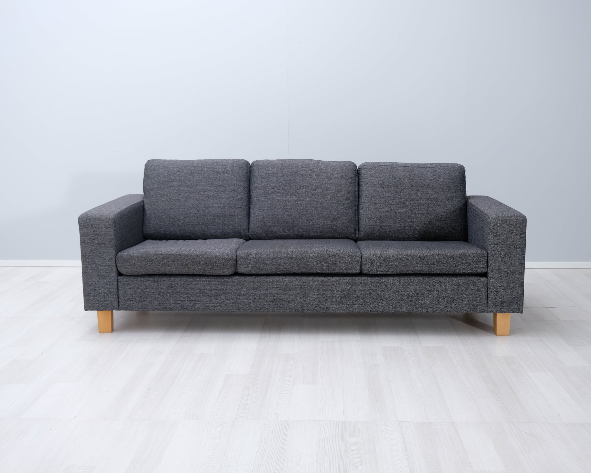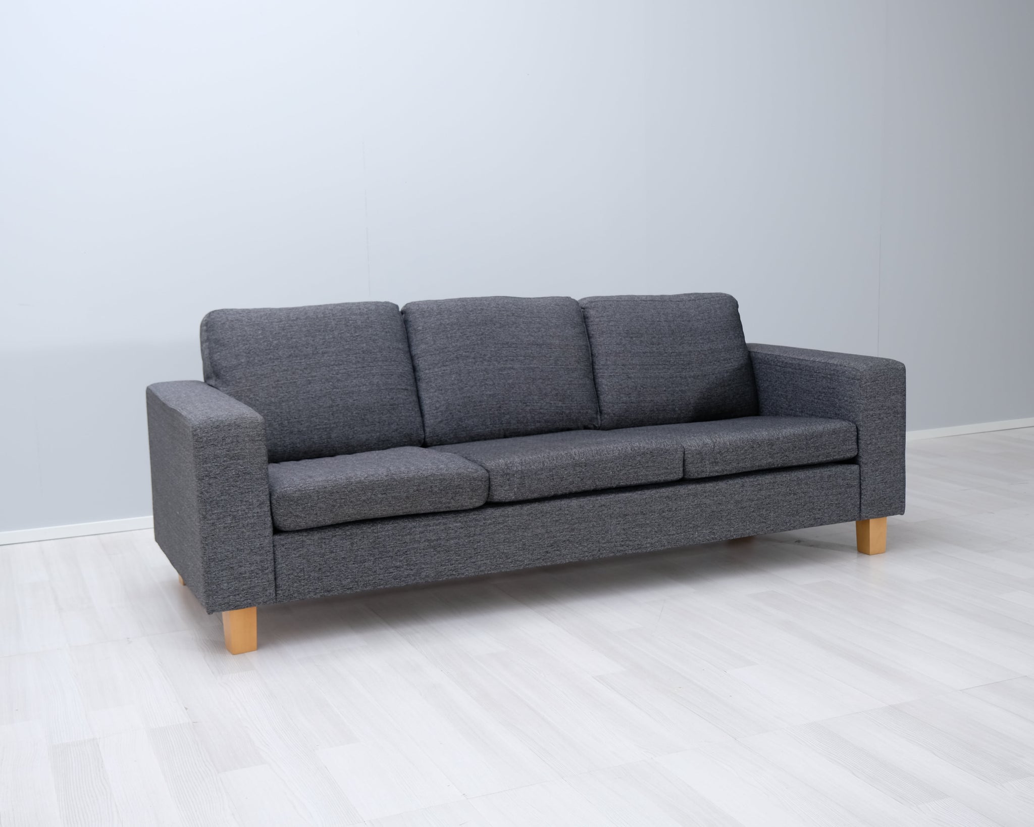 Kolmen istuttava sohva tummanharmaalla kangasverhoilulla.