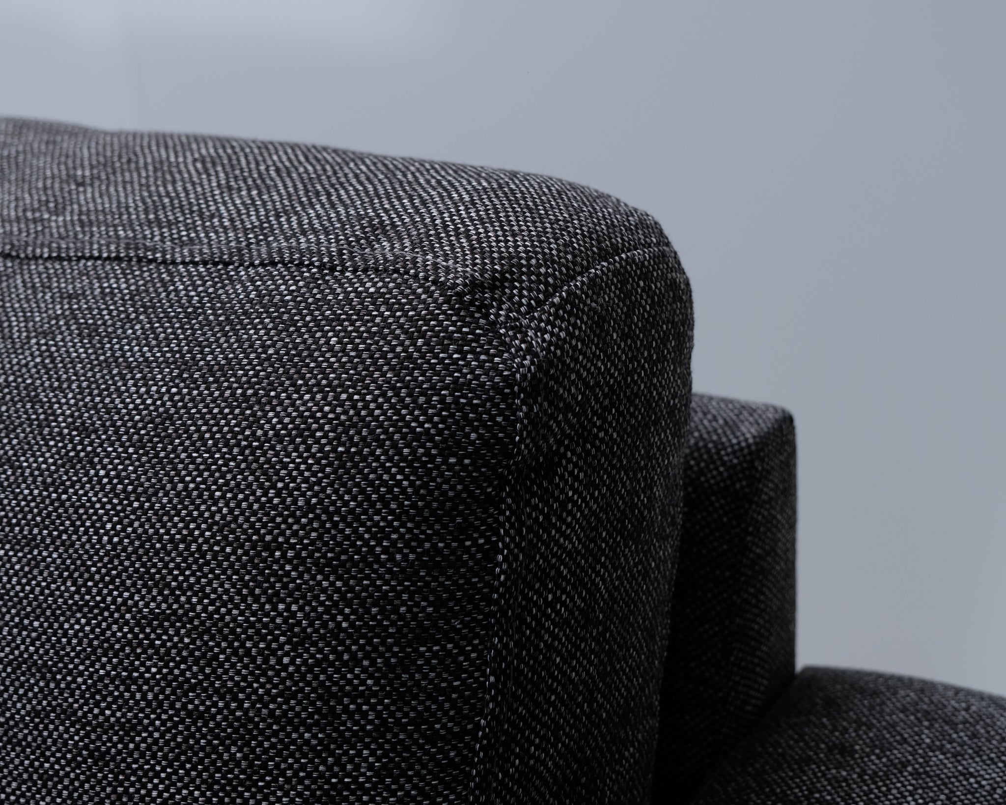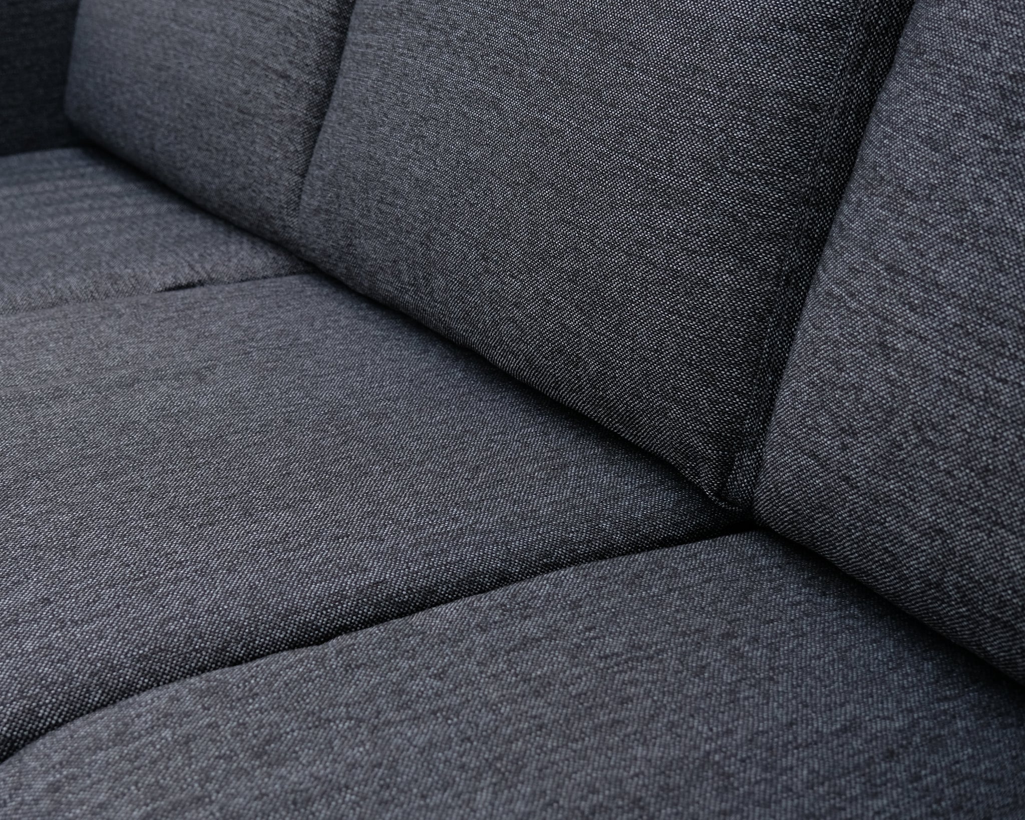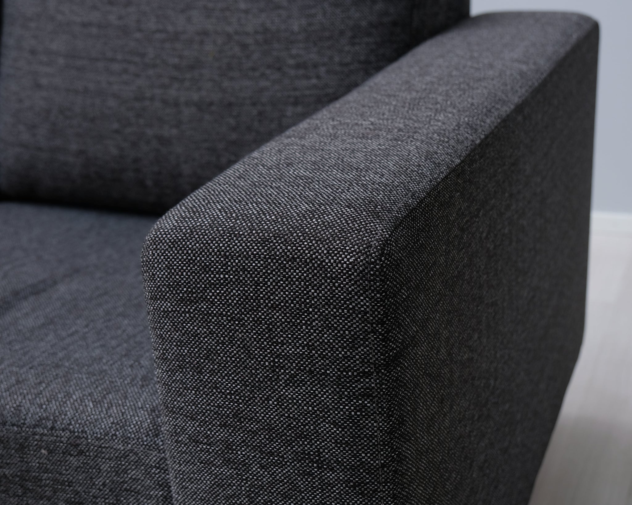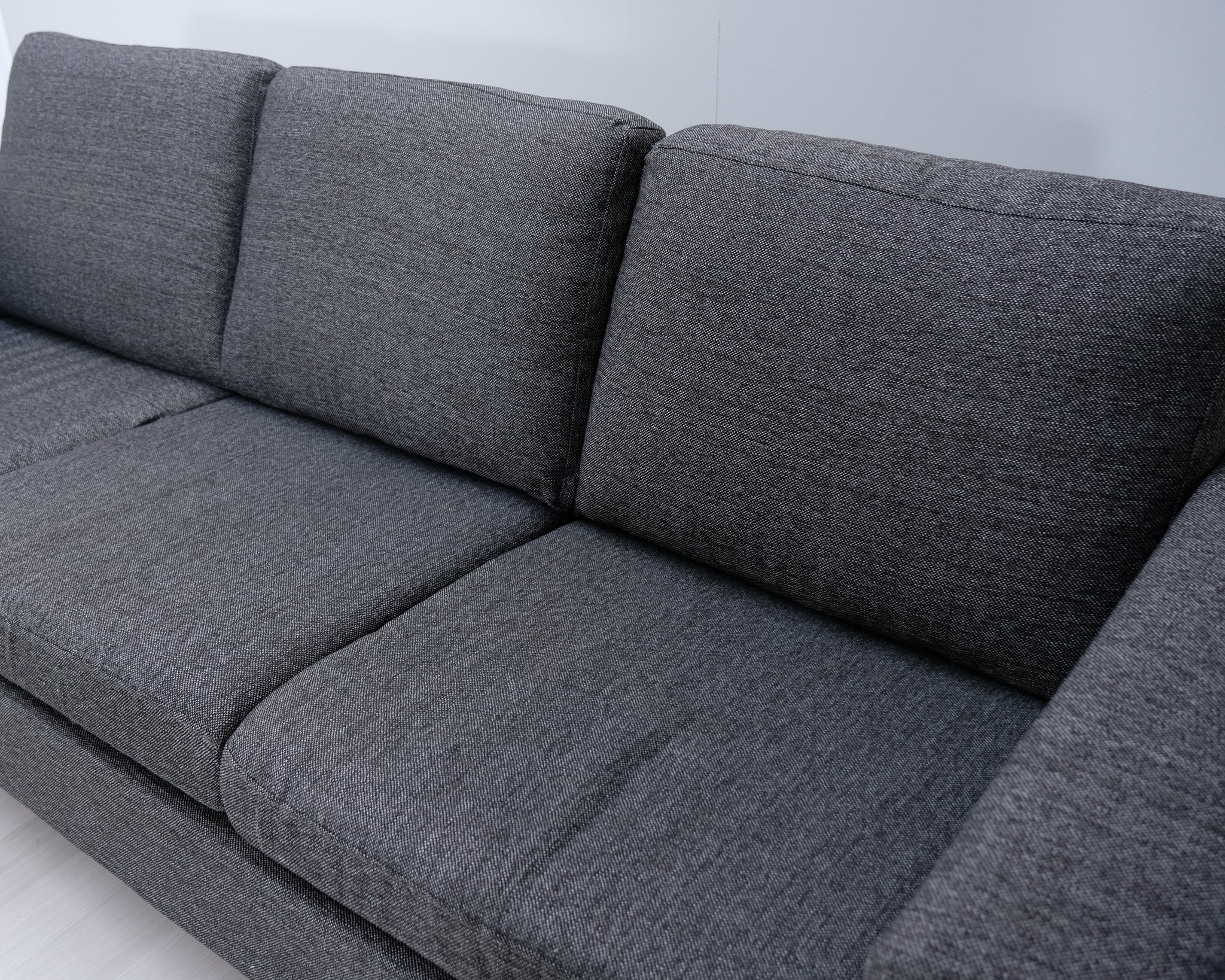 Kolmen istuttava sohva tummanharmaalla kangasverhoilulla.