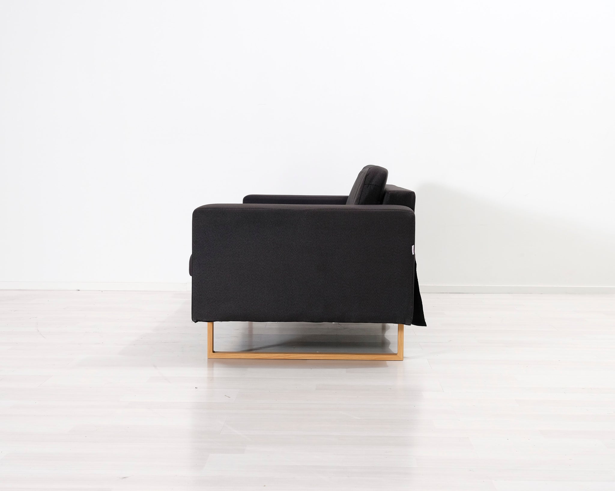 Kolmen istuttava musta kangassohva. Metallijalat ja irrotettavat päälliset.
