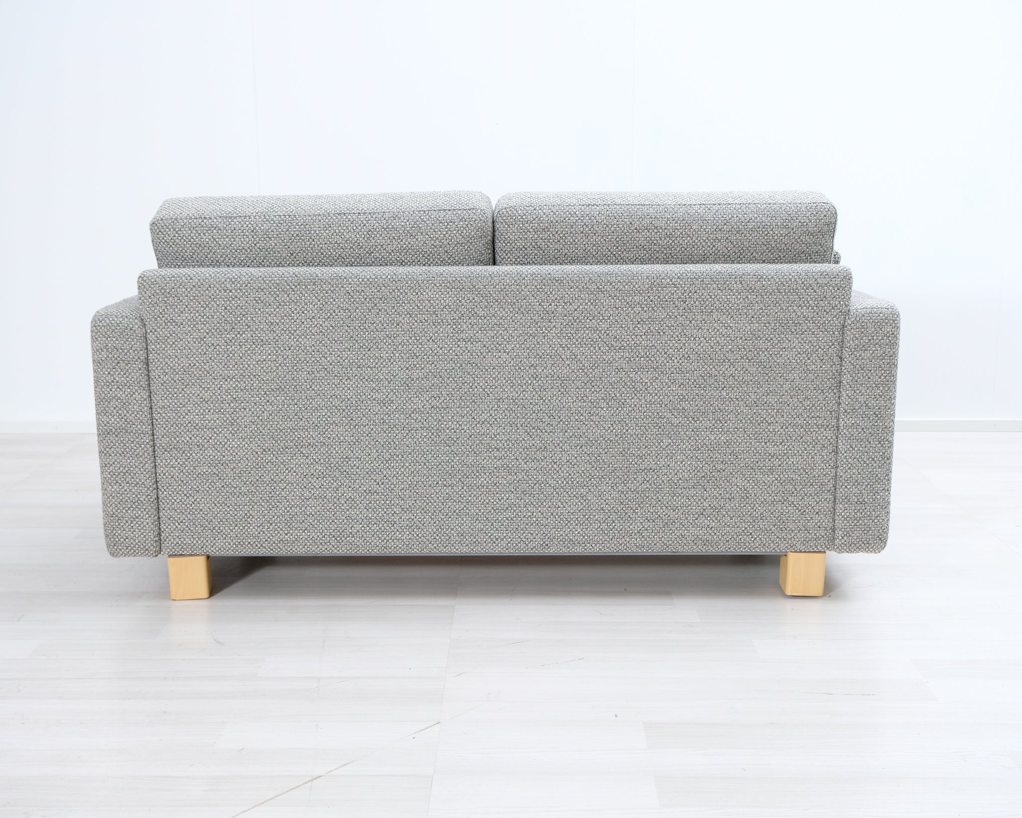 Kahden istuttava kompakti vuodesohva. Harmaa kangasverhoilu.