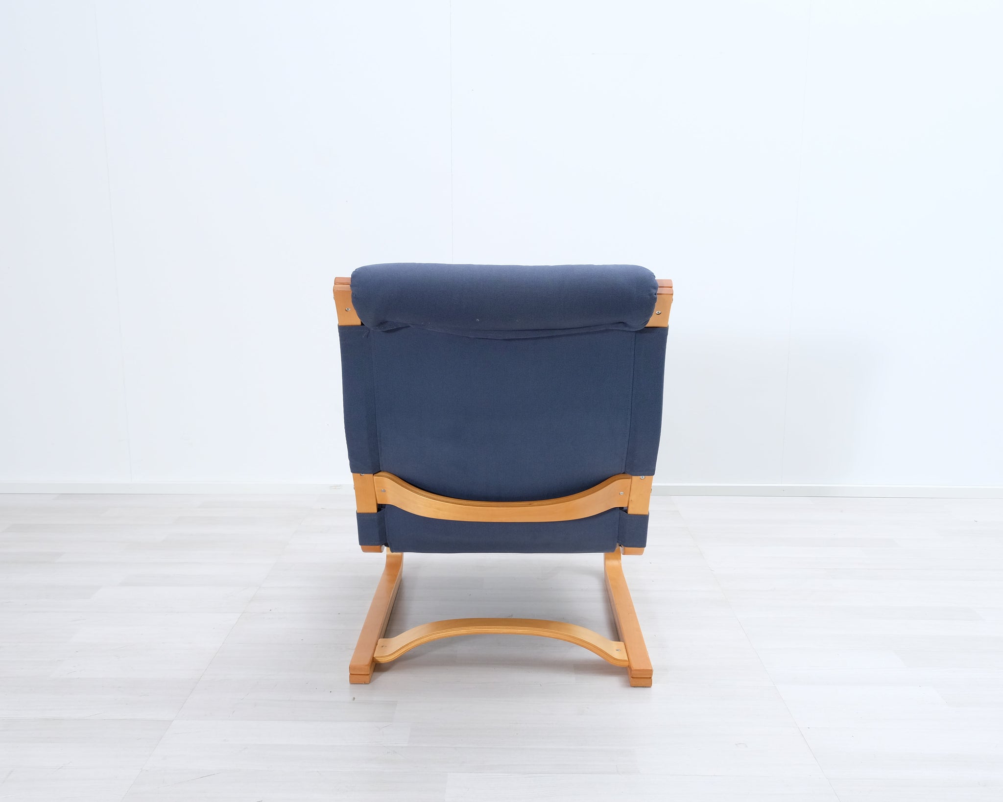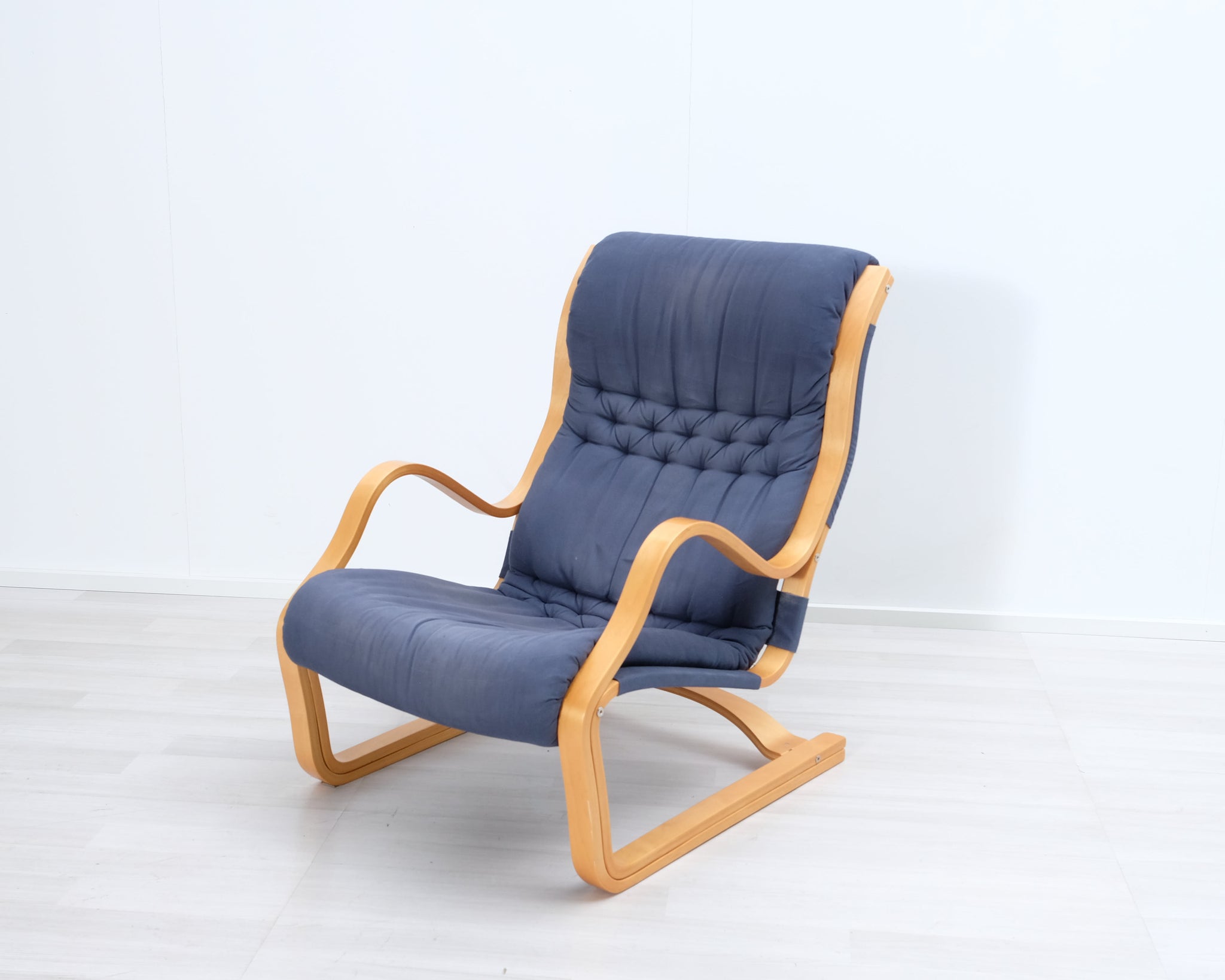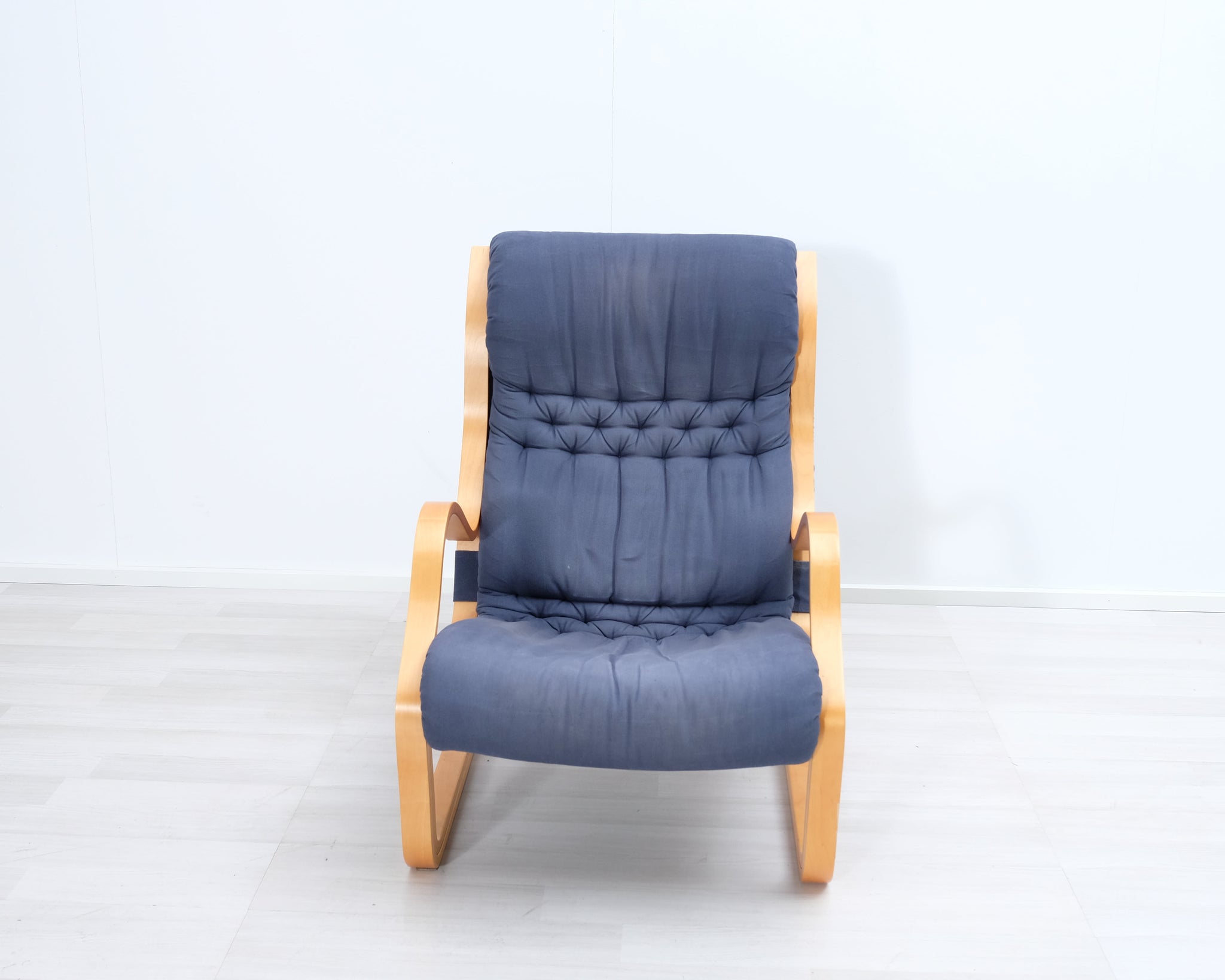 Esko Pajamiehen 1970-luvulla suunnittelema Koivutaru-nojatuoli. Sininen kangasverhoilu ja puinen runko.