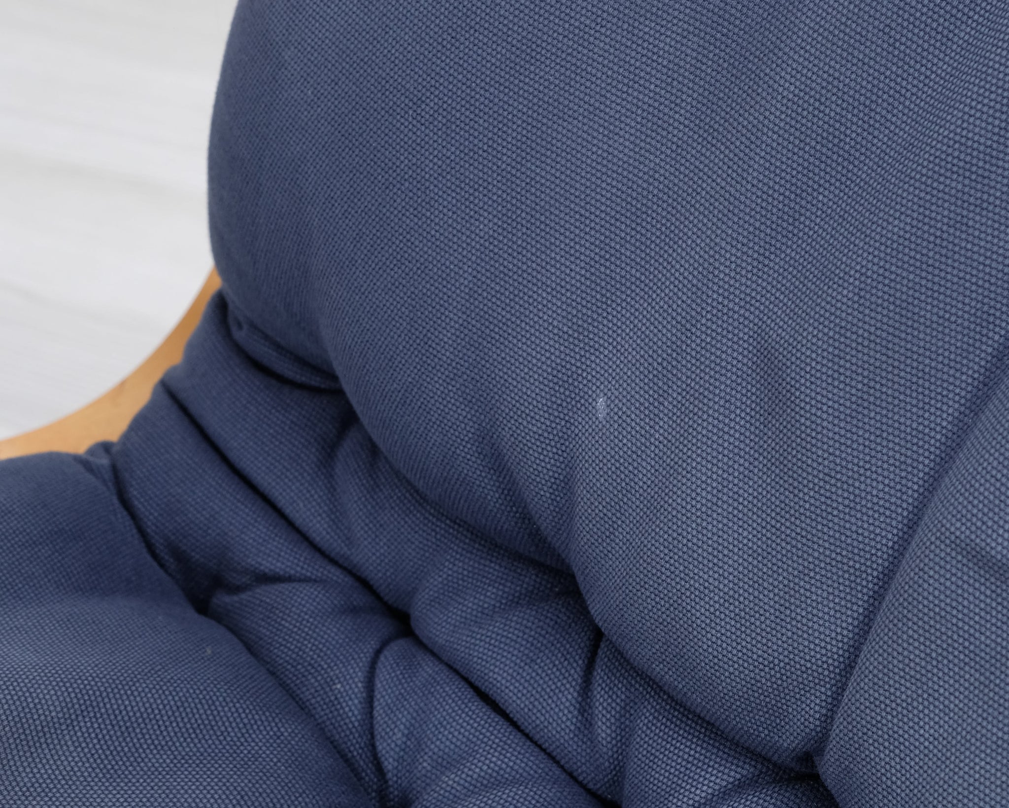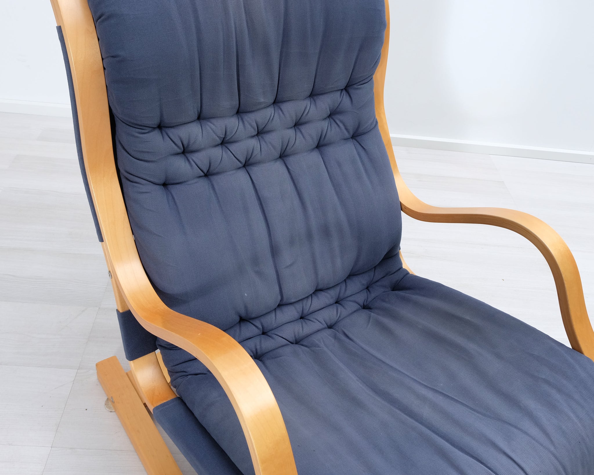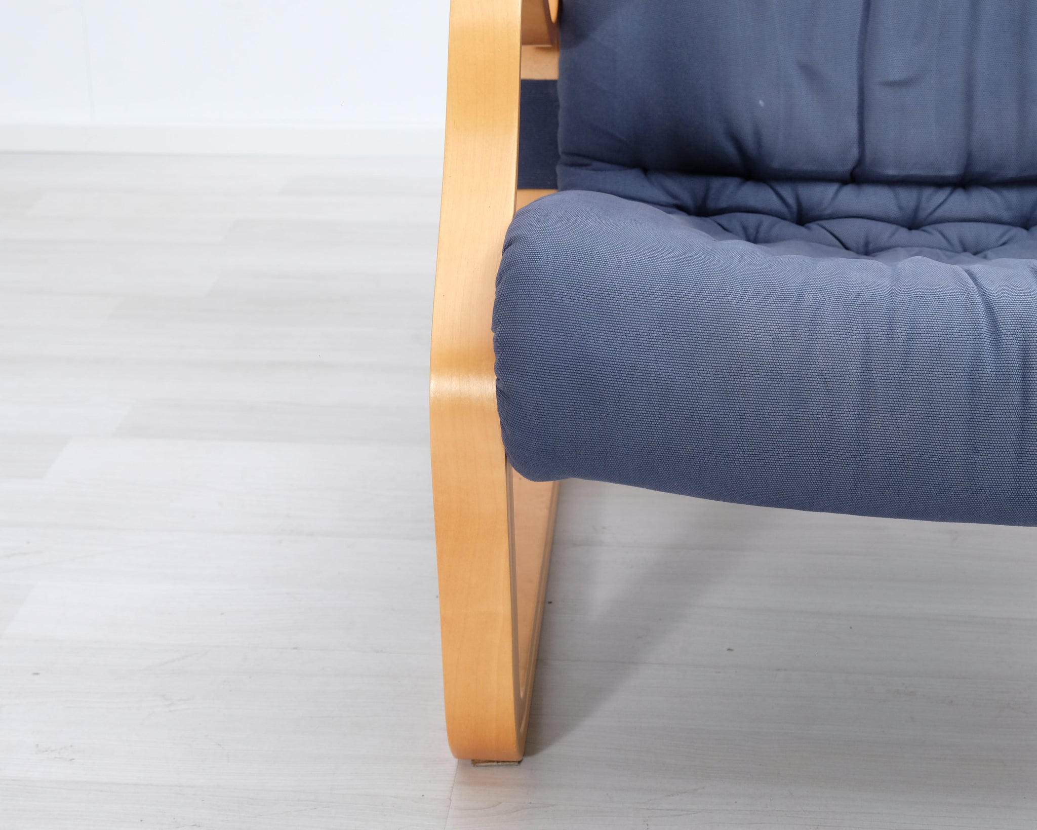 Esko Pajamiehen 1970-luvulla suunnittelema Koivutaru-nojatuoli. Sininen kangasverhoilu ja puinen runko.
