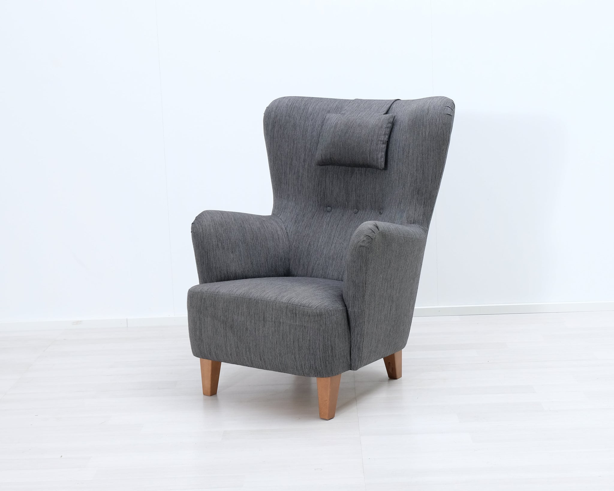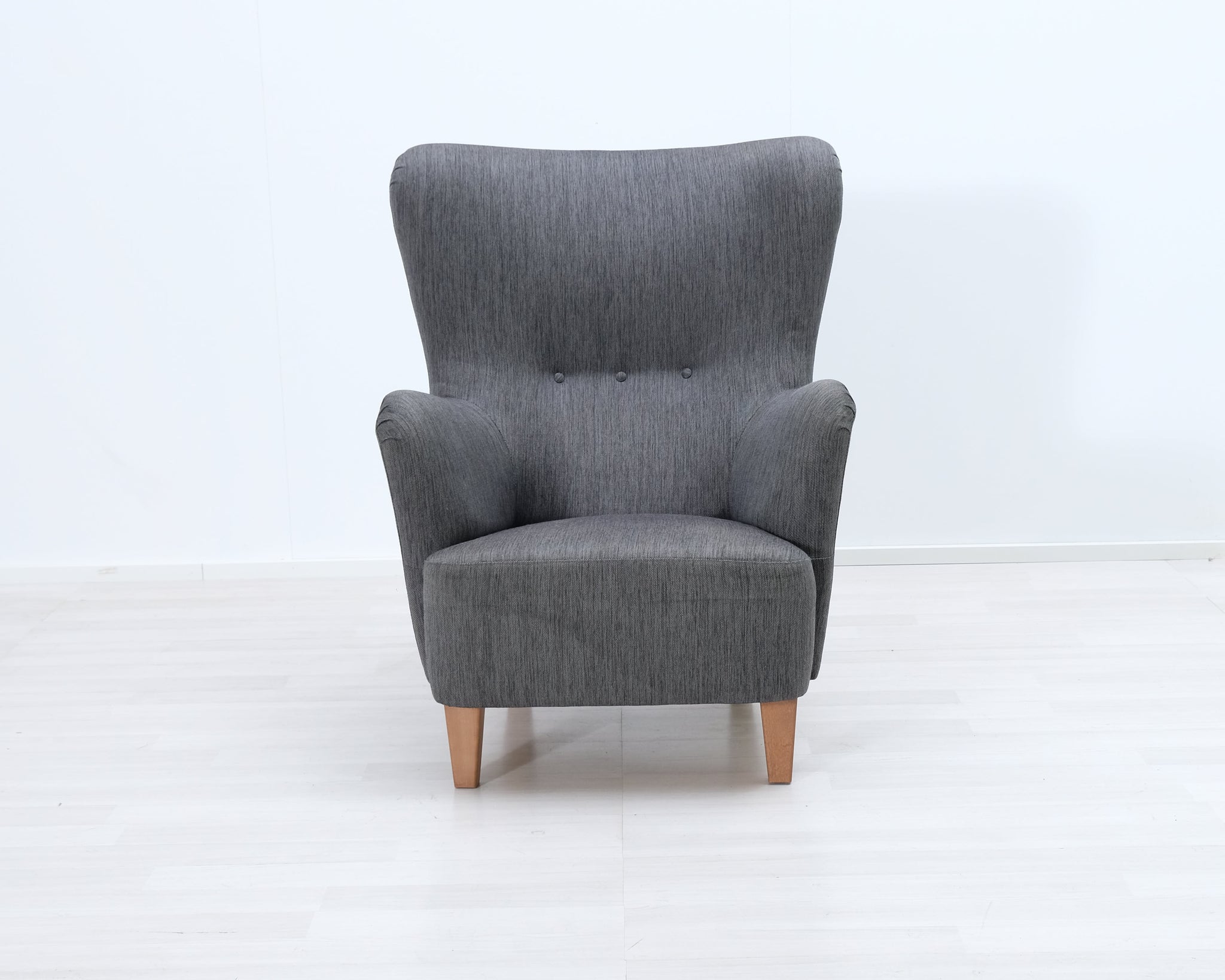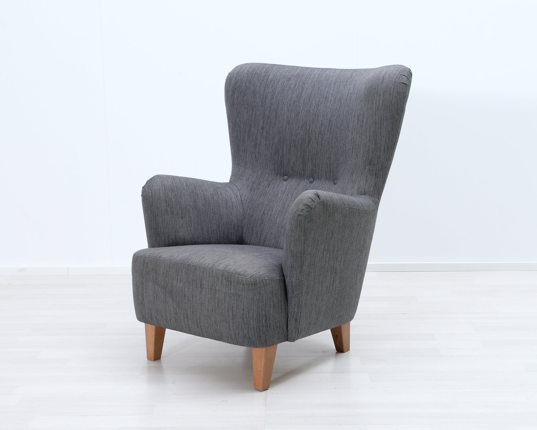 Askon Richard-nojatuoli harmaalla kangasverhoilulla. Klassikkonojatuolin malli on peräisin 40-luvulta.