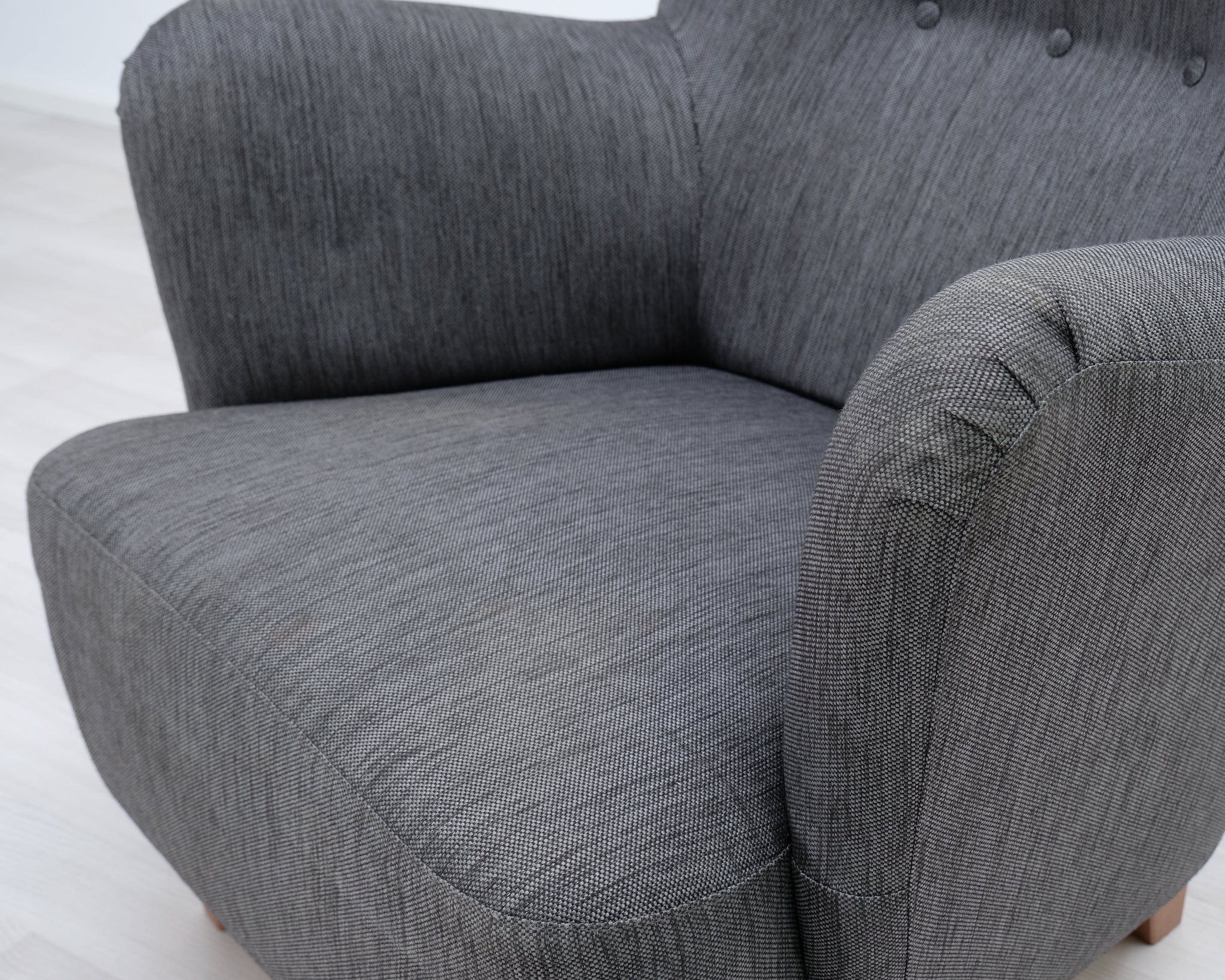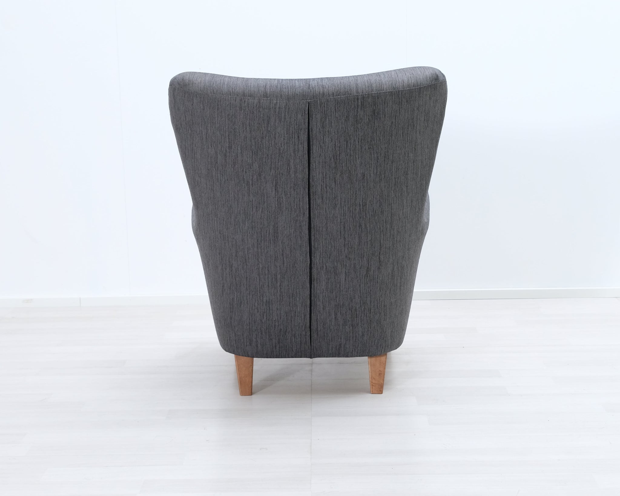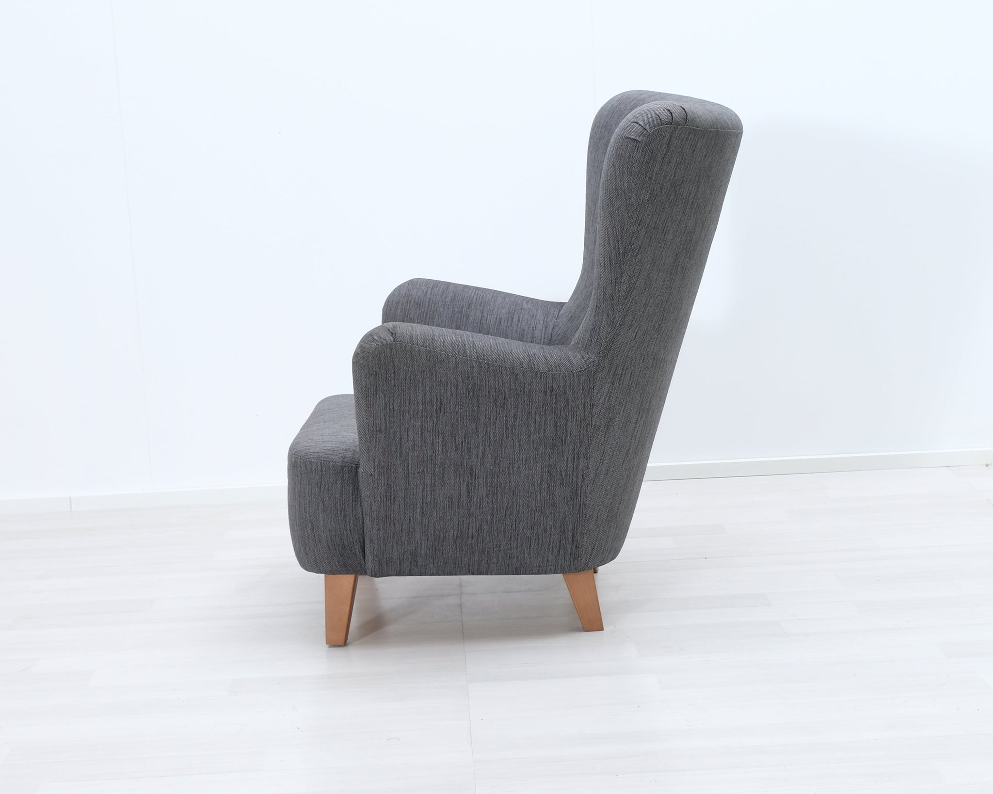 Askon Richard-nojatuoli harmaalla kangasverhoilulla. Klassikkonojatuolin malli on peräisin 40-luvulta.