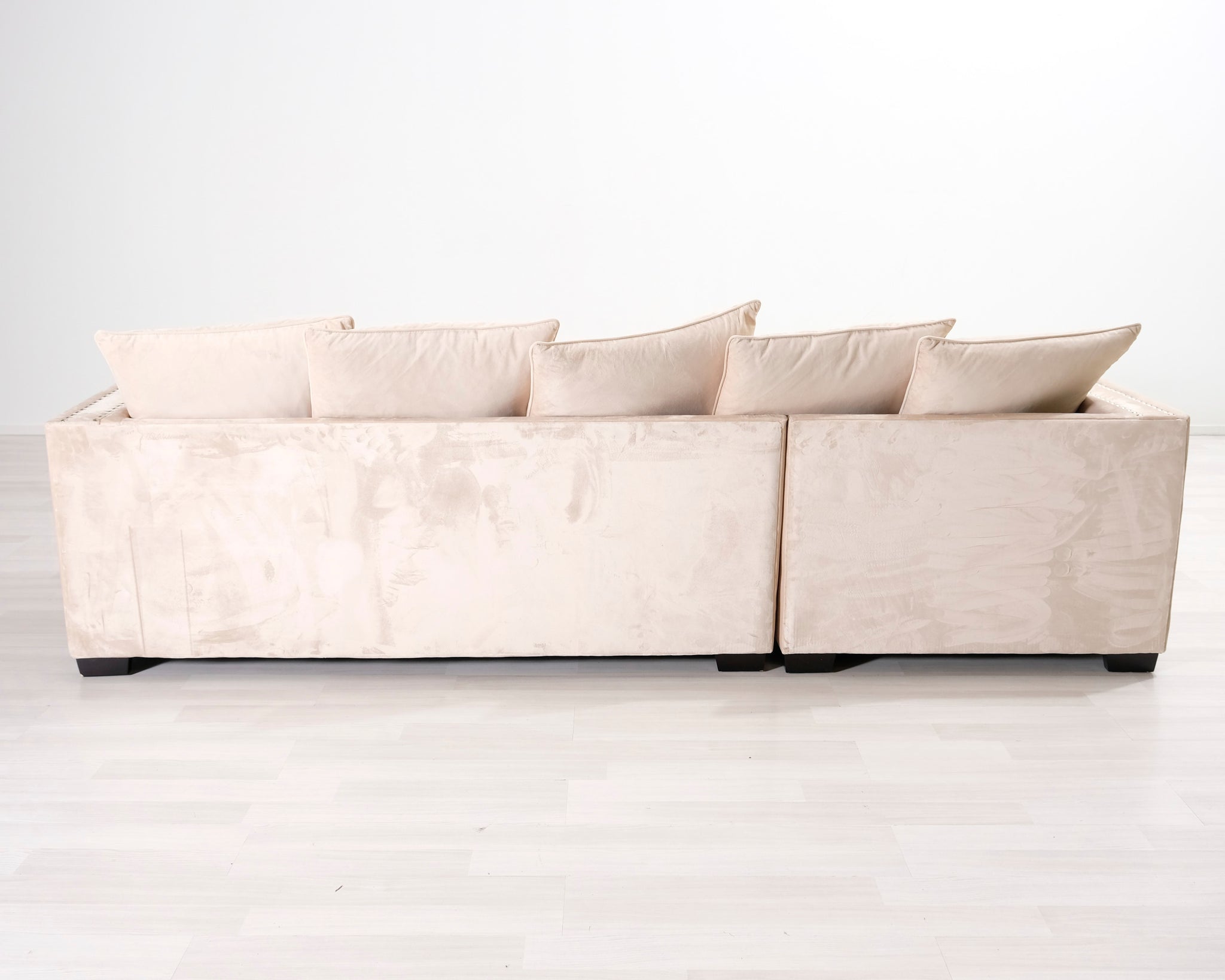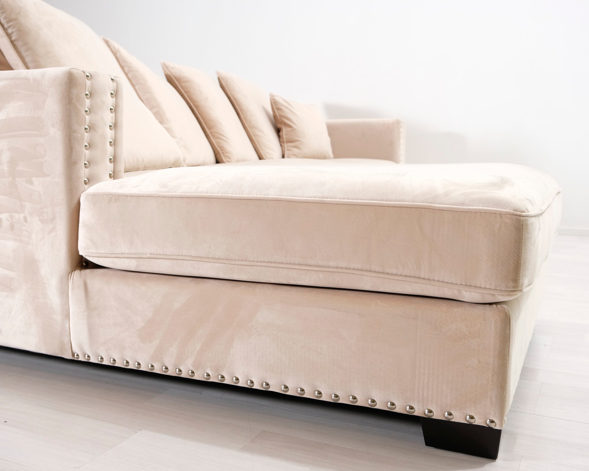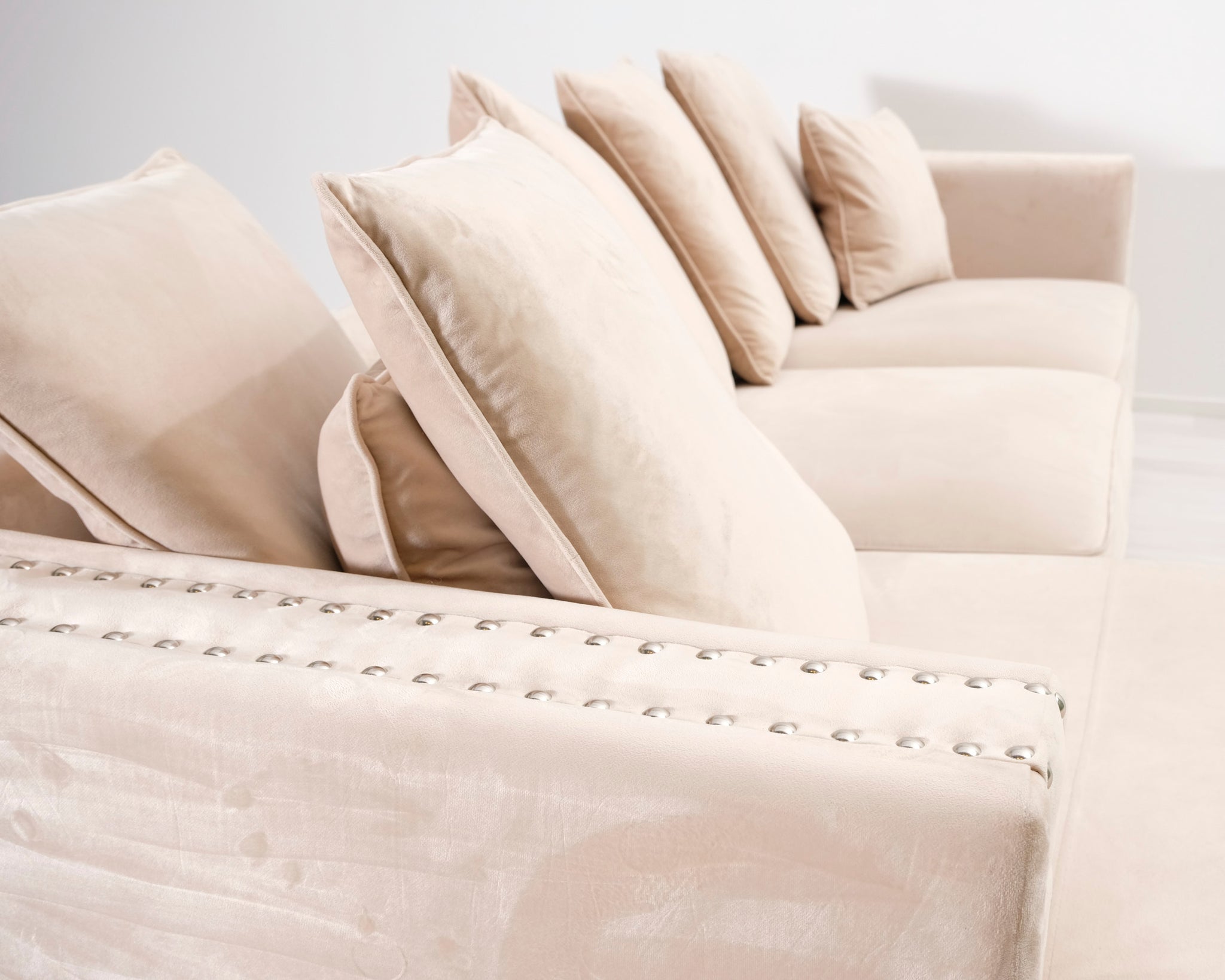 Suurikokoinen kangassohva leveällä divaaniosalla. Beige alcantara-verhoilu. Alcantara on mokkamainen kangas, joka kestää hyvin käyttöä ja on miellyttävän tuntuinen. Koristeniitit.