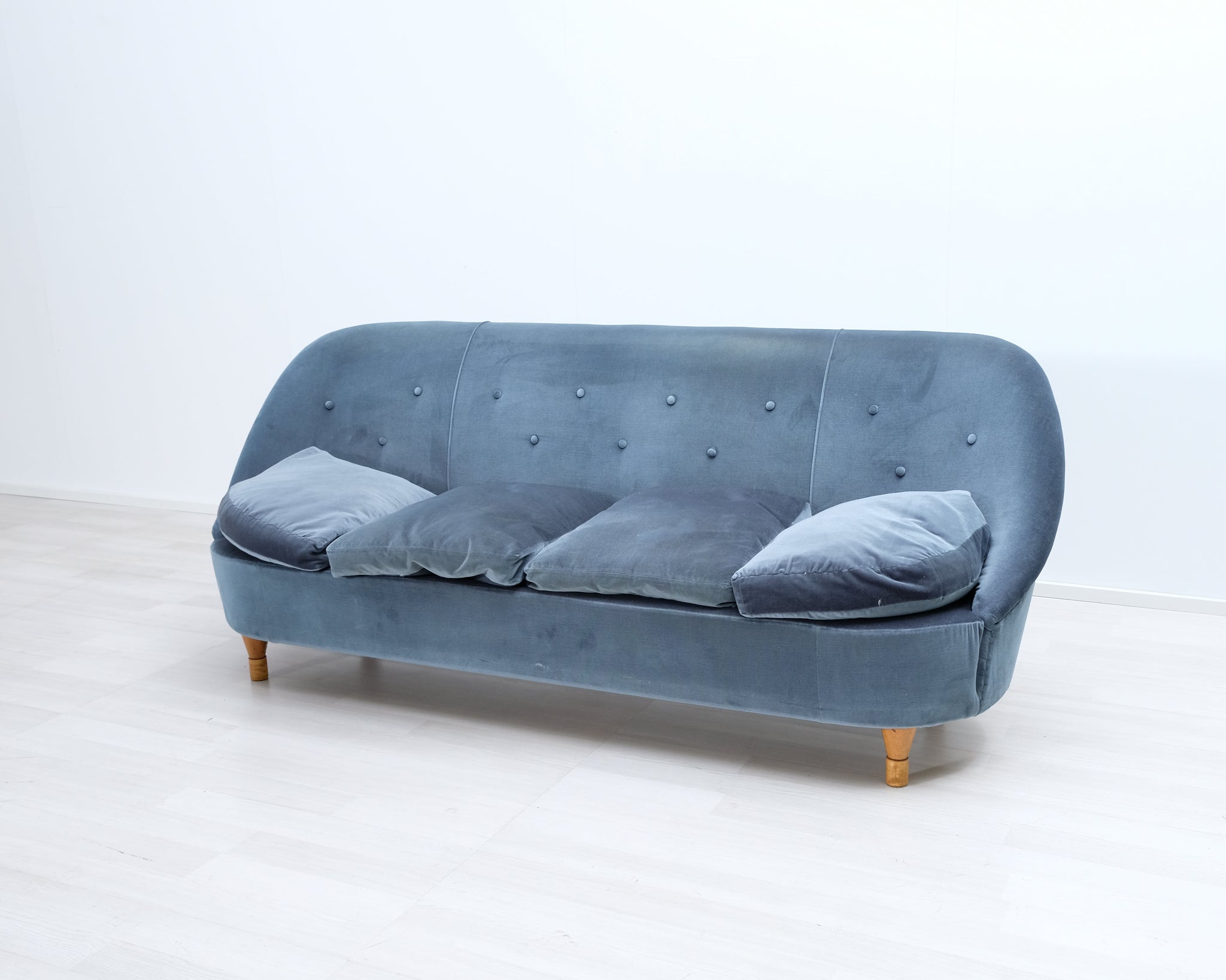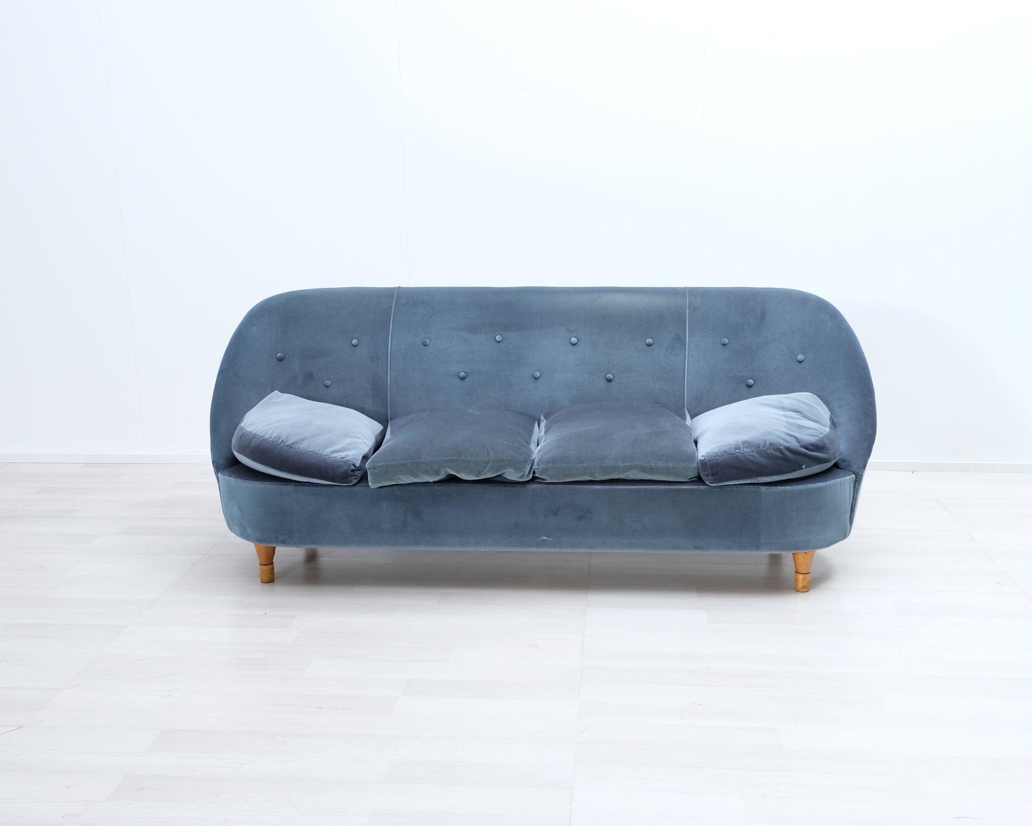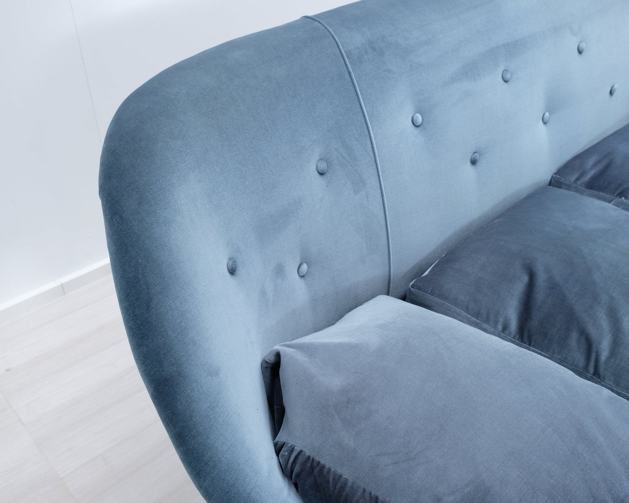 Ihastuttava vintagesohva. Kaunis vaaleansininen kangasverhoilu ja koristenapit. Valmistettu 1940-luvun lopussa.
