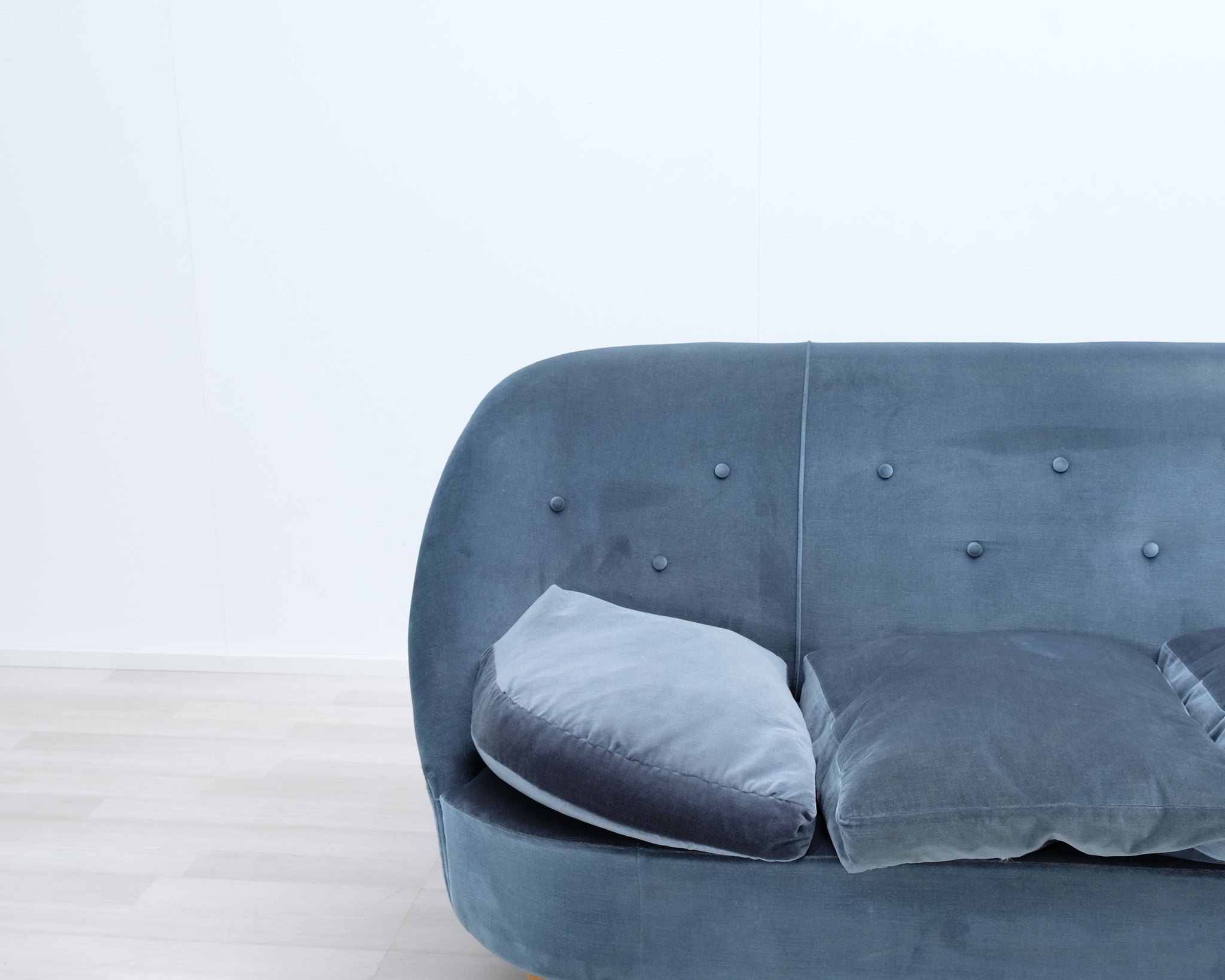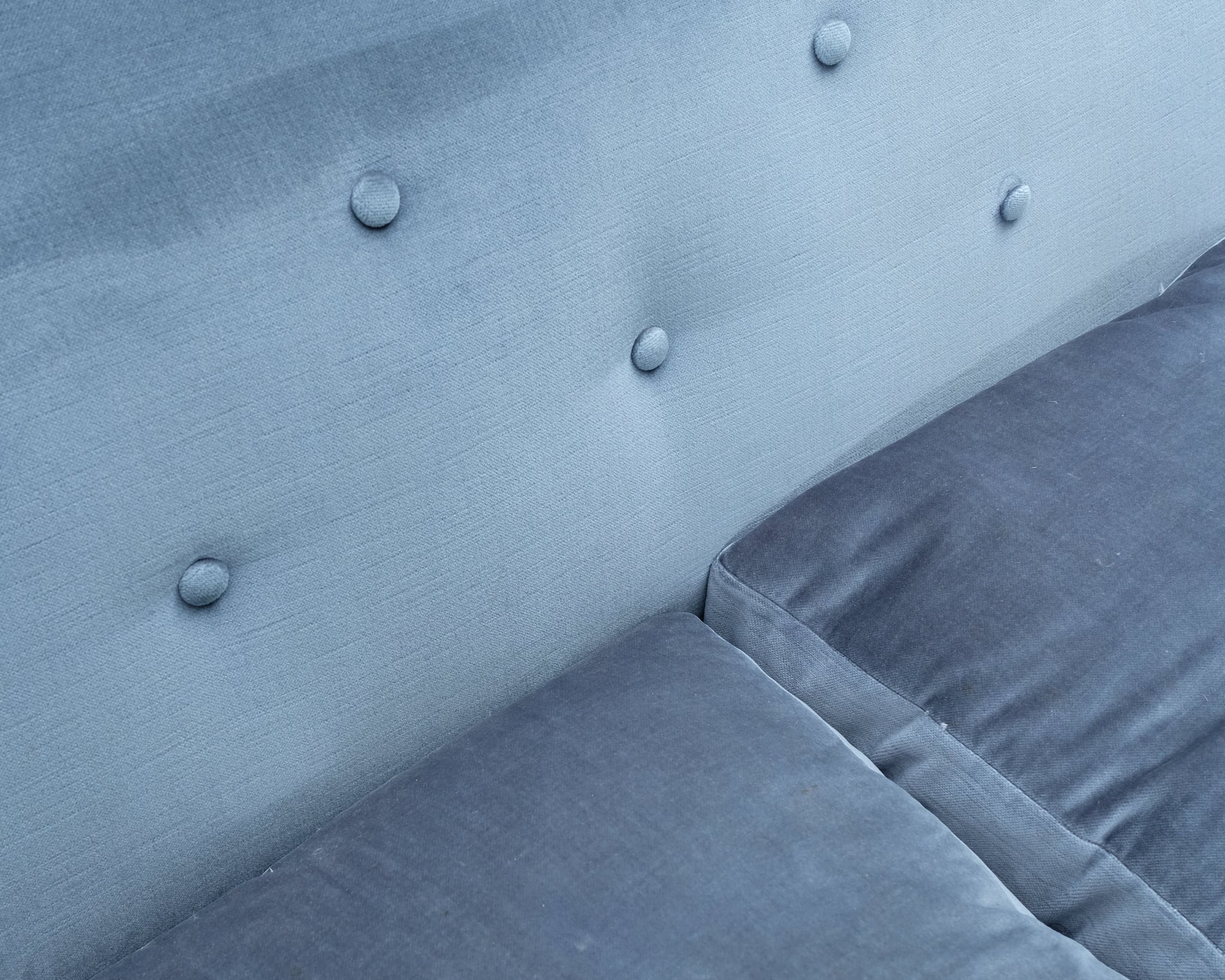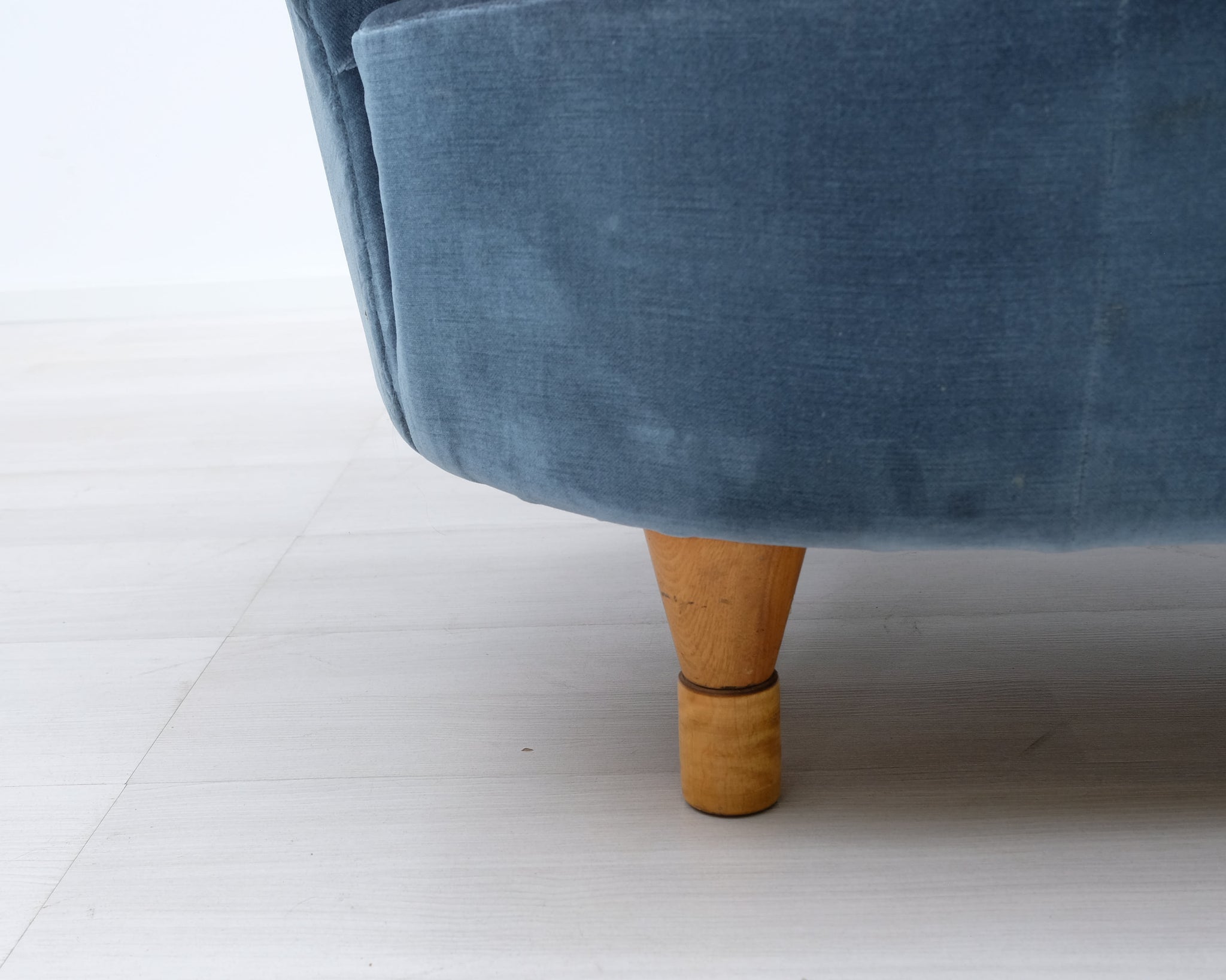 Ihastuttava vintagesohva. Kaunis vaaleansininen kangasverhoilu ja koristenapit. Valmistettu 1940-luvun lopussa.