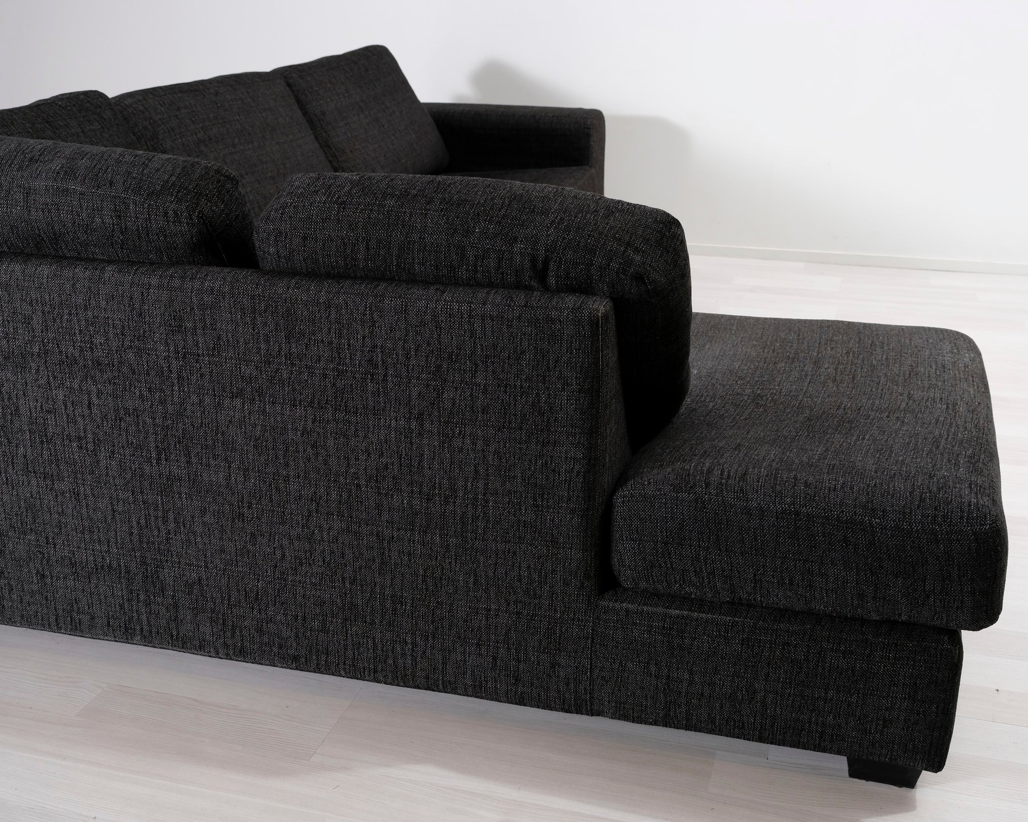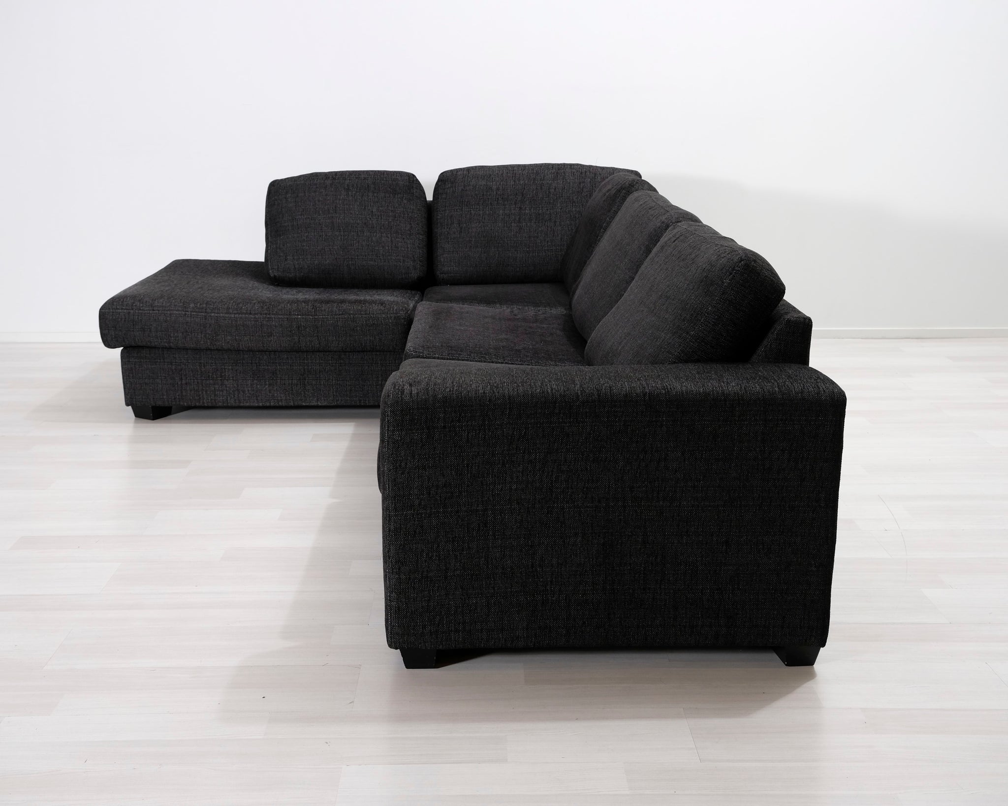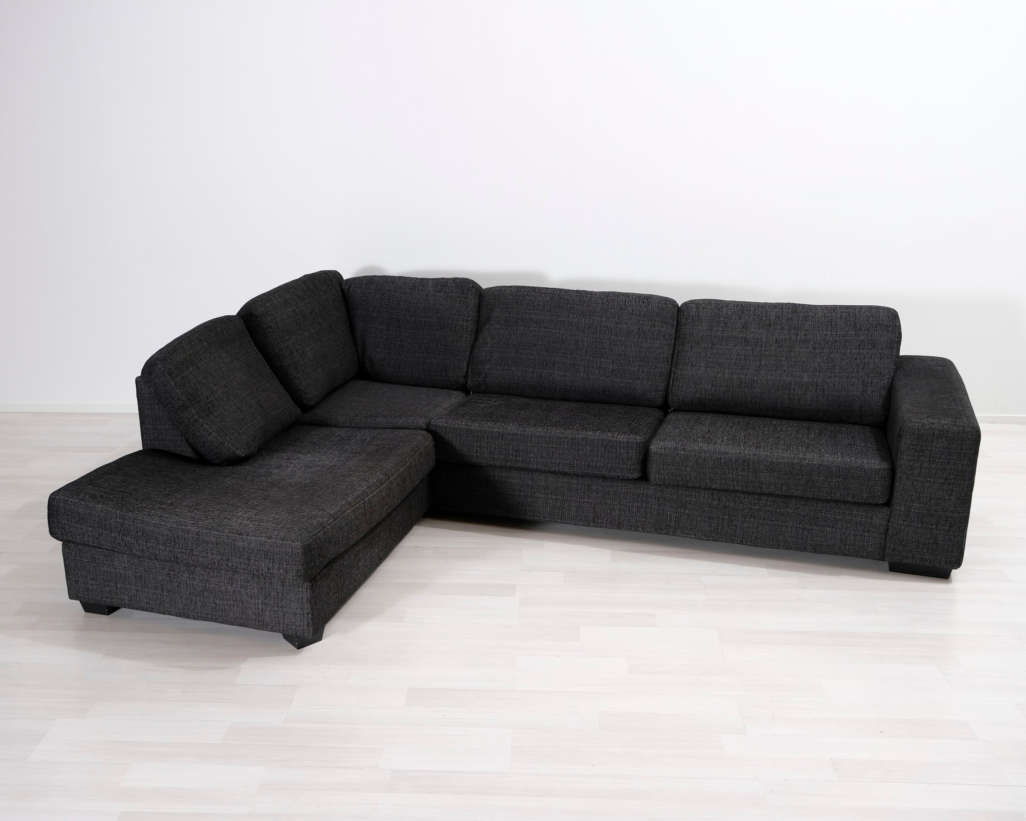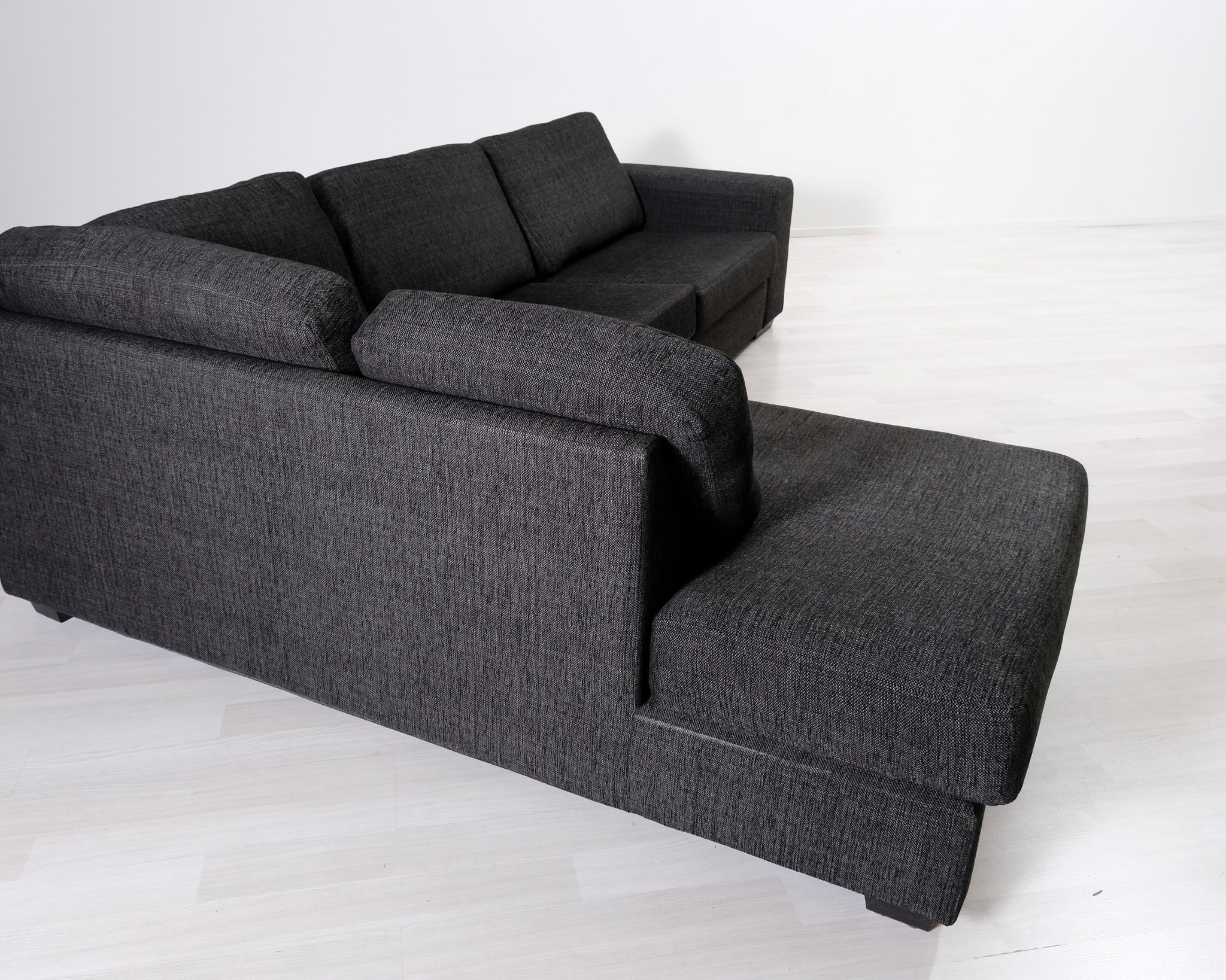 Neljän istuttava harmaa kangassohva. Avokulma.