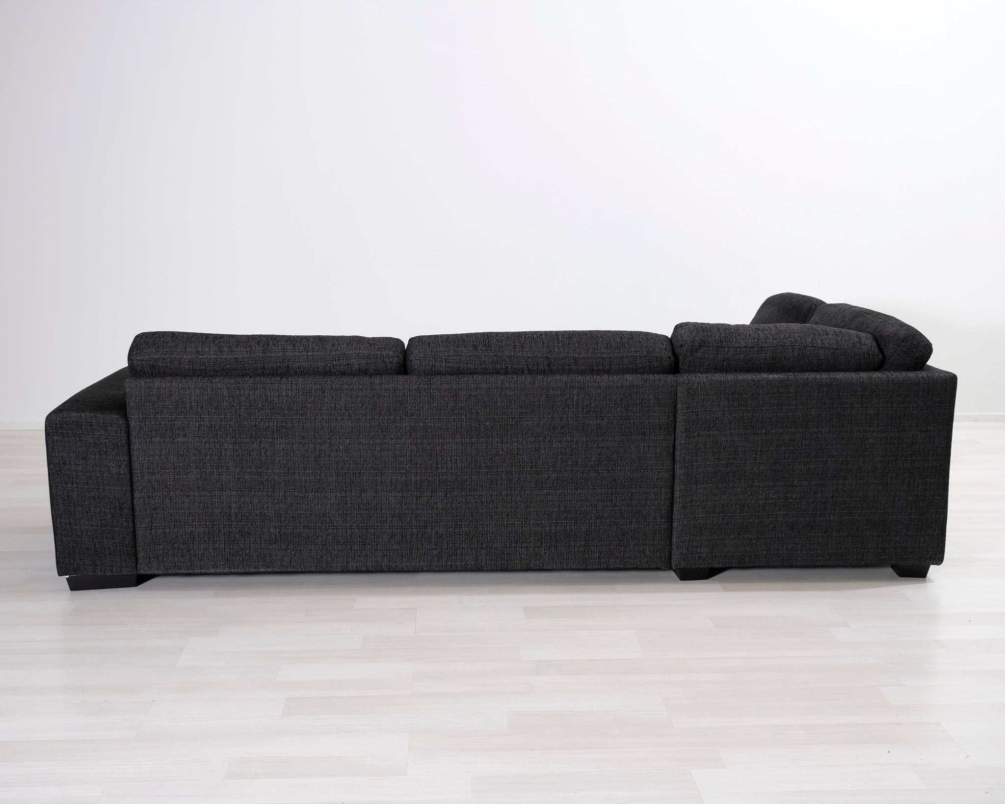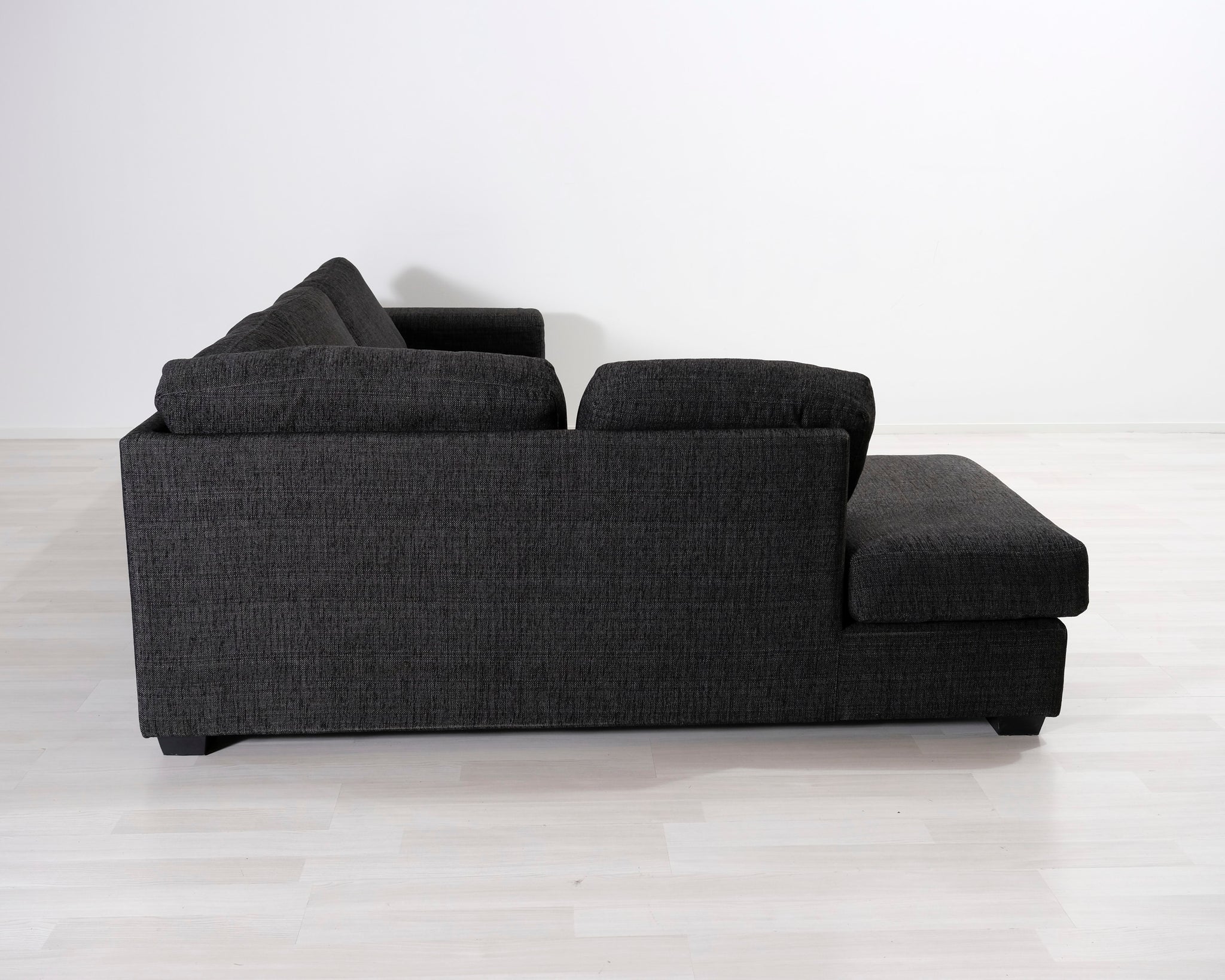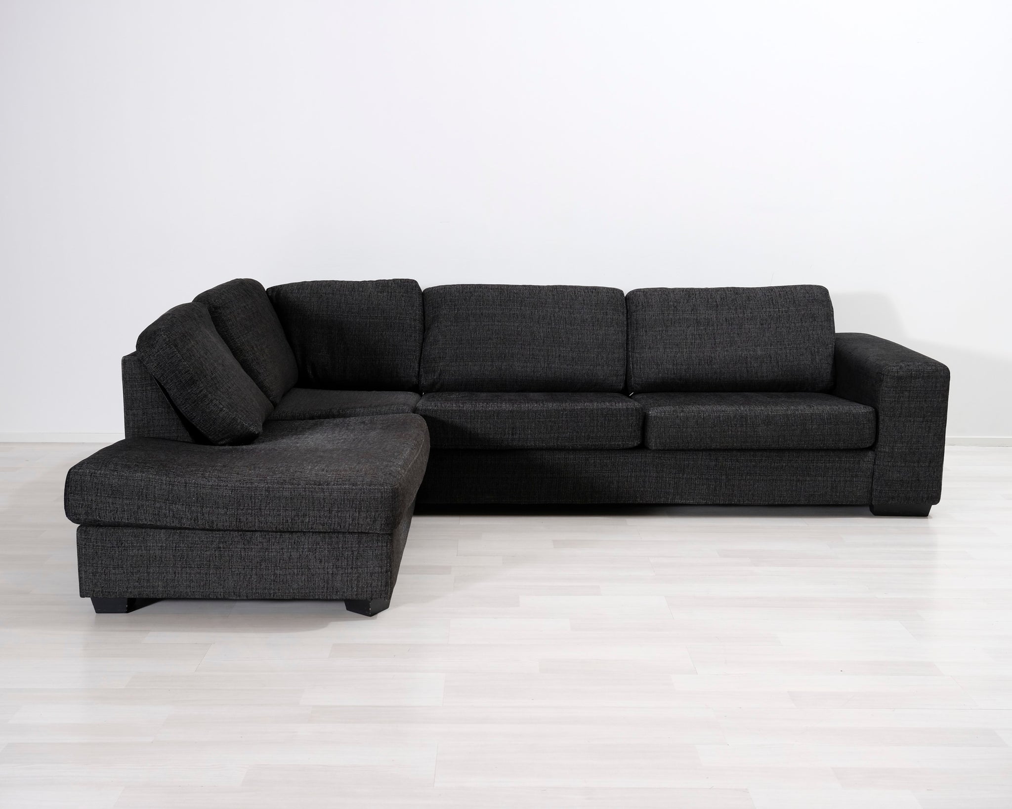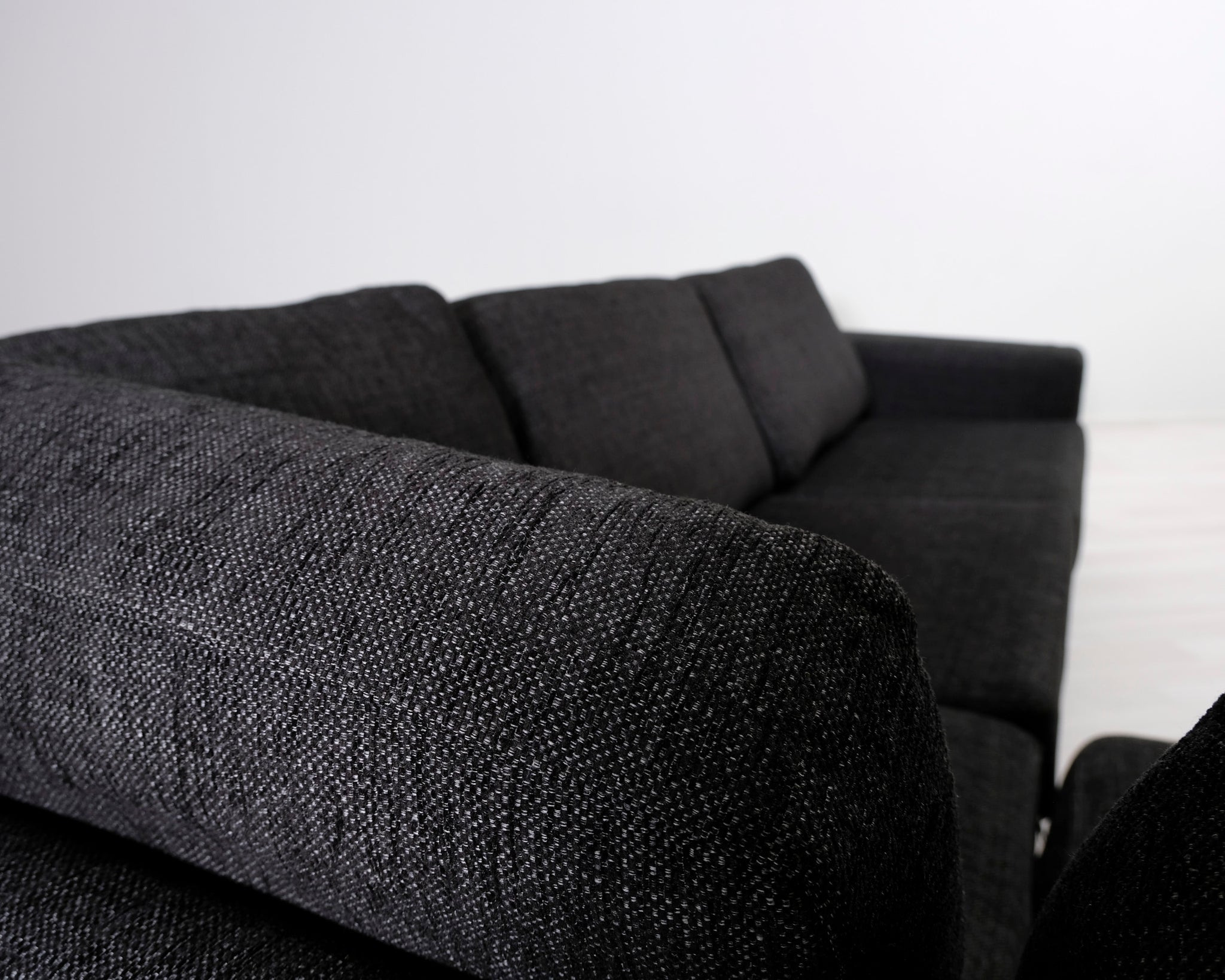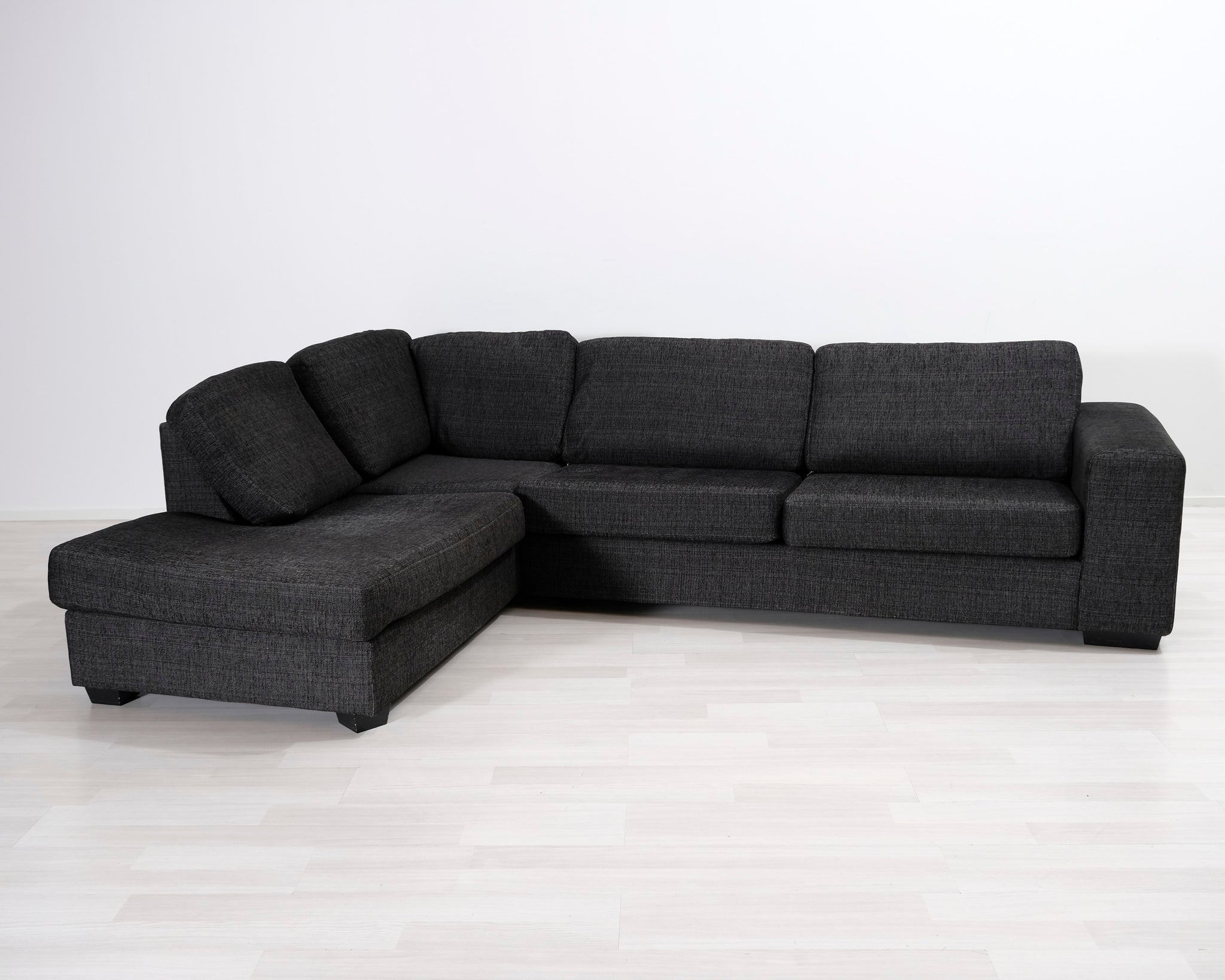 Neljän istuttava harmaa kangassohva. Avokulma.
