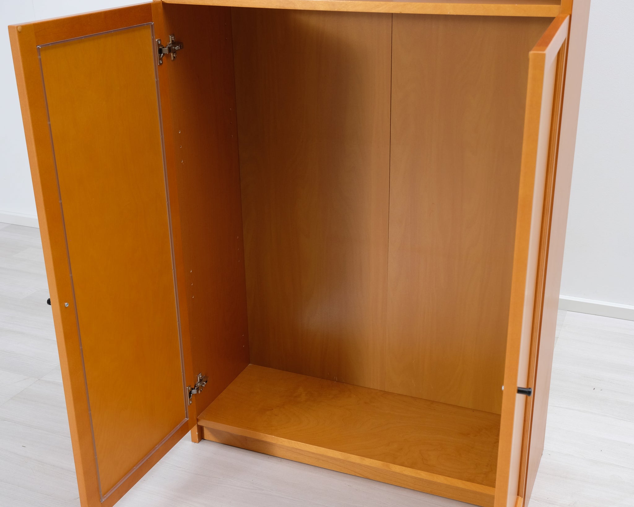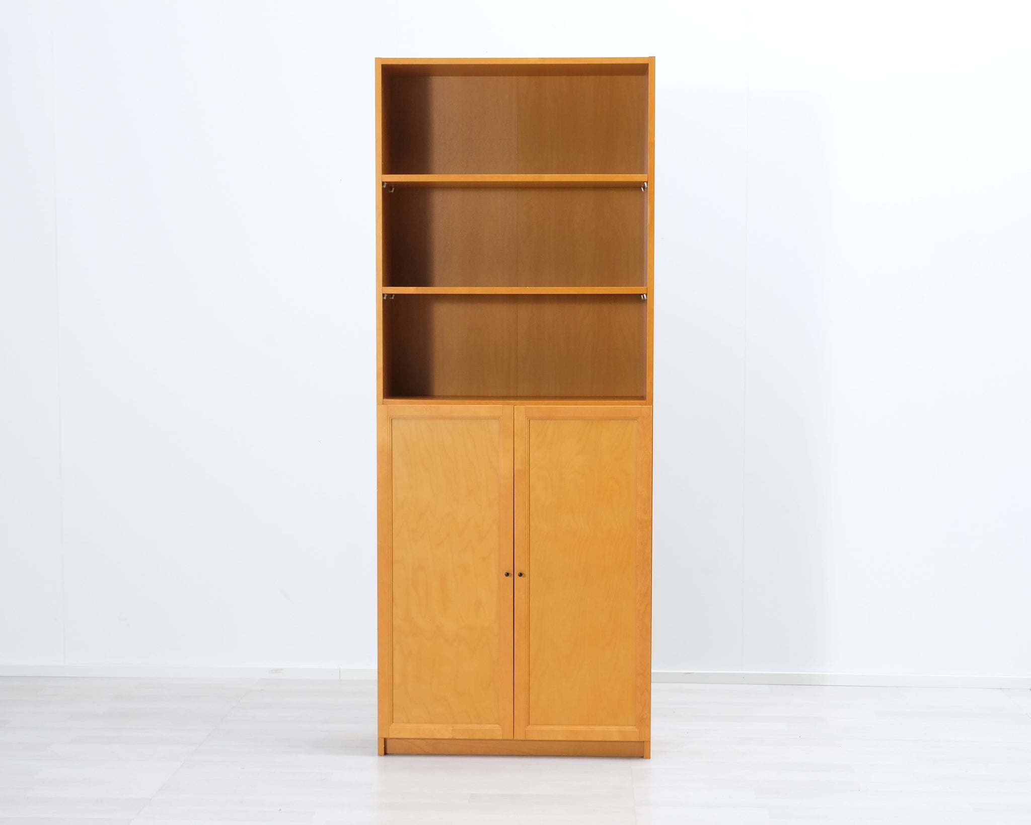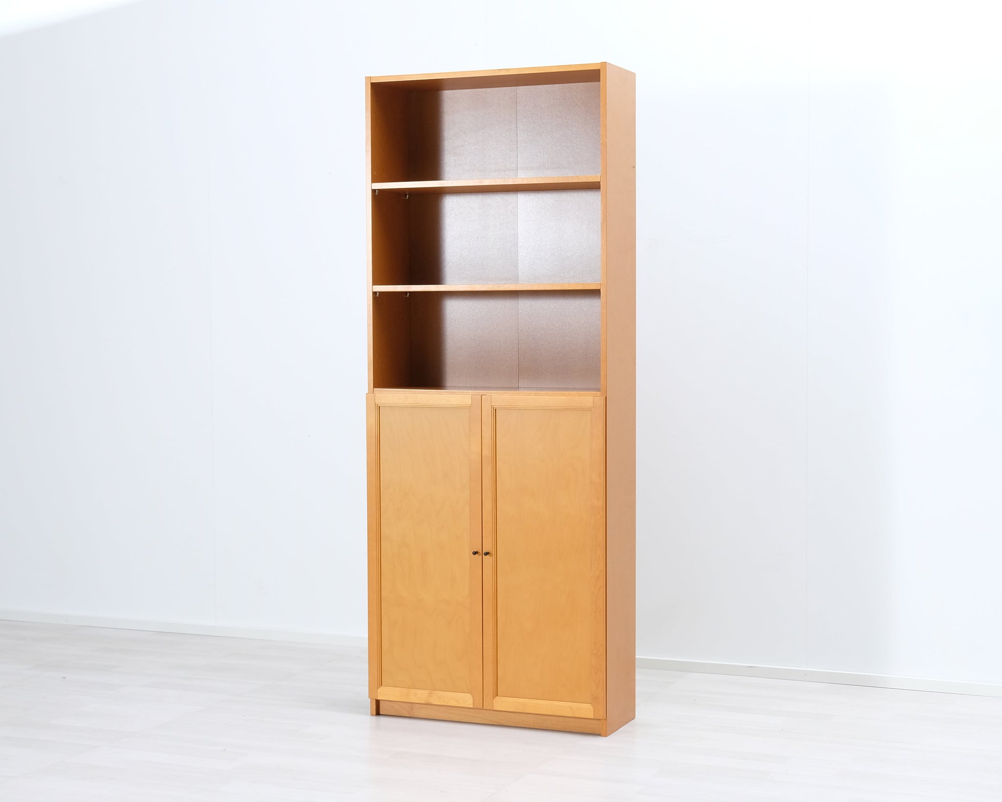 Korkea puinen kirjahylly. Alaosassa suljettavat kaapinovet, yläosassa kolme avonaista hyllyä. Askon valmistama.