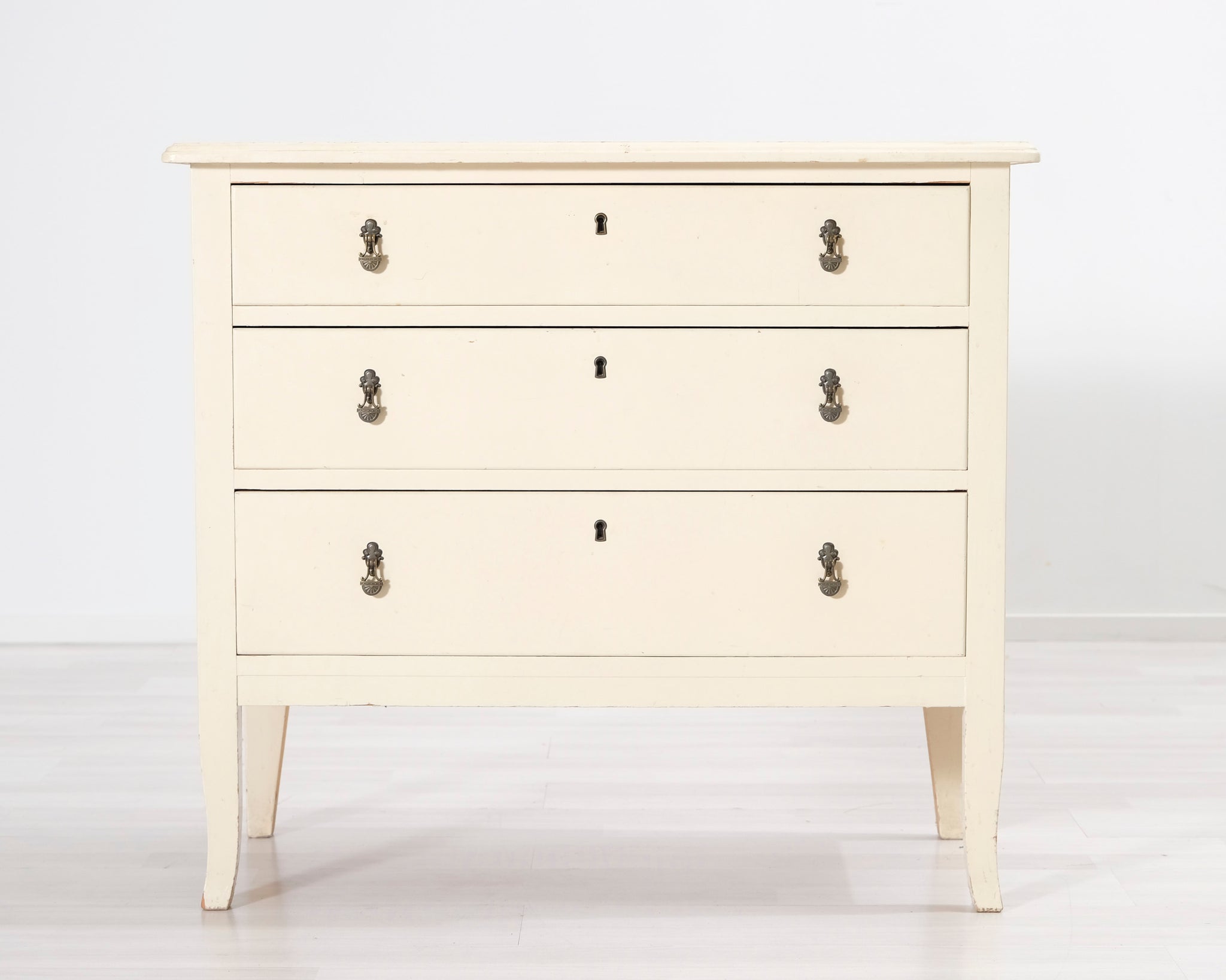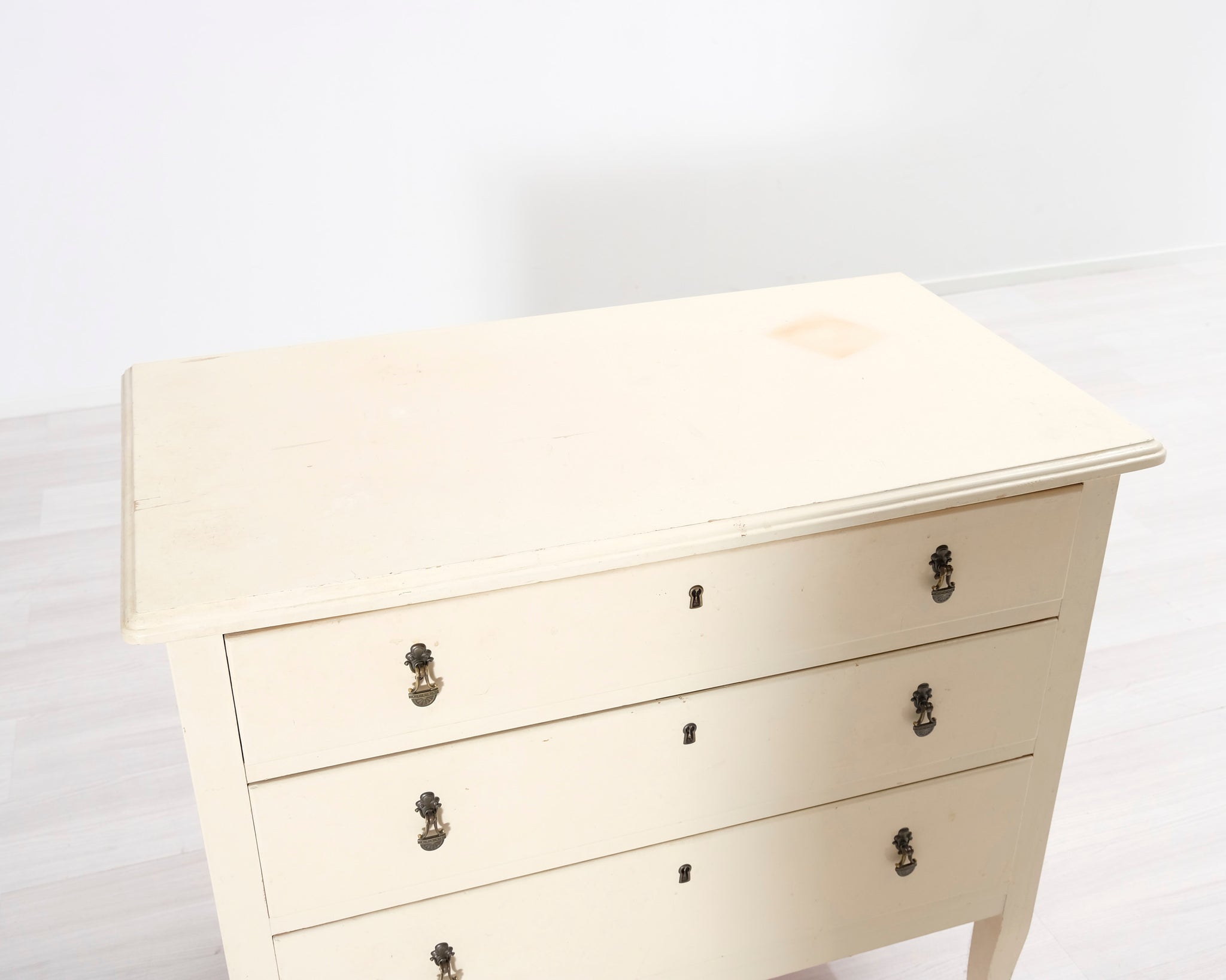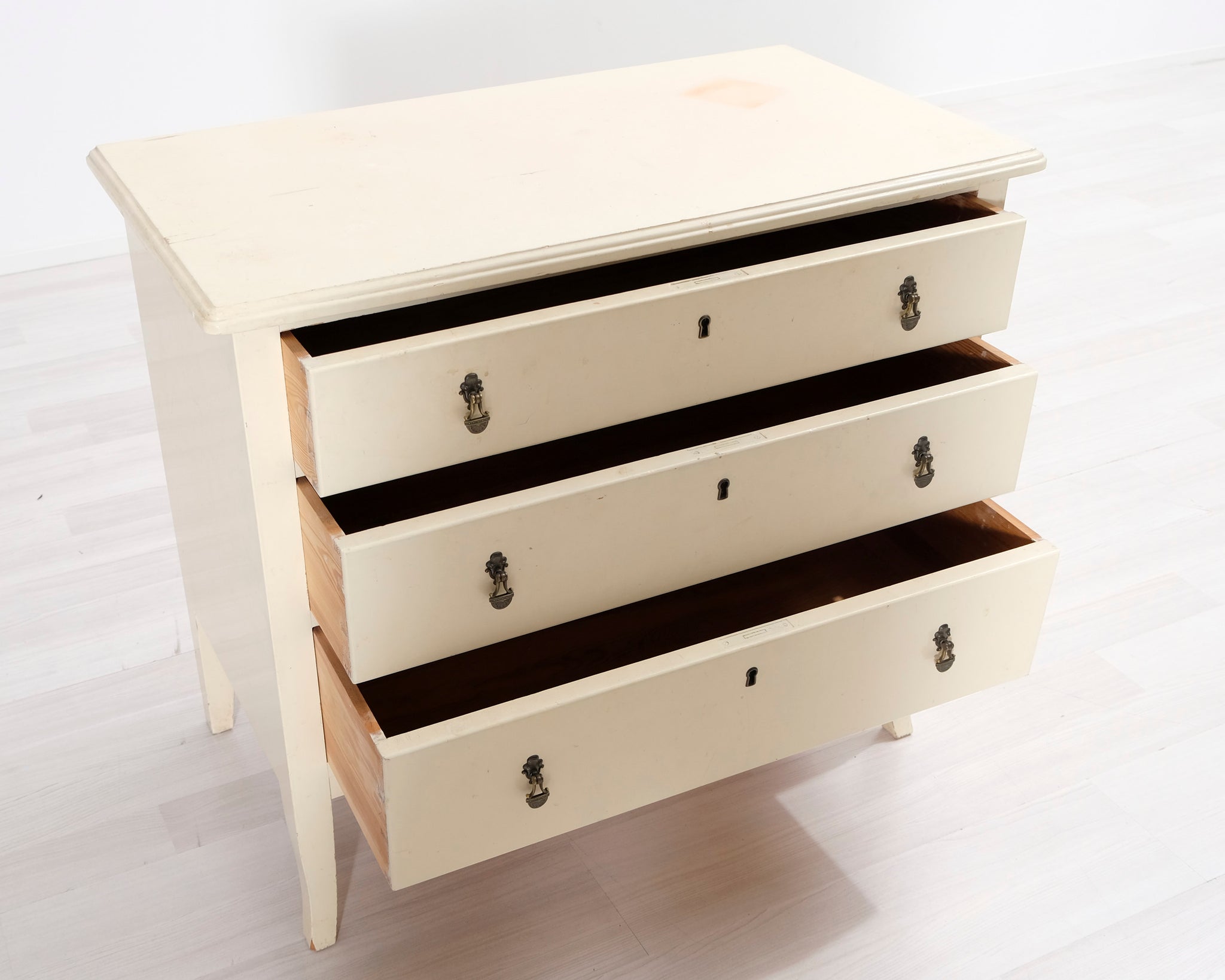 Alkuperäiskunnossa oleva kermanvalkoinen lipasto. Valmistettu 1900-luvun alussa. Koristeelliset vetimet.