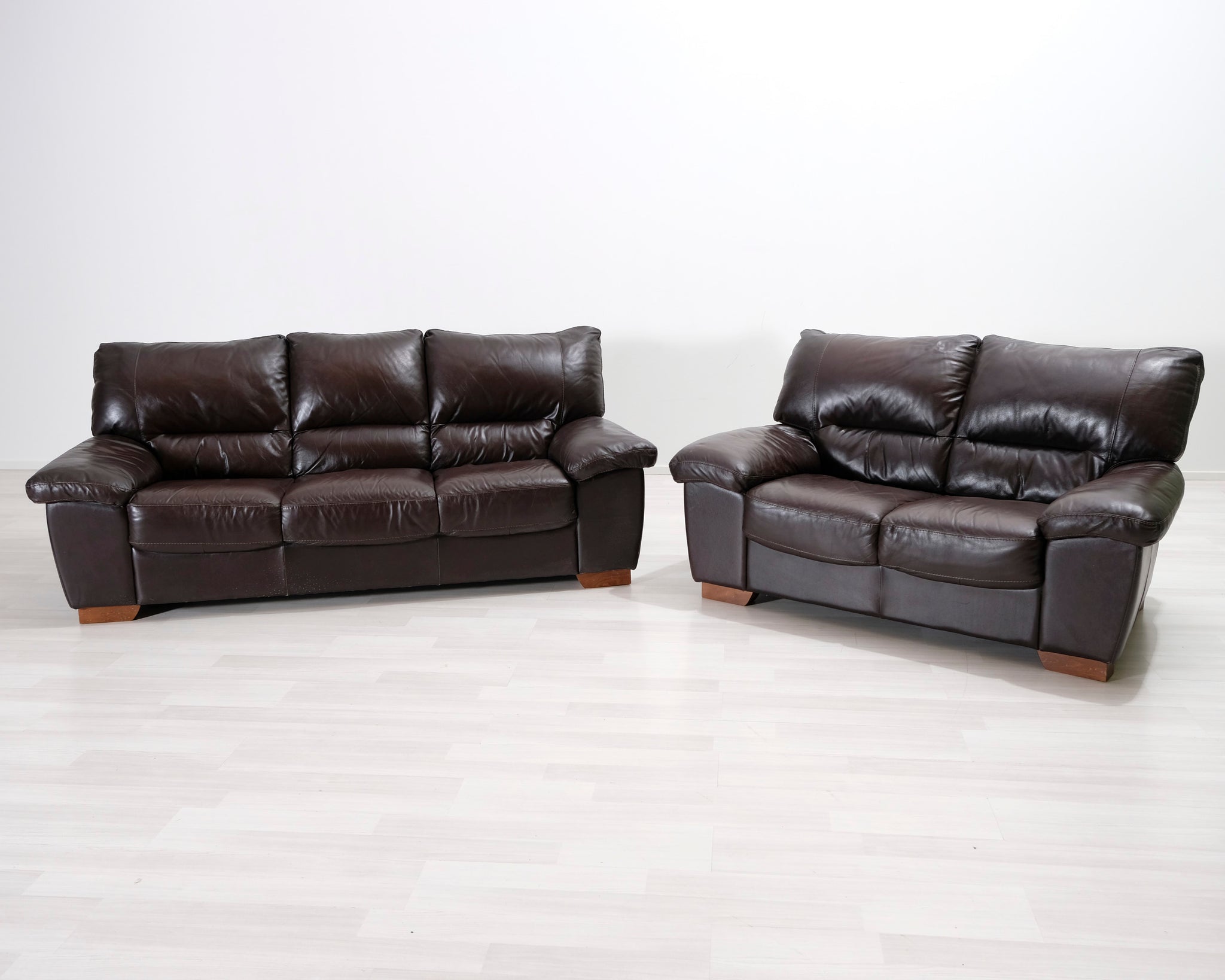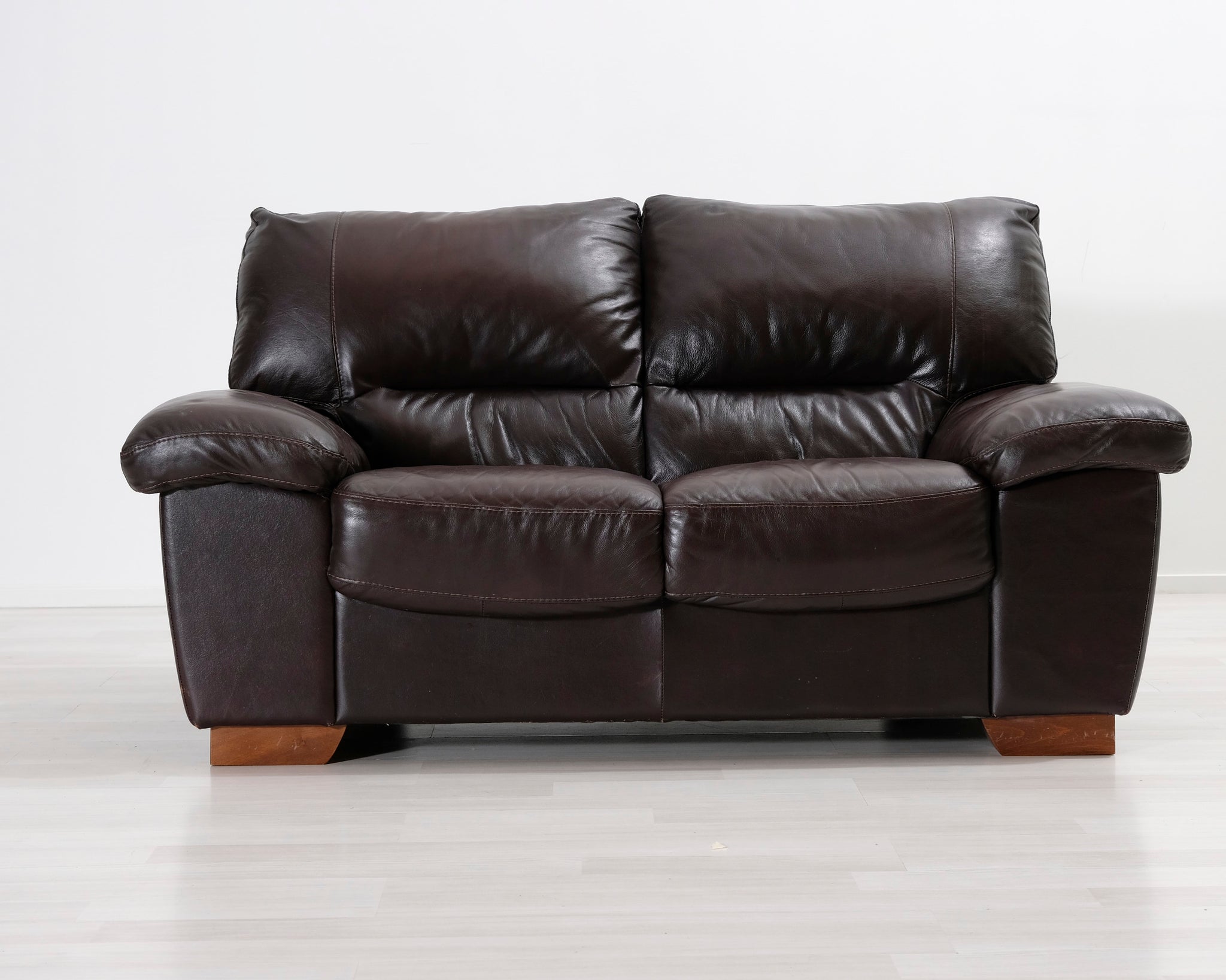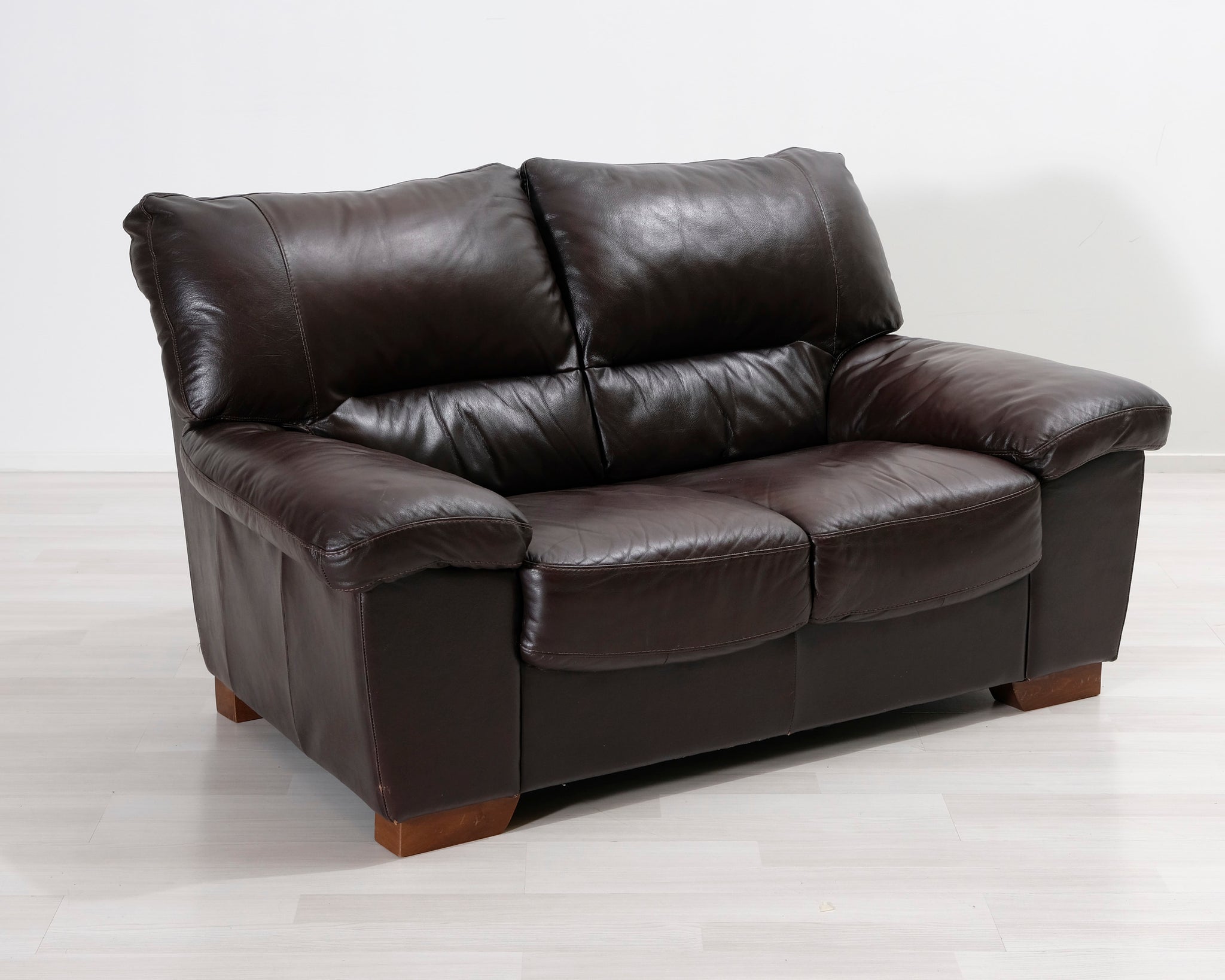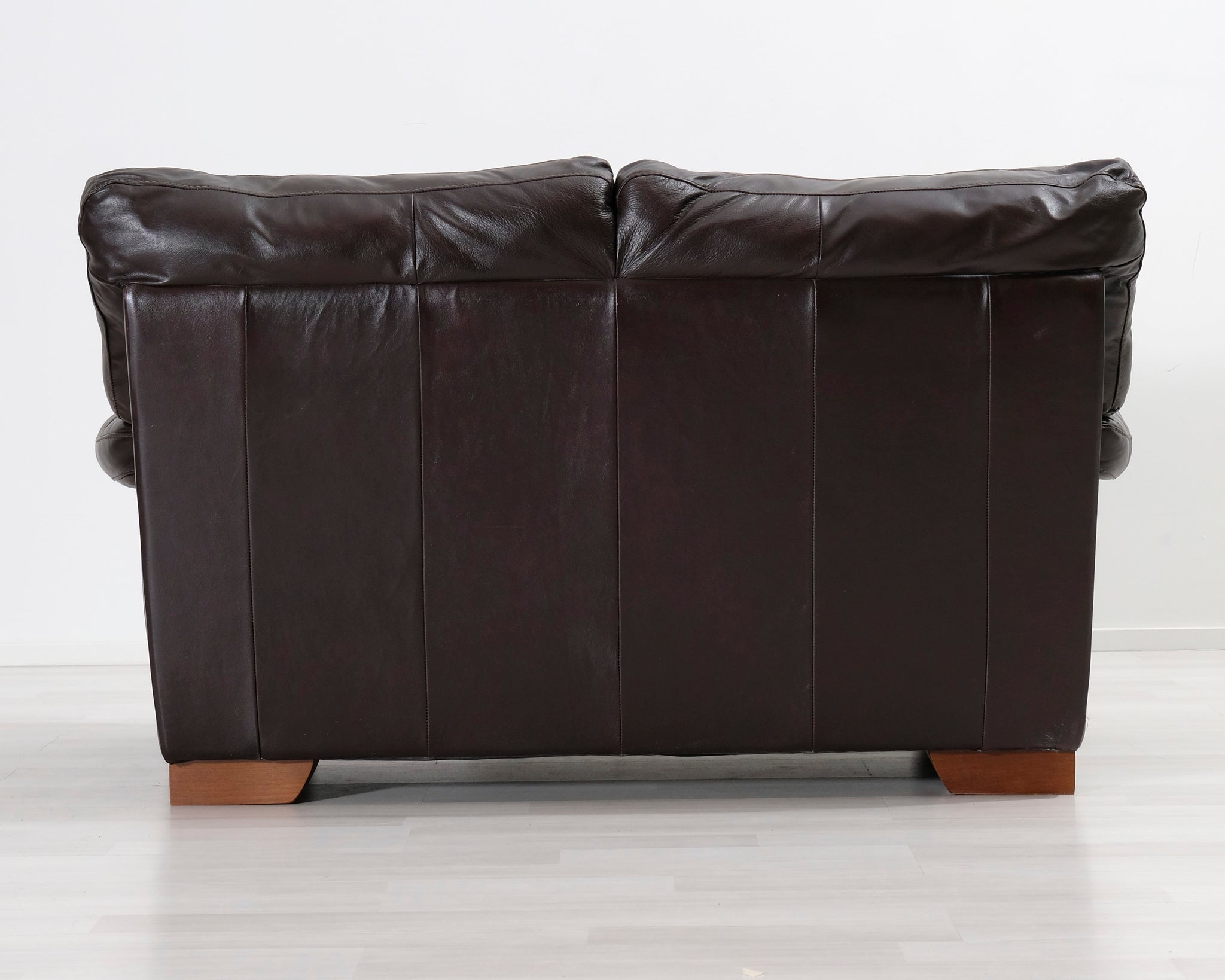 Kahden istuttava nahkasohva. Tummanruskea verhoilu.