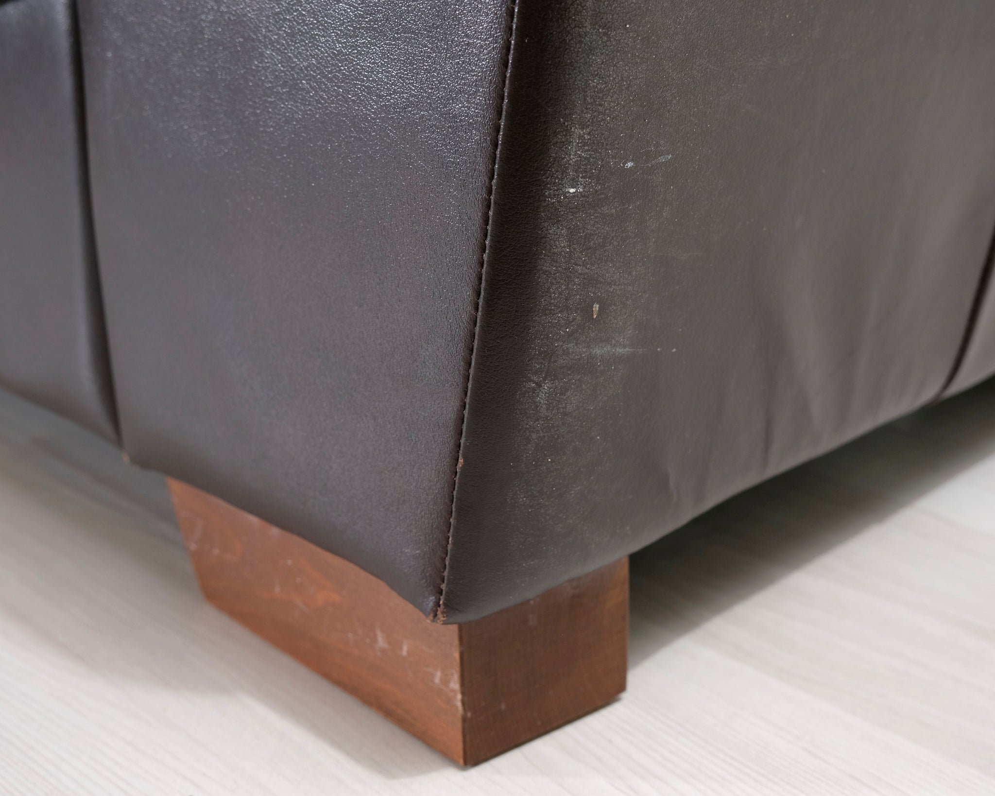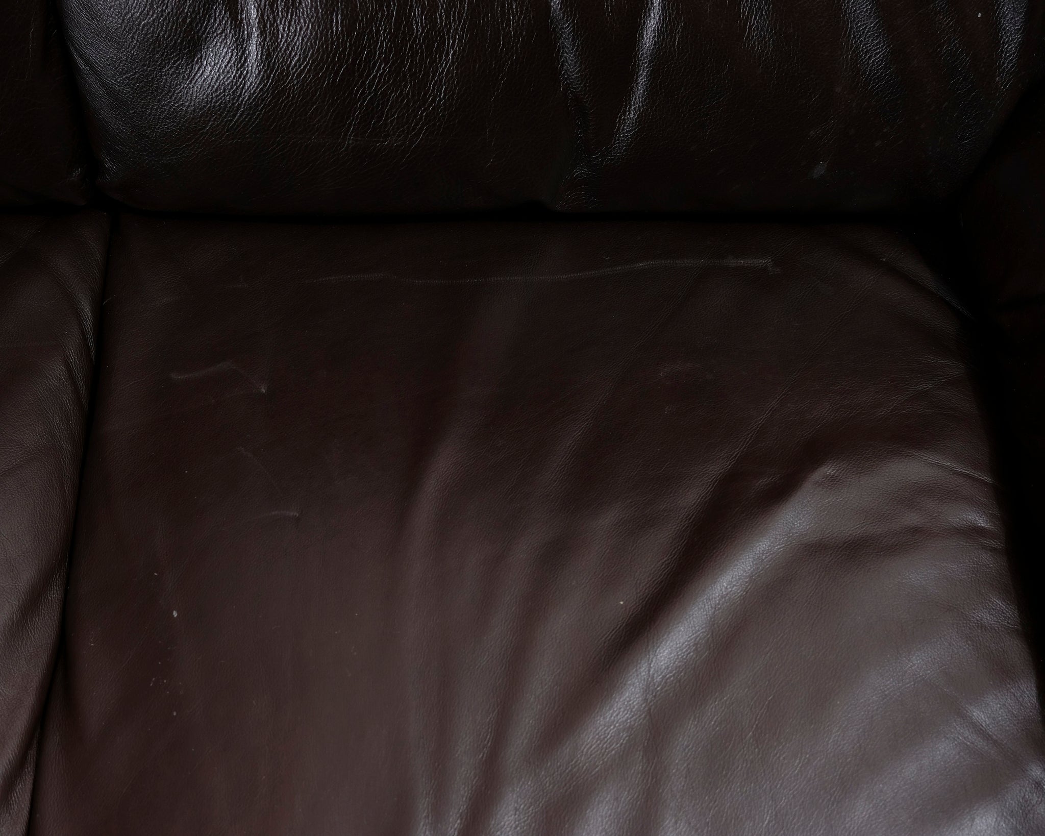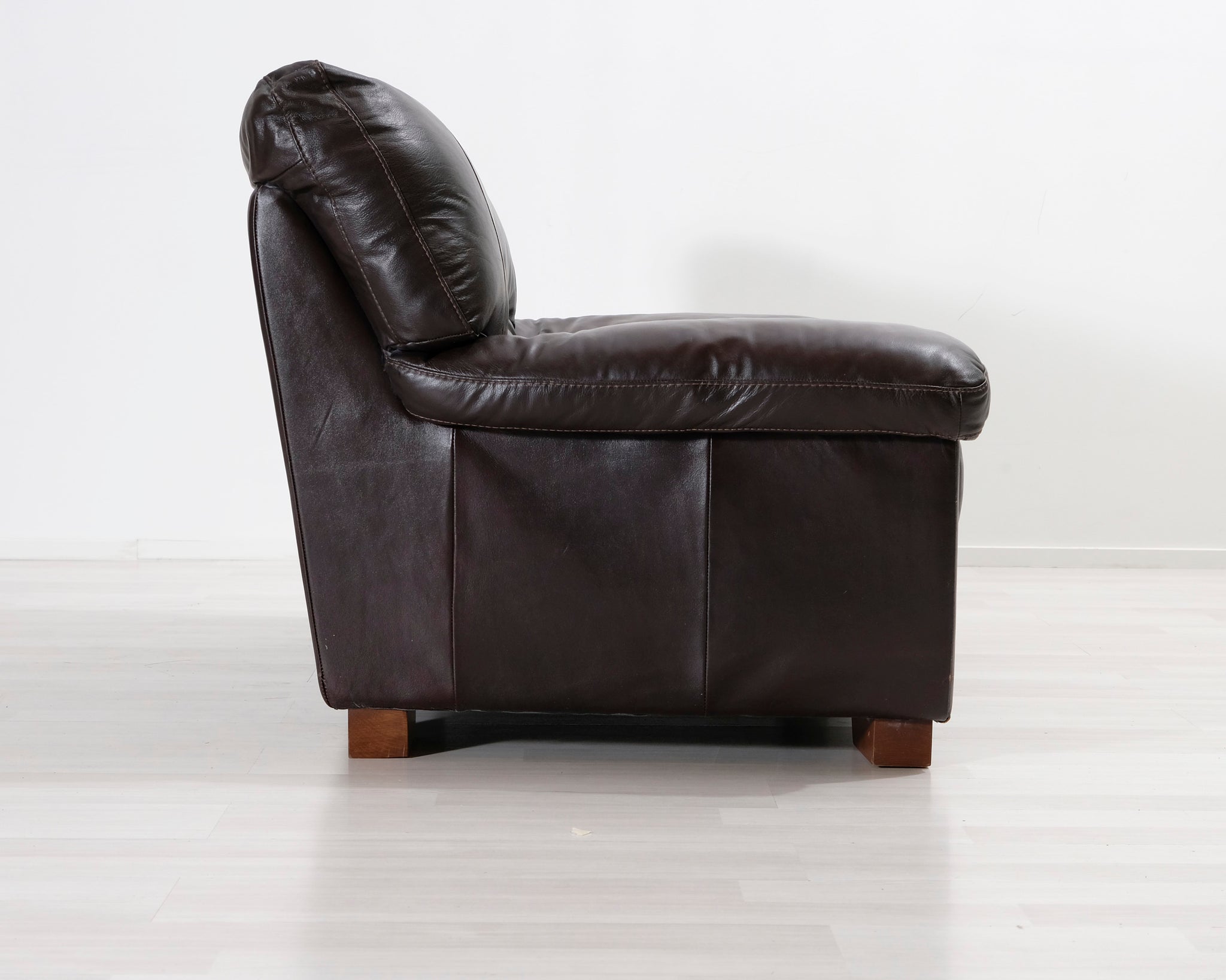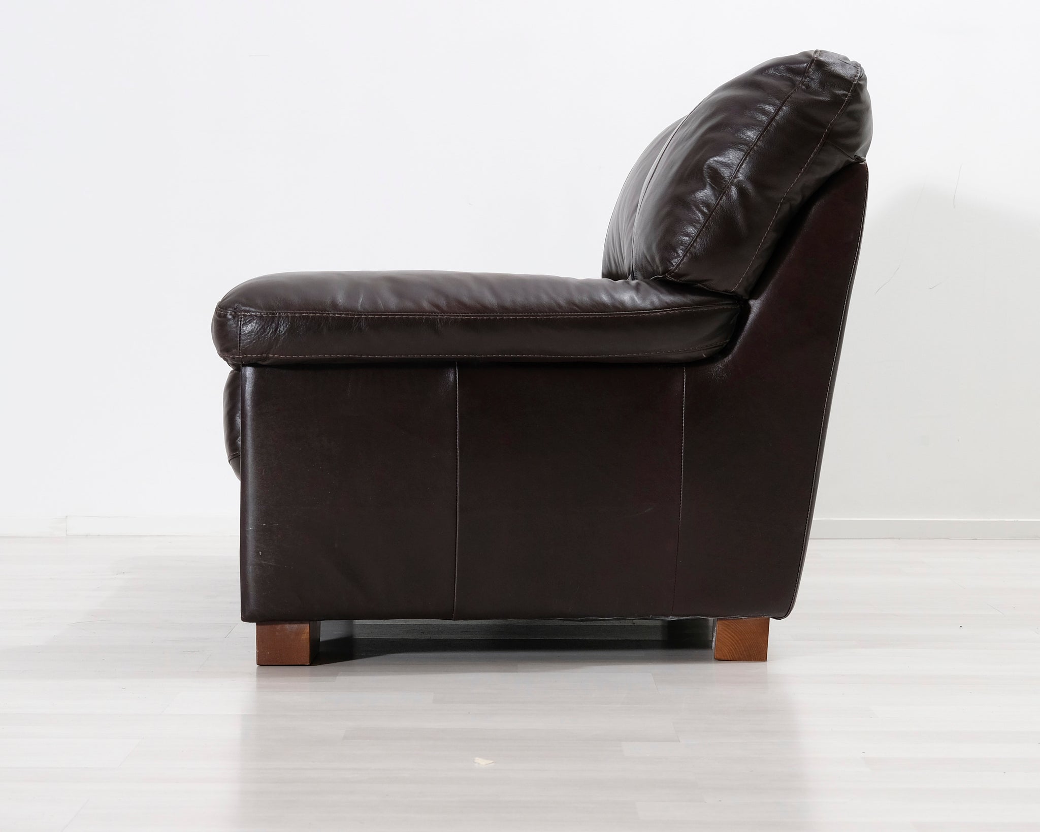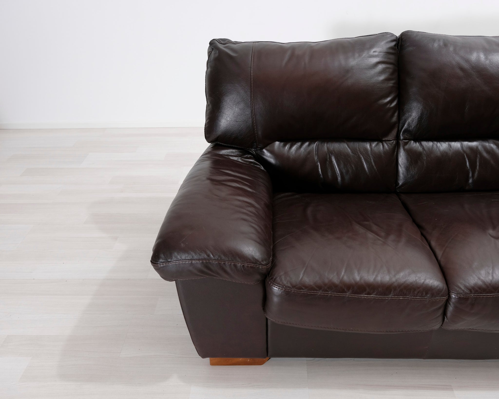 Kahden istuttava nahkasohva. Tummanruskea verhoilu.