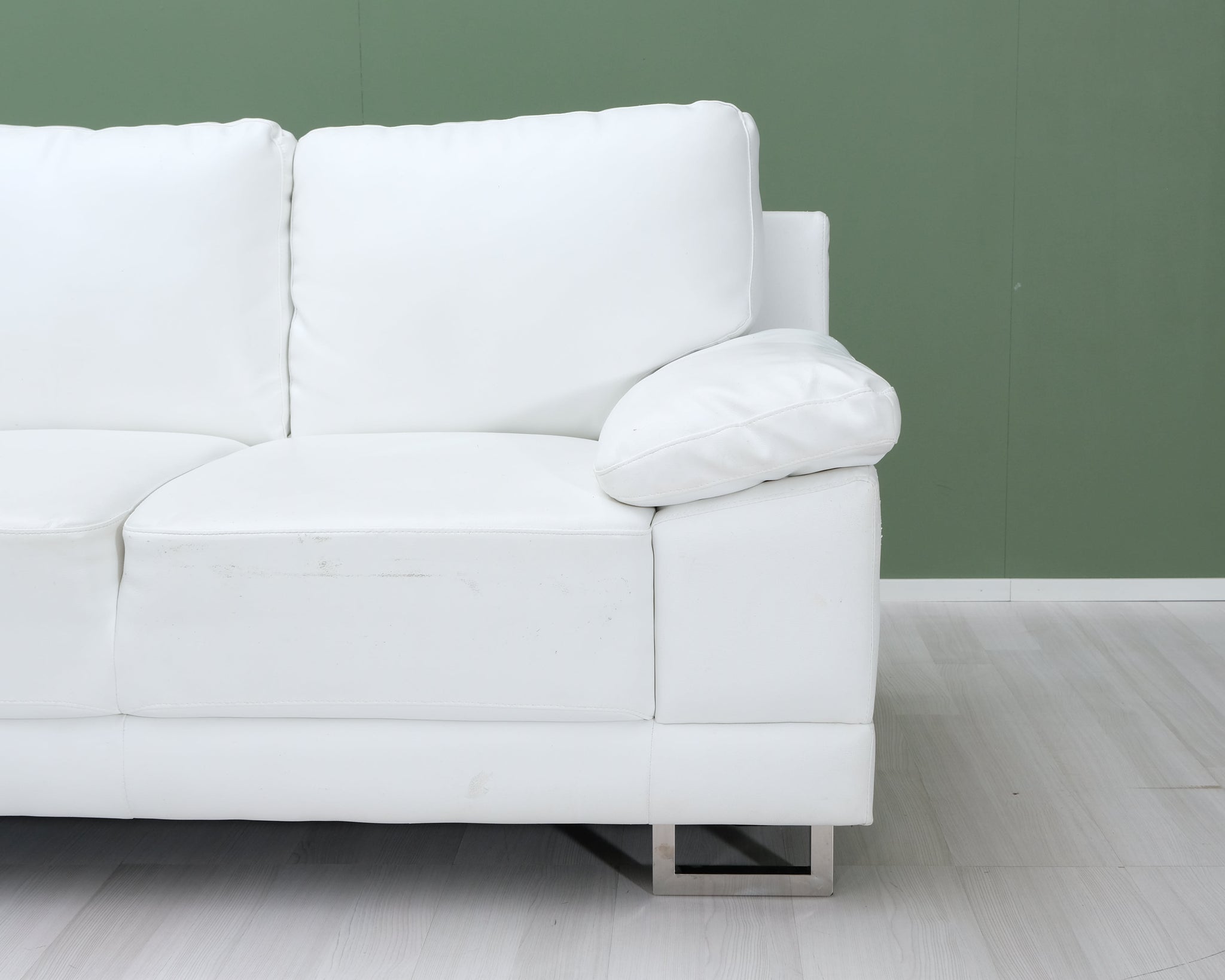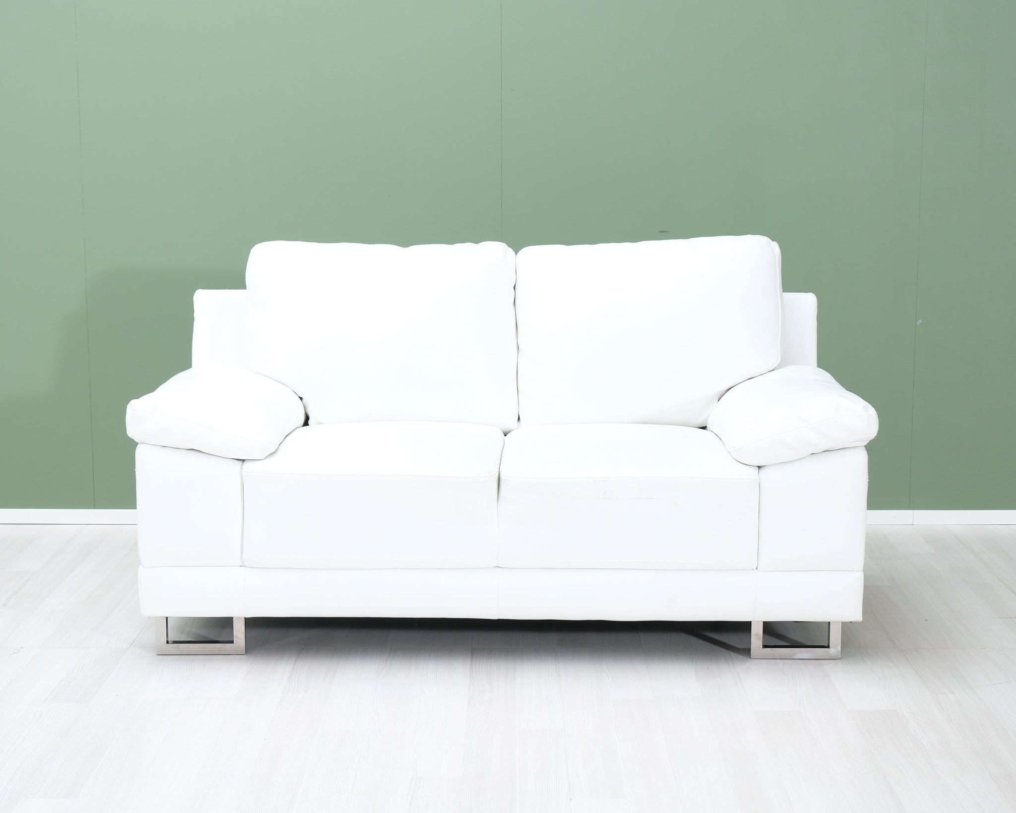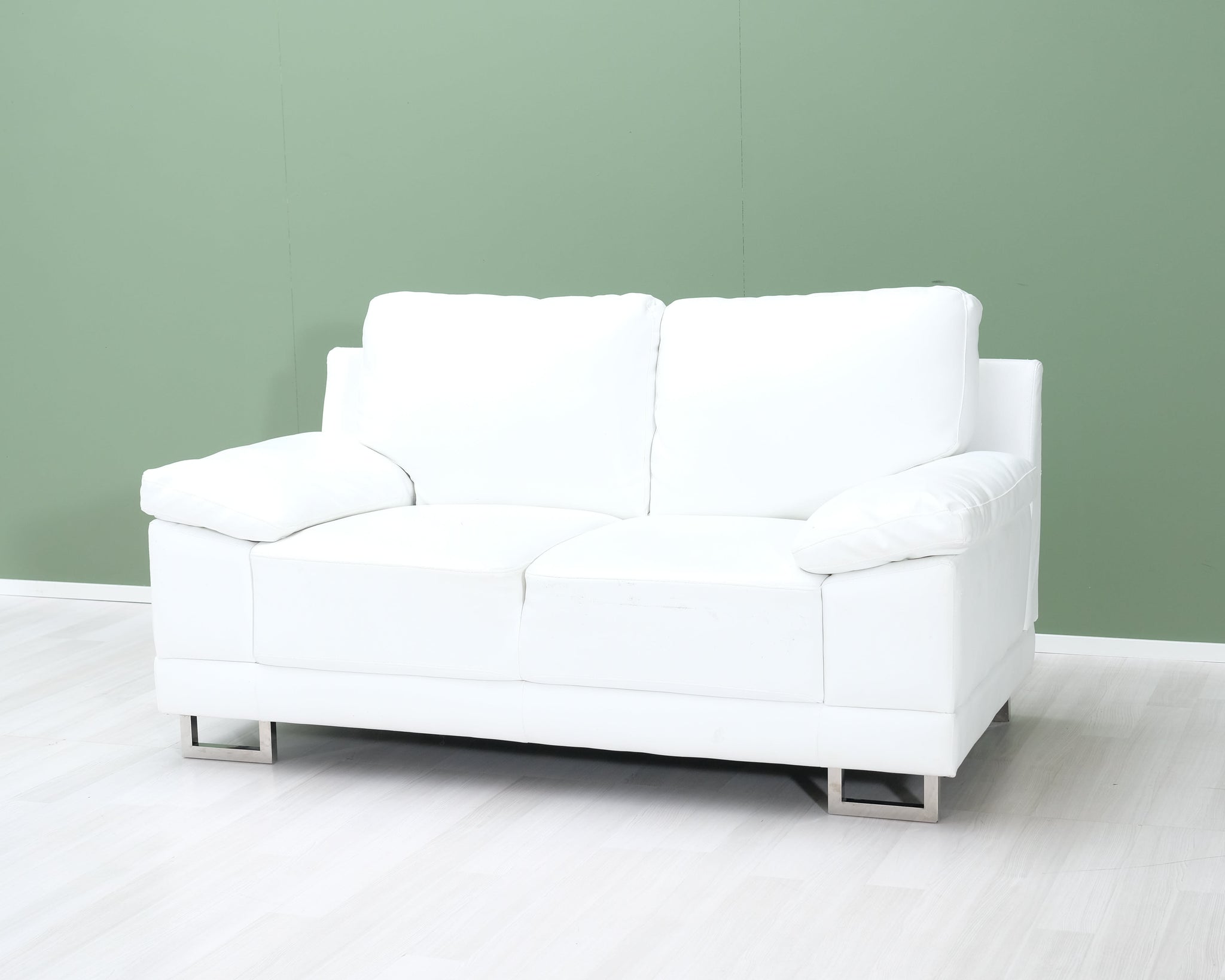 Kahden istuttava nahkasohva. Valkoinen verhoilu ja ohuet metallijalat.
