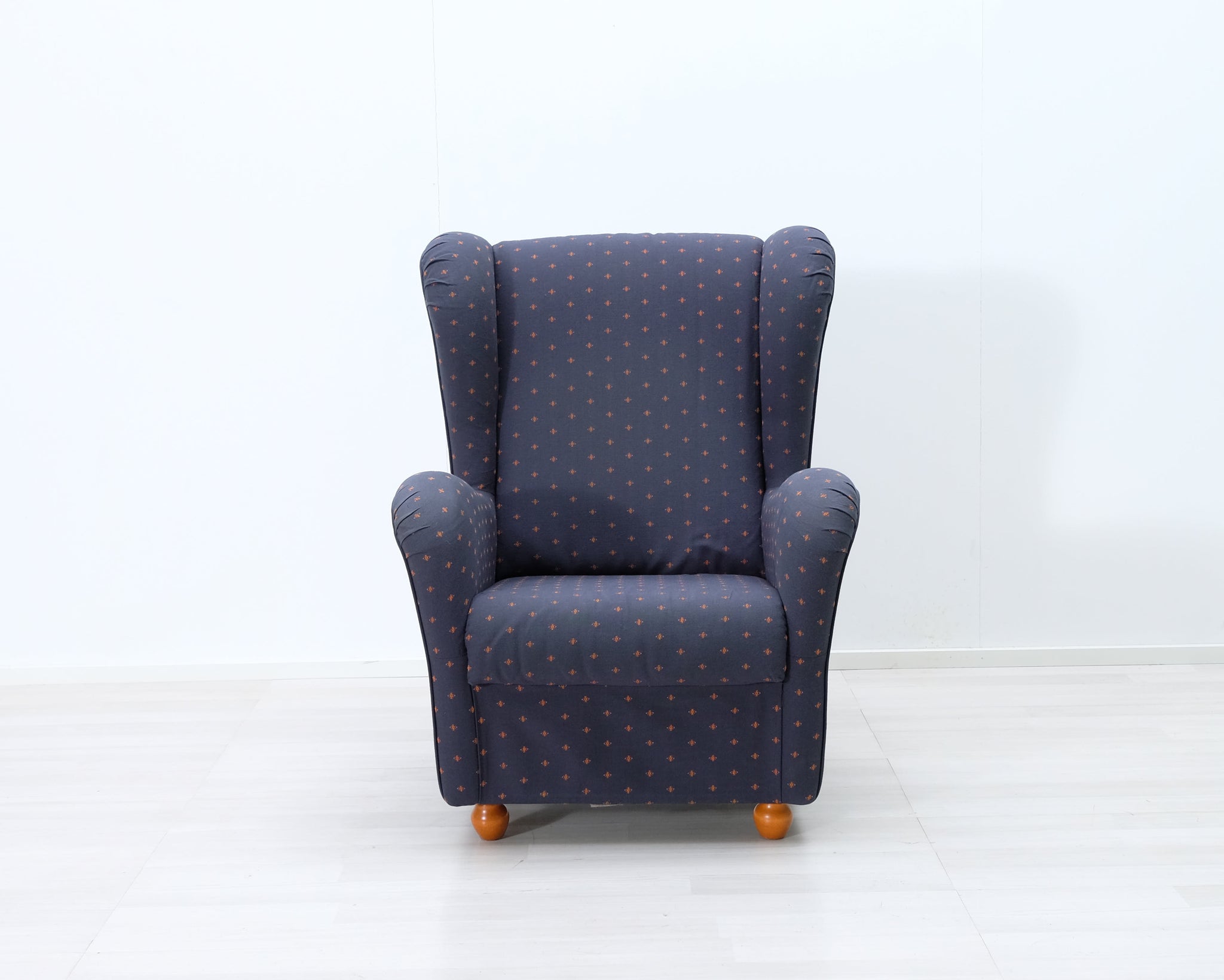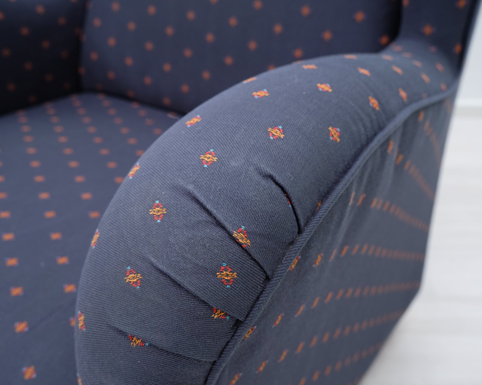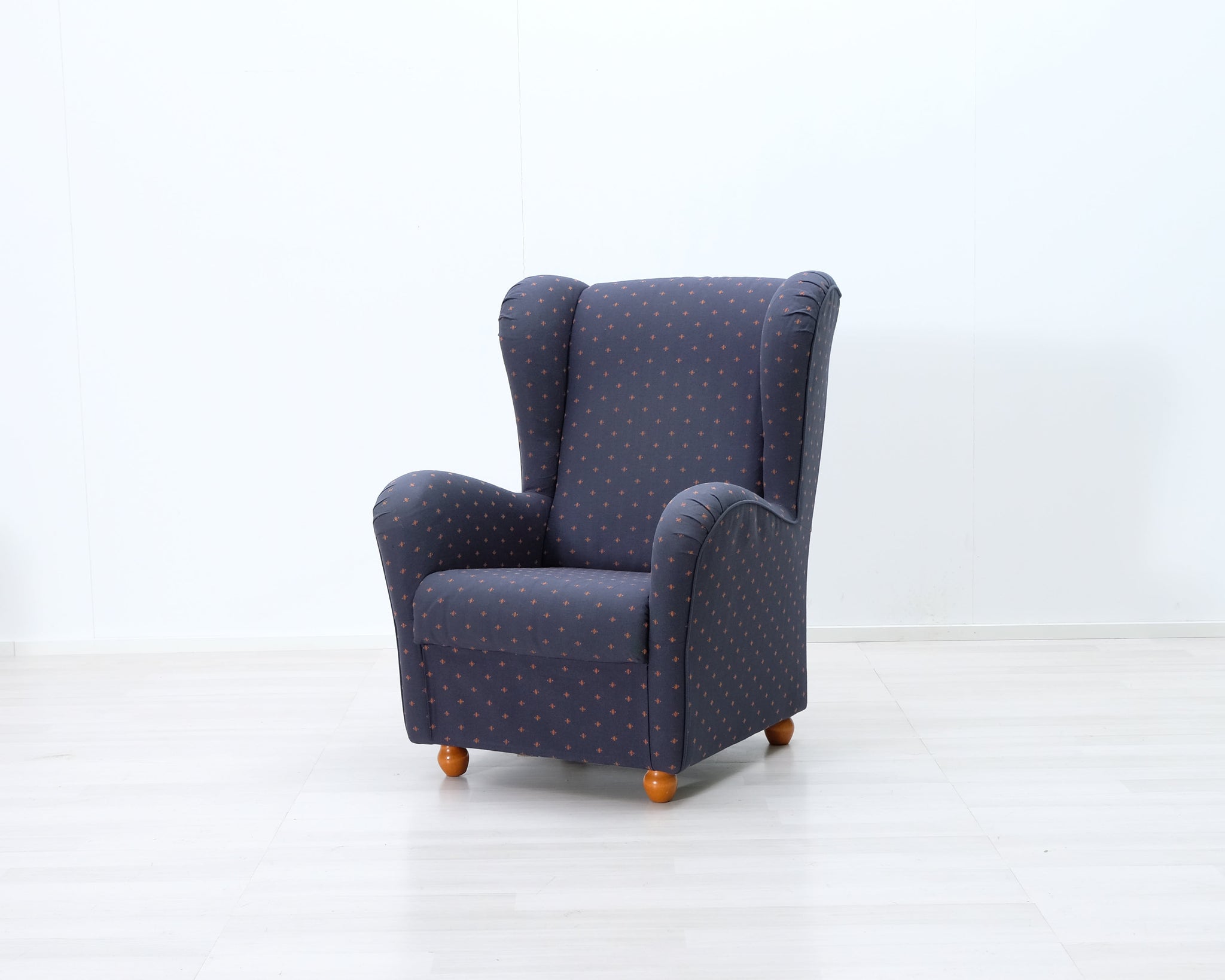 Sininen nojatuoli punaisilla pilkuilla. Puiset jalat.