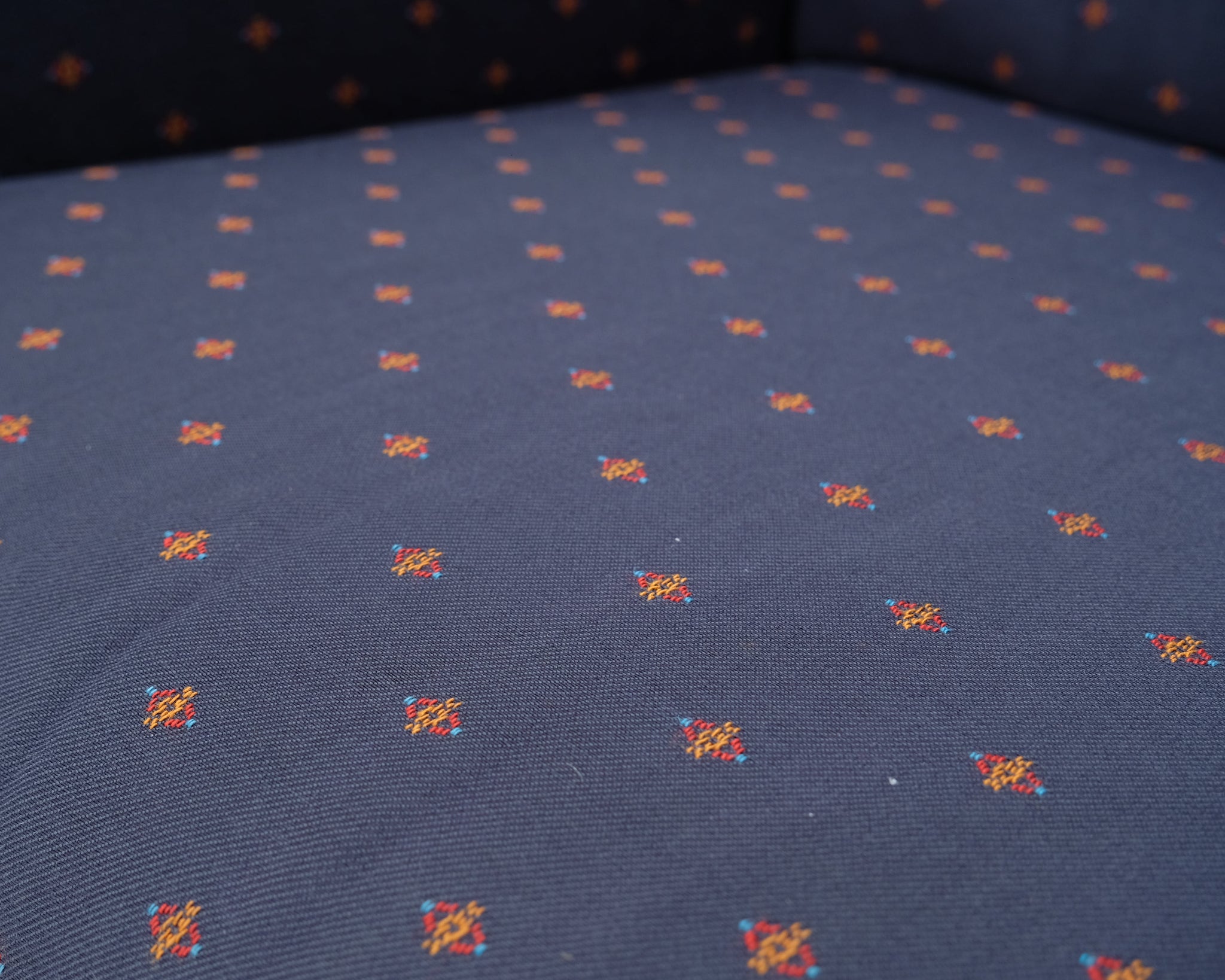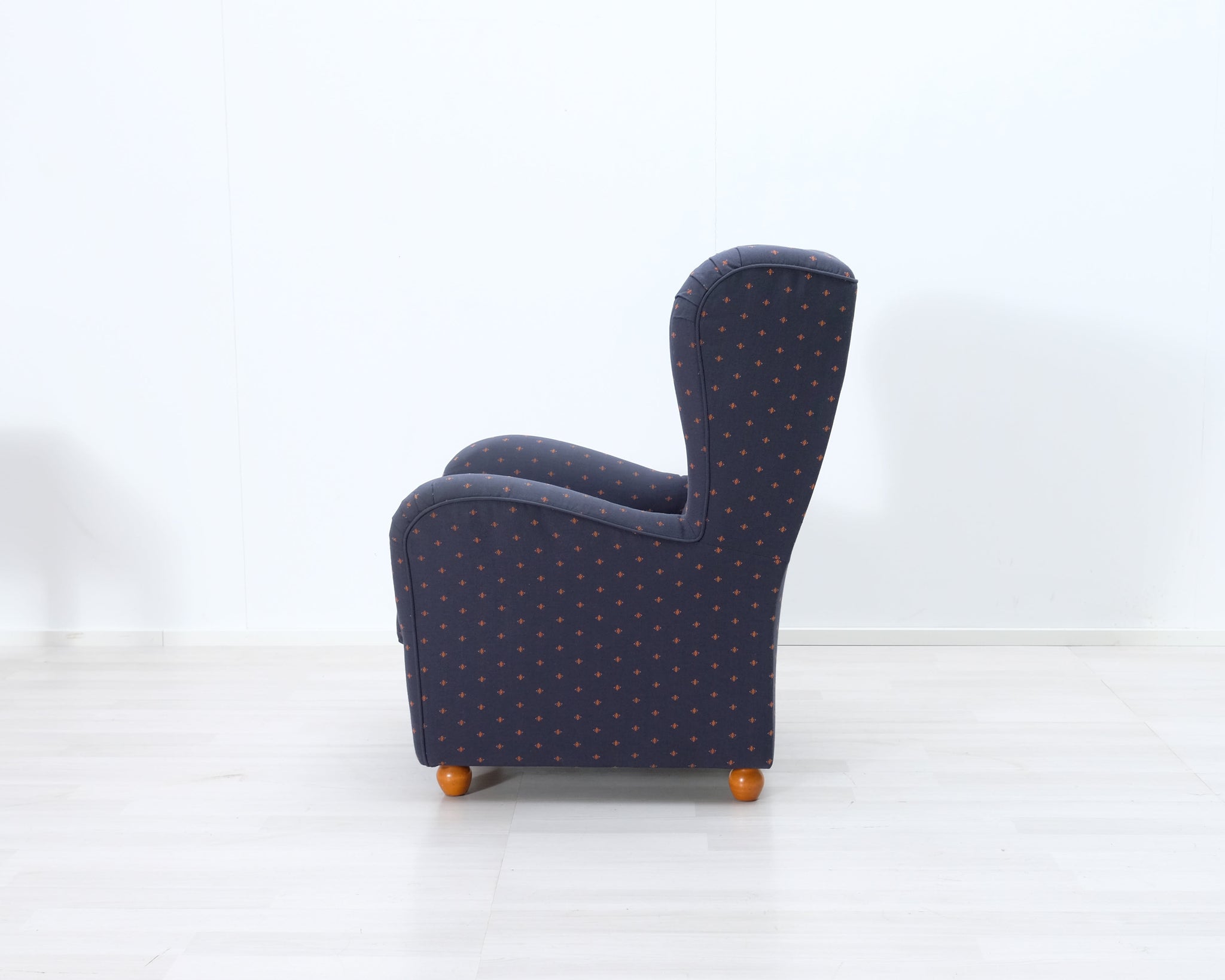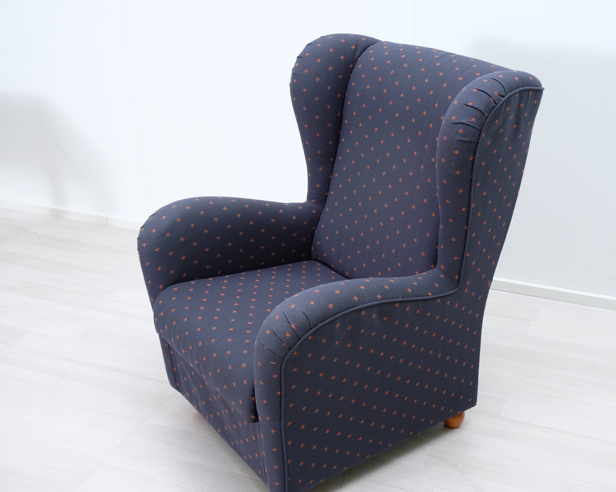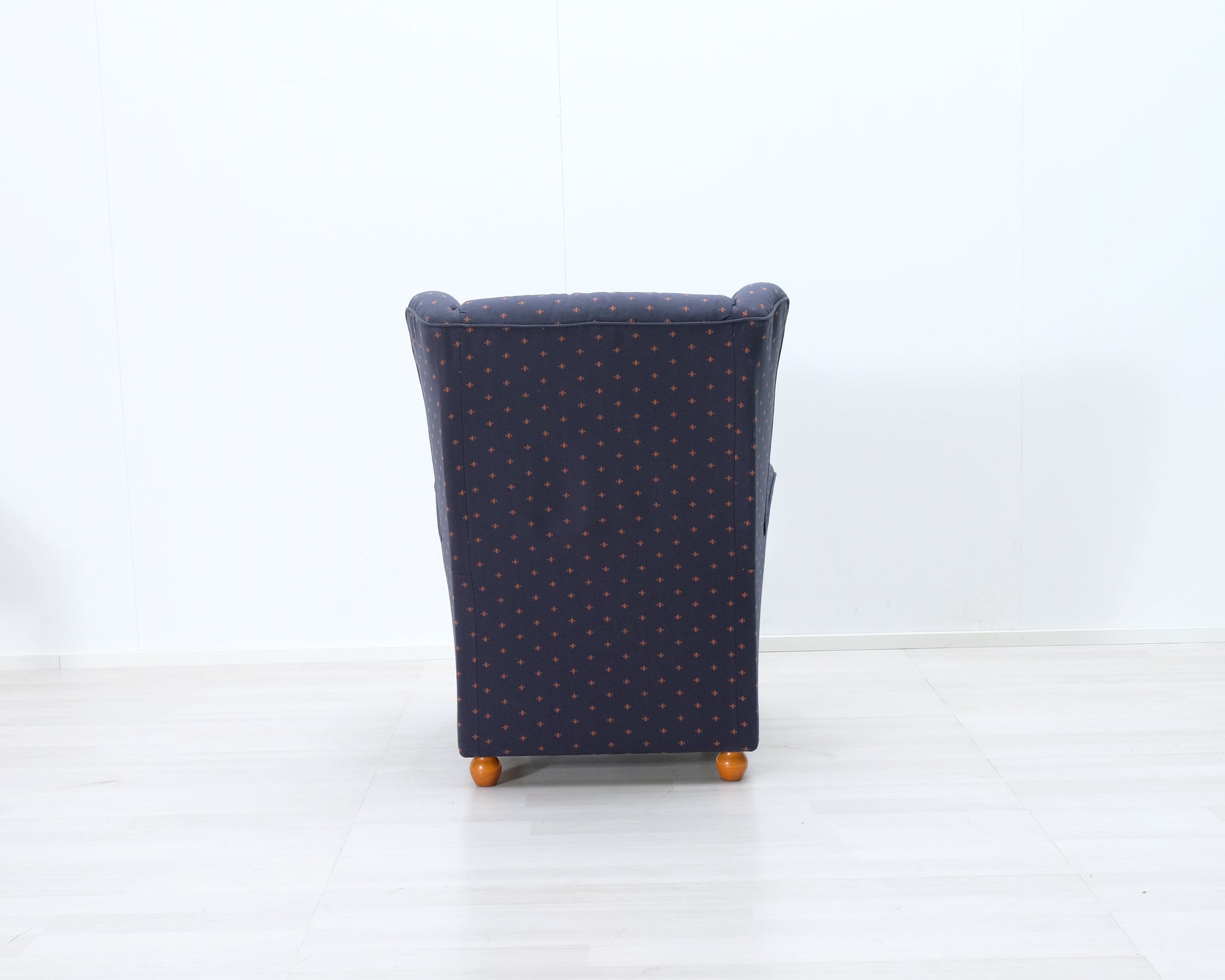 Sininen nojatuoli punaisilla pilkuilla. Puiset jalat.