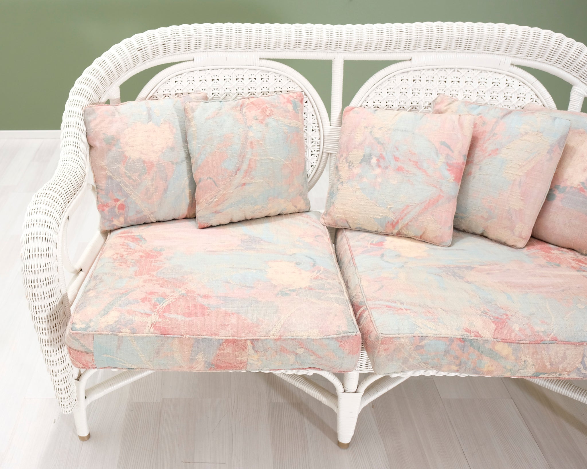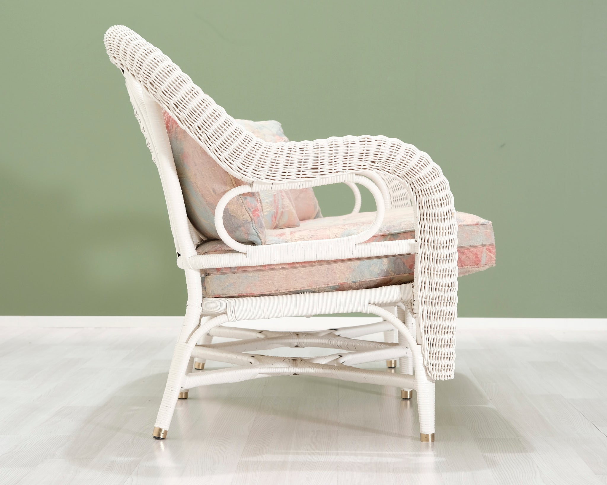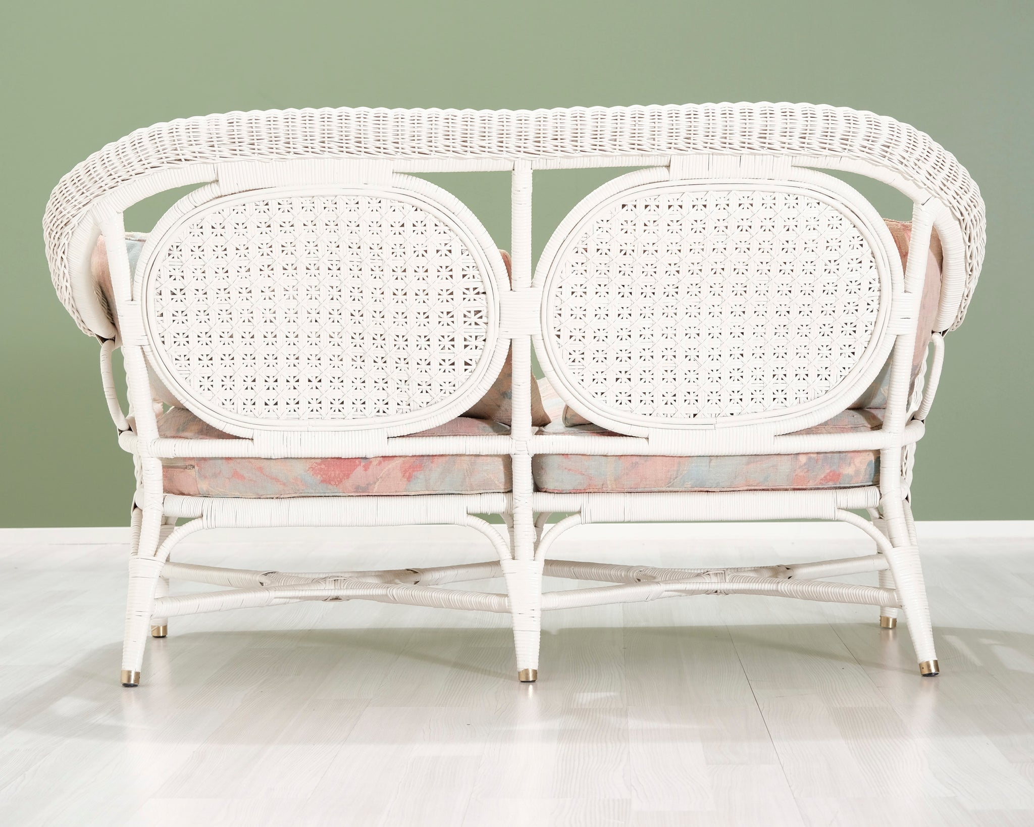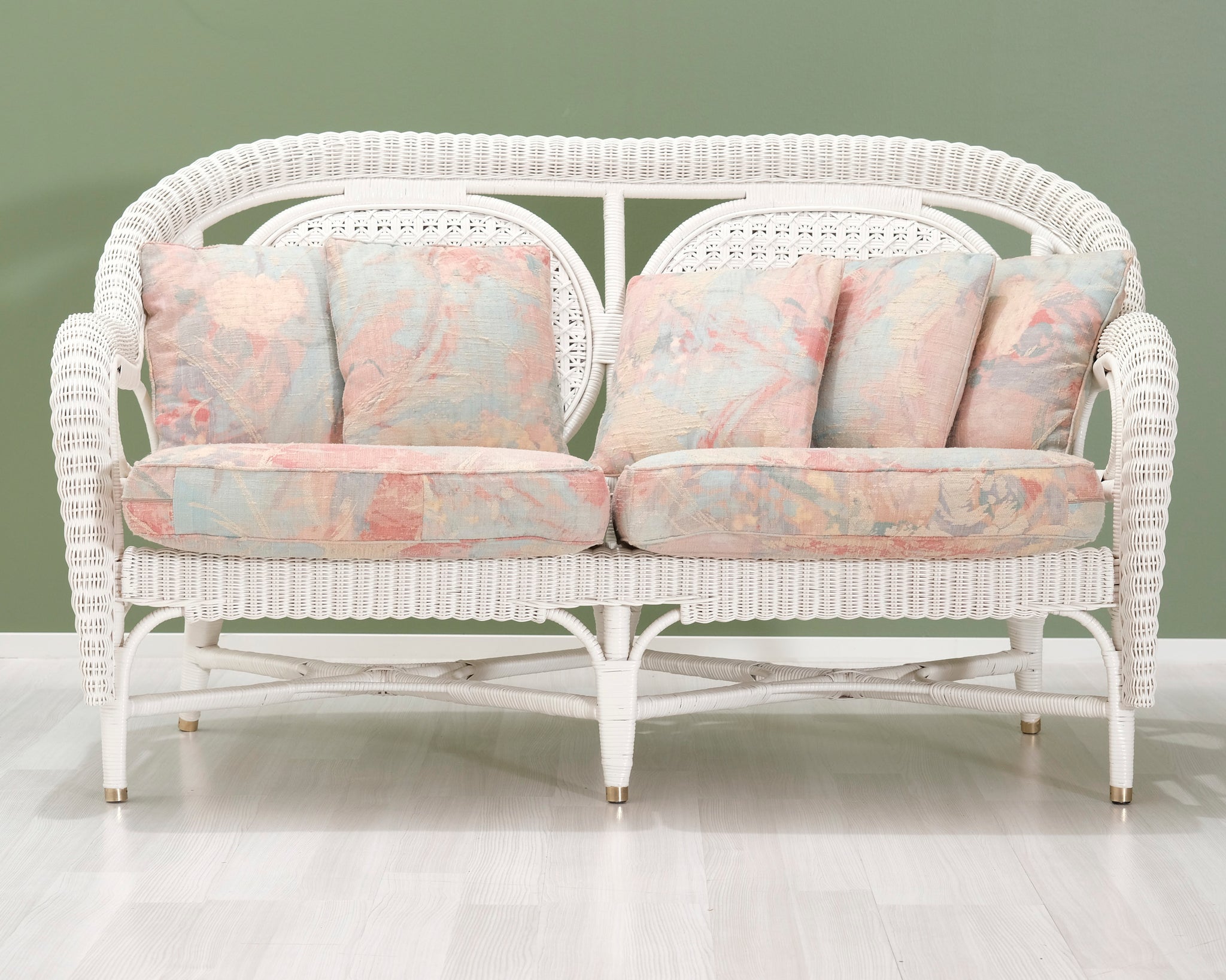 Kahden istuttava rottinkisohva. Valkoiseksi maalattu runko ja pastellisävyiset istuin- ja selkätyynyt.