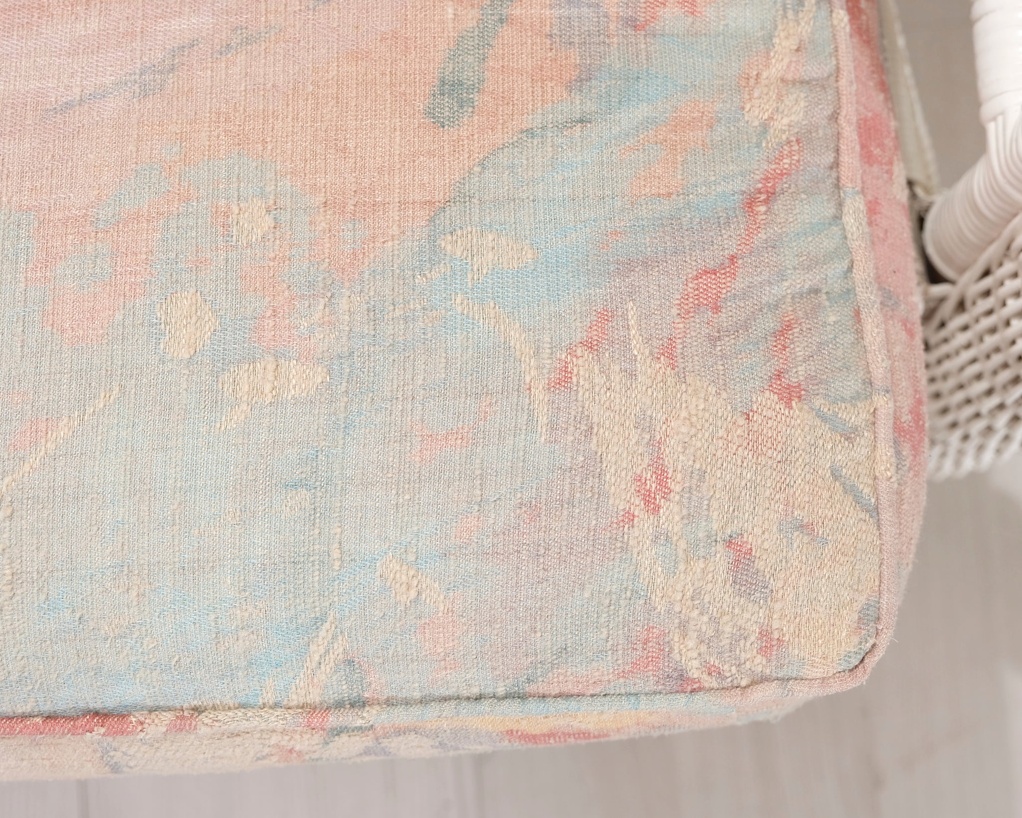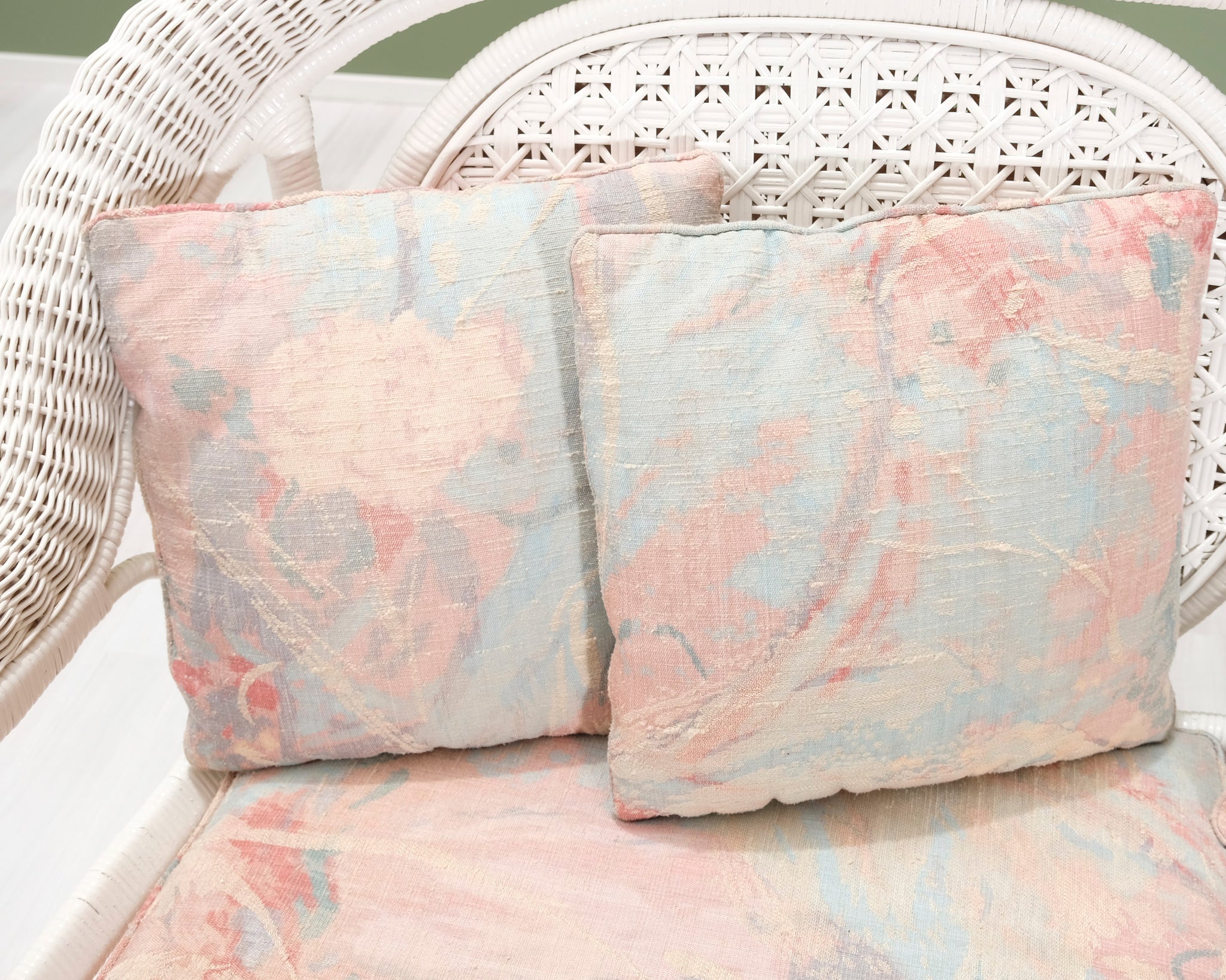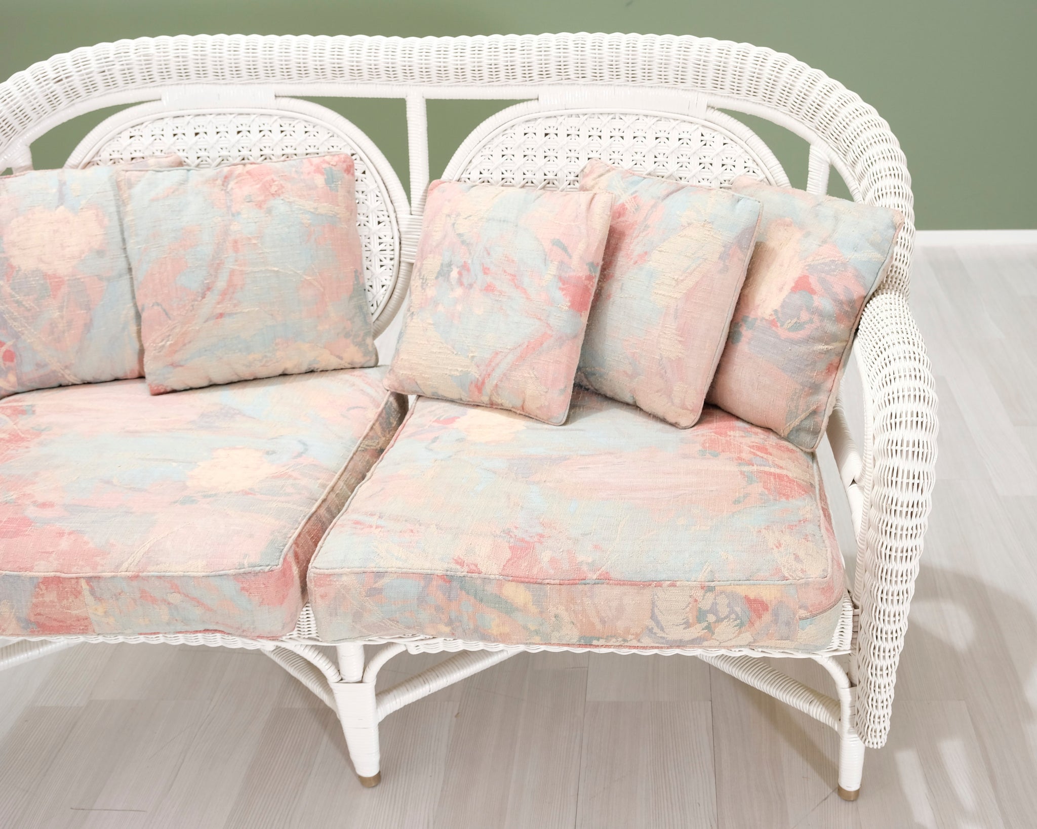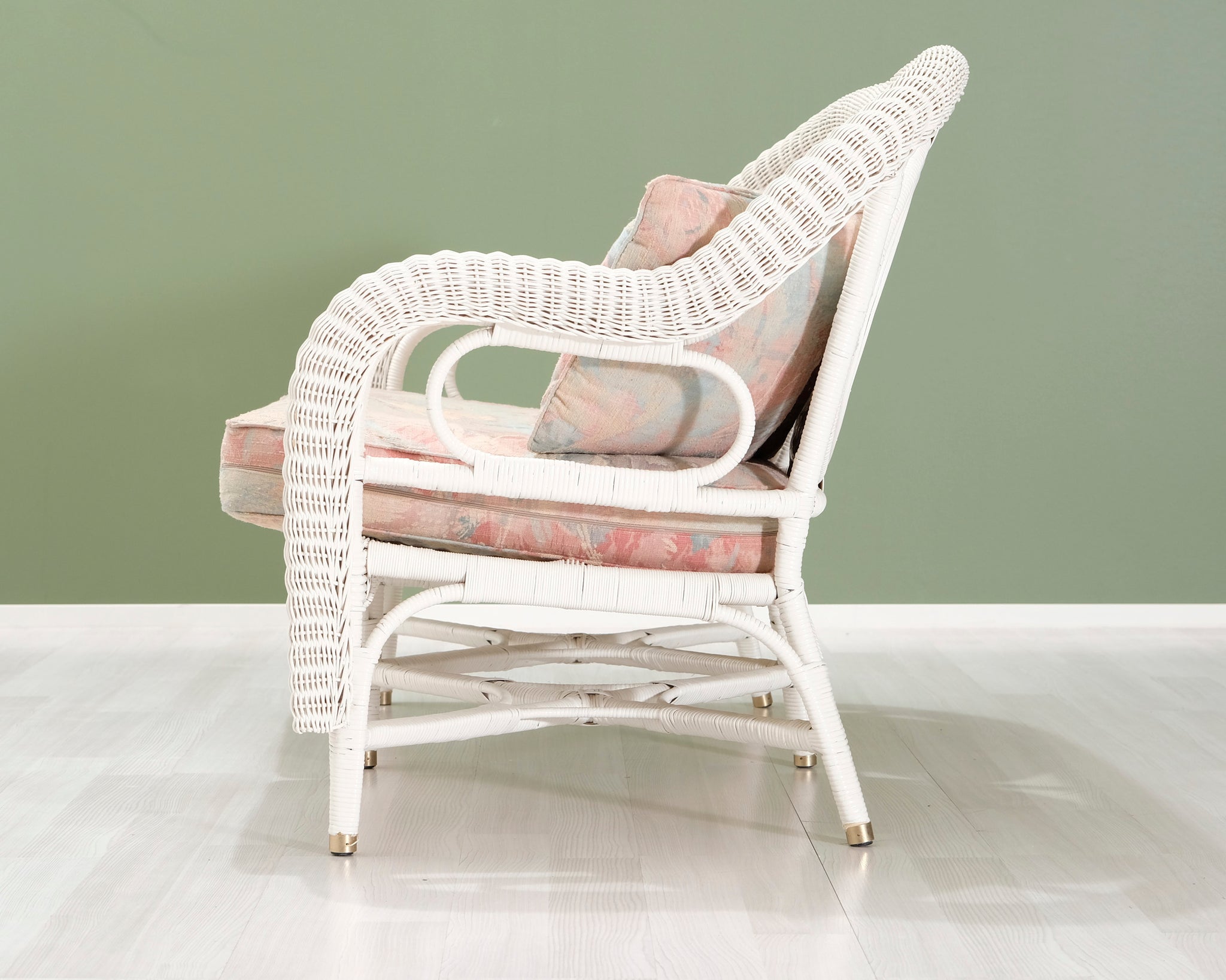 Kahden istuttava rottinkisohva. Valkoiseksi maalattu runko ja pastellisävyiset istuin- ja selkätyynyt.