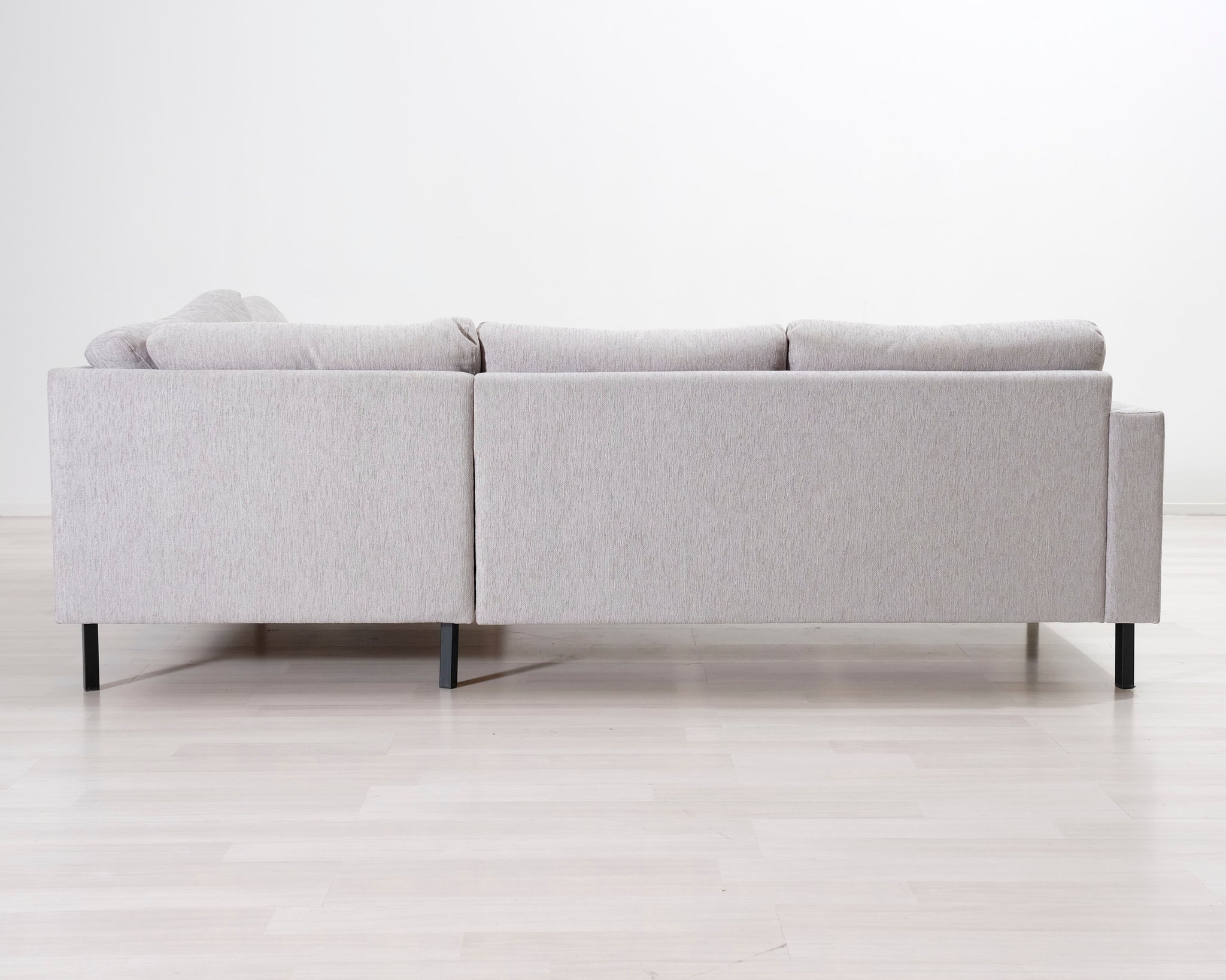 Neljän istuttava kulmasohva vaaleanharmaala kangasverhoilulla. Reilu avokulma antaa sohvalle rennon ulkomuodon. Istuin- ja selkätyynyjen päälliset ovat irrotettavat ja konepestävät.