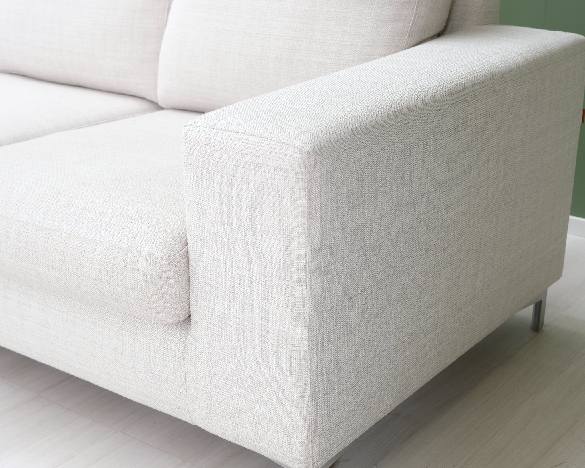 Askon valmistama kangassohva. Luonnonvalkoinen verhoilu ja metallijalat.
